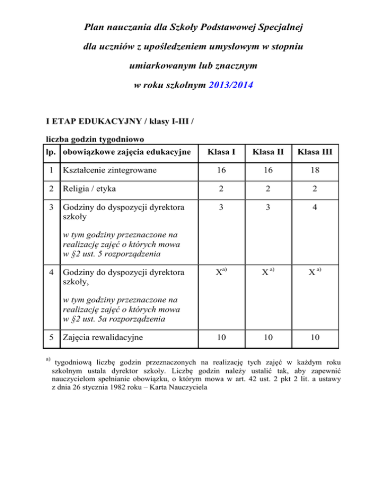 Plan nauczania dla Szkoły Podstawowej Specjalnej dla uczniów z