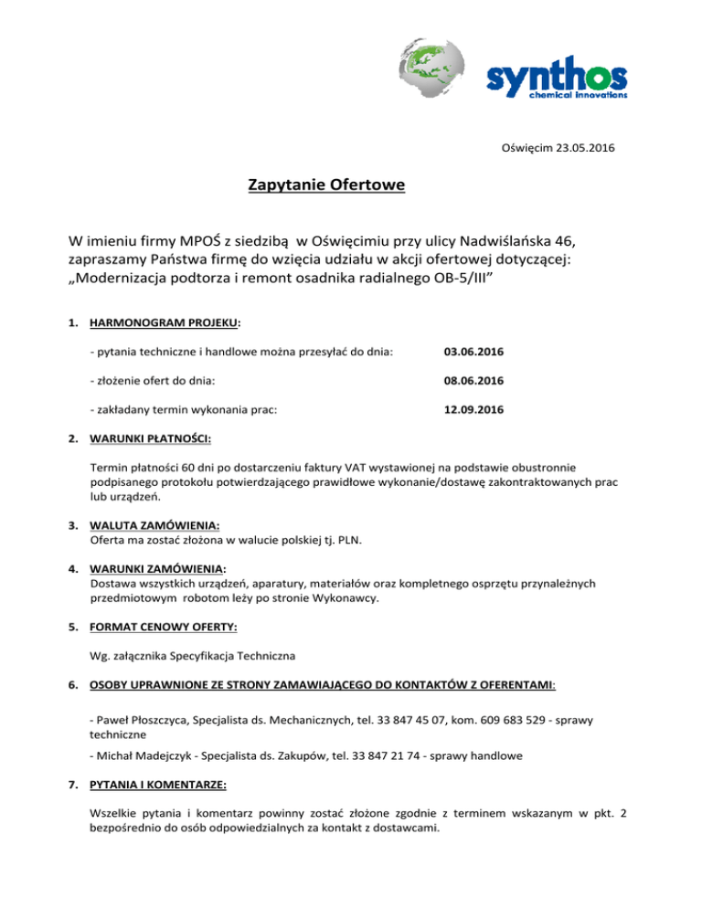Oświęcim 23.05.2016 Zapytanie Ofertowe W imieniu firmy MPOŚ z siedzibą w Oświęcimiu przy ulicy Nadwiślańska 46, zapraszamy Państwa firmę do wzięcia udziału w akcji ofertowej dotyczącej: „Modernizacja podtorza i remont osadnika radialnego OB-5/III” 1. HARMONOGRAM PROJEKU: - pytania techniczne i handlowe można przesyłać do dnia: 03.06.2016 - złożenie ofert do dnia: 08.06.2016 - zakładany termin wykonania prac: 12.09.2016 2. WARUNKI PŁATNOŚCI: Termin płatności 60 dni po dostarczeniu faktury VAT wystawionej na podstawie obustronnie podpisanego protokołu potwierdzającego prawidłowe wykonanie/dostawę zakontraktowanych prac lub urządzeń. 3. WALUTA ZAMÓWIENIA: Oferta ma zostać złożona w walucie polskiej tj. PLN. 4. WARUNKI ZAMÓWIENIA: Dostawa wszystkich urządzeń, aparatury, materiałów oraz kompletnego osprzętu przynależnych przedmiotowym robotom leży po stronie Wykonawcy. 5. FORMAT CENOWY OFERTY: Wg. załącznika Specyfikacja Techniczna 6. OSOBY UPRAWNIONE ZE STRONY ZAMAWIAJĄCEGO DO KONTAKTÓW Z OFERENTAMI: - Paweł Płoszczyca, Specjalista ds. Mechanicznych, tel. 33 847 45 07, kom. 609 683 529 - sprawy techniczne - Michał Madejczyk - Specjalista ds. Zakupów, tel. 33 847 21 74 - sprawy handlowe 7. PYTANIA I KOMENTARZE: Wszelkie pytania i komentarz powinny zostać złożone zgodnie z terminem wskazanym w pkt. 2 bezpośrednio do osób odpowiedzialnych za kontakt z dostawcami. 8. SKŁADANIE OFERT: Ofertę należy przesłać zgodnie z harmonogramem określonym w pkt.2 Zapytania Ofertowego w wersji elektronicznej na adres: [email protected] W przypadku opóźnienia w złożeniu oferty z winy składającego firma MPOŚ informuje że zgodnie z procedurami wewnętrznymi taka oferta może nie być brana pod uwagę. 9. WAŻNOŚĆ OFERTY: Oferta ma zostać złożona z minimum 90 dniowym terminem ważności 10. INFORMACJE DODATKOWE: Postępowanie ofertowe prowadzone będzie wg procedur wewnętrznych Zamawiającego. Po rozpatrzeniu ofert o decyzji Zamawiającego oferenci zostaną powiadomieni droga mailową. Umowa zostanie zawarta z wybranym kontrahentem. Koszt przygotowania oferty ponosi wyłącznie firma składająca ofertę Zamawiającemu przysługuje prawo do swobodnego wyboru oferty. Z tytułu nieuwzględnienia ofert, oferentom nie przysługują żadne roszczenia przeciwko Zamawiającemu. Zamawiający zastrzega sobie prawo do wnioskowania o dodatkowe informacje podczas oceny ofert złożonych przez firmy uczestniczące w przetargu. Zamawiający zastrzega sobie możliwość negocjacji z wybranym oferentem. 11. ZAŁĄCZNIKI: Poniższe załączniki stanowią integralną cześć zapytania ofertowego: a) Specyfikacja techniczna. b) Dokumentacja (Dyfuzor, Projekt nr 1014,Dylatacja, Kanał przelewowy, Krata rozdzielcza, Naprawa betonów i zabezpieczenie chemoodporne – Przekrój A-A, Naprawa betonów i zabezpieczenie chemoodporne - rzut, przelew regulowany, Rysunek 1 KW W H 25 1075 1 5 02, Schemat elektryczny ogrzewania bieżni, Wieniec żelbetowy - rzut i przekroje, zabezpieczenie antykorozyjne - rzut i przekroje)