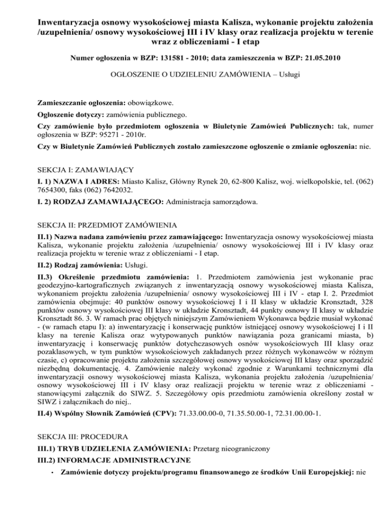 Inwentaryzacja osnowy wysokościowej miasta Kalisza, wykonanie projektu założenia /uzupełnienia/ osnowy wysokościowej III i IV klasy oraz realizacja projektu w terenie wraz z obliczeniami - I etap Numer ogłoszenia w BZP: 131581 - 2010; data zamieszczenia w BZP: 21.05.2010 OGŁOSZENIE O UDZIELENIU ZAMÓWIENIA – Usługi Zamieszczanie ogłoszenia: obowiązkowe. Ogłoszenie dotyczy: zamówienia publicznego. Czy zamówienie było przedmiotem ogłoszenia w Biuletynie Zamówień Publicznych: tak, numer ogłoszenia w BZP: 95271 - 2010r. Czy w Biuletynie Zamówień Publicznych zostało zamieszczone ogłoszenie o zmianie ogłoszenia: nie. SEKCJA I: ZAMAWIAJĄCY I. 1) NAZWA I ADRES: Miasto Kalisz, Główny Rynek 20, 62-800 Kalisz, woj. wielkopolskie, tel. (062) 7654300, faks (062) 7642032. I. 2) RODZAJ ZAMAWIAJĄCEGO: Administracja samorządowa. SEKCJA II: PRZEDMIOT ZAMÓWIENIA II.1) Nazwa nadana zamówieniu przez zamawiającego: Inwentaryzacja osnowy wysokościowej miasta Kalisza, wykonanie projektu założenia /uzupełnienia/ osnowy wysokościowej III i IV klasy oraz realizacja projektu w terenie wraz z obliczeniami - I etap. II.2) Rodzaj zamówienia: Usługi. II.3) Określenie przedmiotu zamówienia: 1. Przedmiotem zamówienia jest wykonanie prac geodezyjno-kartograficznych związanych z inwentaryzacją osnowy wysokościowej miasta Kalisza, wykonaniem projektu założenia /uzupełnienia/ osnowy wysokościowej III i IV - etap I. 2. Przedmiot zamówienia obejmuje: 40 punktów osnowy wysokościowej I i II klasy w układzie Kronsztadt, 328 punktów osnowy wysokościowej III klasy w układzie Kronsztadt, 44 punkty osnowy II klasy w układzie Kronsztadt 86. 3. W ramach prac objętych niniejszym Zamówieniem Wykonawca będzie musiał wykonać - (w ramach etapu I): a) inwentaryzację i konserwację punktów istniejącej osnowy wysokościowej I i II klasy na terenie Kalisza oraz wytypowanych punktów nawiązania poza granicami miasta, b) inwentaryzację i konserwację punktów dotychczasowych osnów wysokościowych III klasy oraz pozaklasowych, w tym punktów wysokościowych zakładanych przez różnych wykonawców w różnym czasie, c) opracowanie projektu założenia szczegółowej osnowy wysokościowej III klasy oraz sporządzić niezbędną dokumentację. 4. Zamówienie należy wykonać zgodnie z Warunkami technicznymi dla inwentaryzacji osnowy wysokościowej miasta Kalisza, wykonania projektu założenia /uzupełnienia/ osnowy wysokościowej III i IV klasy oraz realizacji projektu w terenie wraz z obliczeniami stanowiącymi załącznik do SIWZ. 5. Szczegółowy opis przedmiotu zamówienia określony został w SIWZ i załącznikach do niej.. II.4) Wspólny Słownik Zamówień (CPV): 71.33.00.00-0, 71.35.50.00-1, 72.31.00.00-1. SEKCJA III: PROCEDURA III.1) TRYB UDZIELENIA ZAMÓWIENIA: Przetarg nieograniczony III.2) INFORMACJE ADMINISTRACYJNE • Zamówienie dotyczy projektu/programu finansowanego ze środków Unii Europejskiej: nie SEKCJA IV: UDZIELENIE ZAMÓWIENIA IV.1) DATA UDZIELENIA ZAMÓWIENIA: 20.05.2010. IV.2) LICZBA OTRZYMANYCH OFERT: 4. IV.3) LICZBA ODRZUCONYCH OFERT: 0. IV.4) NAZWA I ADRES WYKONAWCY, KTÓREMU UDZIELONO ZAMÓWIENIA: • GEODEZJA I PROJEKTY Firma Geodezyjno-Projektowa Biuro Obsługi Inwestycji Monika Słysz, ul. Mickiewicza 7a, 72-400 Kamień Pomorski, kraj/woj. zachodniopomorskie. IV.5) Szacunkowa wartość zamówienia (bez VAT): 151400,00 PLN. IV.6) INFORMACJA O CENIE WYBRANEJ OFERTY ORAZ O OFERTACH Z NAJNIŻSZĄ I NAJWYŻSZĄ CENĄ • Cena wybranej oferty: 58560,00 • Oferta z najniższą ceną: 58560,00 / Oferta z najwyższą ceną: 79300,00 • Waluta: PLN.