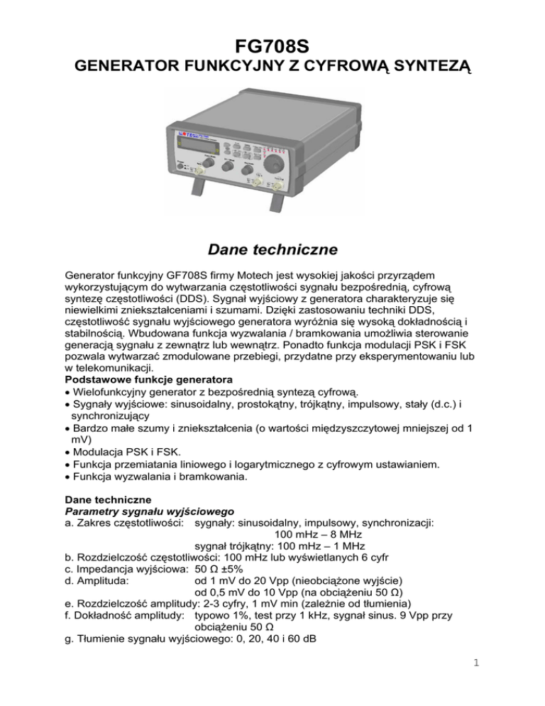 FG708S GENERATOR FUNKCYJNY Z CYFROWĄ SYNTEZĄ Dane techniczne Generator funkcyjny GF708S firmy Motech jest wysokiej jakości przyrządem wykorzystującym do wytwarzania częstotliwości sygnału bezpośrednią, cyfrową syntezę częstotliwości (DDS). Sygnał wyjściowy z generatora charakteryzuje się niewielkimi zniekształceniami i szumami. Dzięki zastosowaniu techniki DDS, częstotliwość sygnału wyjściowego generatora wyróżnia się wysoką dokładnością i stabilnością. Wbudowana funkcja wyzwalania / bramkowania umożliwia sterowanie generacją sygnału z zewnątrz lub wewnątrz. Ponadto funkcja modulacji PSK i FSK pozwala wytwarzać zmodulowane przebiegi, przydatne przy eksperymentowaniu lub w telekomunikacji. Podstawowe funkcje generatora • Wielofunkcyjny generator z bezpośrednią syntezą cyfrową. • Sygnały wyjściowe: sinusoidalny, prostokątny, trójkątny, impulsowy, stały (d.c.) i synchronizujący • Bardzo małe szumy i zniekształcenia (o wartości międzyszczytowej mniejszej od 1 mV) • Modulacja PSK i FSK. • Funkcja przemiatania liniowego i logarytmicznego z cyfrowym ustawianiem. • Funkcja wyzwalania i bramkowania. Dane techniczne Parametry sygnału wyjściowego a. Zakres częstotliwości: sygnały: sinusoidalny, impulsowy, synchronizacji: 100 mHz – 8 MHz sygnał trójkątny: 100 mHz – 1 MHz b. Rozdzielczość częstotliwości: 100 mHz lub wyświetlanych 6 cyfr c. Impedancja wyjściowa: 50 Ω ±5% d. Amplituda: od 1 mV do 20 Vpp (nieobciążone wyjście) od 0,5 mV do 10 Vpp (na obciążeniu 50 Ω) e. Rozdzielczość amplitudy: 2-3 cyfry, 1 mV min (zależnie od tłumienia) f. Dokładność amplitudy: typowo 1%, test przy 1 kHz, sygnał sinus. 9 Vpp przy obciążeniu 50 Ω g. Tłumienie sygnału wyjściowego: 0, 20, 40 i 60 dB 1 h. Zabezpieczenie wyjścia sygnałowego (FUNC_OUT): zabezpieczenie przed zwarciem, zabezpieczenie przed zamianą polaryzacji napięcia poniżej 20 Vp i. Wyjście d.c. offset i d.c. ±10 V przy nieobciążonym wyjściu, ±5 V przy obciążeniu 50 Ω j. Rozdzielczość sygnału wyjściowego d.c.: 2 cyfry, ±1 mV min (zależnie od tłumienia) k. Dokładność sygnału wyjściowego d.c.: 1% ±5 cyfr l. Zniekształcenia harmoniczne sygnału sinusoidalnego: d.c. – 100 kHz: < 55 dBc (typowo) 100 kHz – 1 MHz: < 45 dBc (typowo) 1 MHz – 8 MHz: -55 dBc (typowo) m. Zniekształcenia nieharmoniczne: d.c. – 100 kHz: <0,3% o. Sygnał prostokątny: czas narastania / opadania ≤12 ns dla 10 Vpp, przy obc. 50 Ω wyskok napięcia <0,5% Vp dla 10 Vpp, przy obc. 50 Ω p. Sygnał impulsowy: zakres częstotliwości: 100 mHz – 8 MHz amplituda: 0 – 10 V / 0 – 10 V / ±10 V współczynnik wypełnienia: 100 mHz – 6 MHz: 20% - 10% 6 MHz – 8 MHz: 40% - 60% q. Liniowość przebiegu trójkątnego: 99% w zakresie do 100 kHz r. Przemiatanie (liniowe / logarytmiczne): ustawianie: częstotliwości startu, częstotliwości stopu oraz kroku przemiatania typ przemiatania: w górę, w dół, w górę – w dół s. Wyjście sygnału synchronizacji: zakres częstotliwości: 100 mHz – 8 MHz poziom wyjściowy: poziom niski ≤ 0,6 V na 50 Ω poziom wysoki ≥ 1 V na 50 Ω impedancja wyjściowa: 50 Ω Parametry modulacji a. FSK: funkcja: sygnał sinusoidalny, prostokątny lub trójkątny zakres częstotliwości: 100mHz – 8 MHz szybkość wewnętrzna: 400 Hz / 1000 Hz źródło: wewnętrzne / zewnętrzne b. PSK: funkcja: sygnał sinusoidalny, prostokątny lub trójkątny zakres częstotliwości: 100 mHz – 8 MHz ustawianie fazy: od 0,0000 do 360,0 stopni szybkość wewnętrzna: 400 Hz / 1000 Hz źródło: wewnętrzne / zewnętrzne Parametry wyzwalania / bramkowania a. Wyzwalanie: źródło: ręczne (naciśnięcie pokrętła) / zewnętrzne ustawianie częstotliwości głównej: 100 mHz – 100 kHz b. Bramkowanie: źródło: ręczne (naciśnięcie pokrętła) / zewnętrzne ustawienie częstotliwości głównej: 100 mHz – 8 MHz Parametry ogólne a. Źródło zasilania: 115 V/230 V a.c. (przełączane wewnętrznie), ±10%, 50/60 Hz b. Temperatura: od 0˚C do +40˚C (praca) od –20˚C do +70˚C (składowanie) c. Wilgotność względna: nie większa niż 80% d. Rozmiary (dł. x szer. x wys.): 280 x 235 x 80 [mm] e. Masa: 3 kg f. Akcesoria: przewód sieciowy 1 szt. instrukcja obsługi 1 szt. 2