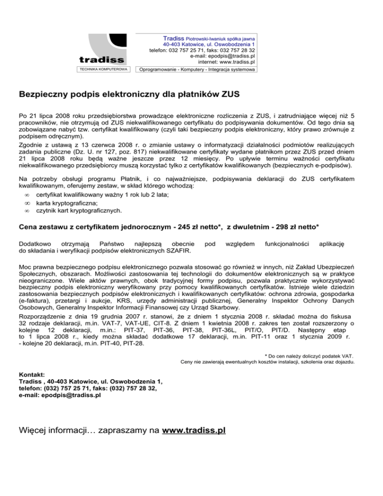 Tradiss Piotrowski-Iwaniuk spółka jawna 40-403 Katowice, ul. Oswobodzenia 1 telefon: 032 757 25 71, faks: 032 757 28 32 e-mail: [email protected] internet: www.tradiss.pl TECHNIKA KOMPUTEROWA Oprogramowanie - Komputery - Integracja systemowa Bezpieczny podpis elektroniczny dla płatników ZUS Po 21 lipca 2008 roku przedsiębiorstwa prowadzące elektroniczne rozliczenia z ZUS, i zatrudniające więcej niż 5 pracowników, nie otrzymują od ZUS niekwalifikowanego certyfikatu do podpisywania dokumentów. Od tego dnia są zobowiązane nabyć tzw. certyfikat kwalifikowany (czyli taki bezpieczny podpis elektroniczny, który prawo zrównuje z podpisem odręcznym). Zgodnie z ustawą z 13 czerwca 2008 r. o zmianie ustawy o informatyzacji działalności podmiotów realizujących zadania publiczne (Dz. U. nr 127, poz. 817) niekwalifikowane certyfikaty wydane płatnikom przez ZUS przed dniem 21 lipca 2008 roku będą ważne jeszcze przez 12 miesięcy. Po upływie terminu ważności certyfikatu niekwalifikowanego przedsiębiorcy muszą korzystać tylko z certyfikatów kwalifikowanych (bezpiecznych e-podpisów). Na potrzeby obsługi programu Płatnik, i co najważniejsze, podpisywania deklaracji do ZUS certyfikatem kwalifikowanym, oferujemy zestaw, w skład którego wchodzą: • • • certyfikat kwalifikowany ważny 1 rok lub 2 lata; karta kryptograficzna; czytnik kart kryptograficznych. Cena zestawu z certyfikatem jednorocznym - 245 zł netto*, z dwuletnim - 298 zł netto* Dodatkowo otrzymają Państwo najlepszą obecnie do składania i weryfikacji podpisów elektronicznych SZAFIR. pod względem funkcjonalności aplikację Moc prawna bezpiecznego podpisu elektronicznego pozwala stosować go również w innych, niż Zakład Ubezpieczeń Społecznych, obszarach. Możliwości zastosowania tej technologii do dokumentów elektronicznych są w praktyce nieograniczone. Wiele aktów prawnych, obok tradycyjnej formy podpisu, pozwala praktycznie wykorzystywać bezpieczny podpis elektroniczny weryfikowany przy pomocy kwalifikowanych certyfikatów. Istnieje wiele dziedzin zastosowania bezpiecznych podpisów elektronicznych i kwalifikowanych certyfikatów: ochrona zdrowia, gospodarka (e-faktura), przetargi i aukcje, KRS, urzędy administracji publicznej, Generalny Inspektor Ochrony Danych Osobowych, Generalny Inspektor Informacji Finansowej czy Urząd Skarbowy. Rozporządzenie z dnia 19 grudnia 2007 r. stanowi, że z dniem 1 stycznia 2008 r. składać można do fiskusa 32 rodzaje deklaracji, m.in. VAT-7, VAT-UE, CIT-8. Z dniem 1 kwietnia 2008 r. zakres ten został rozszerzony o kolejne 12 deklaracji, m.in.: PIT-37, PIT-36, PIT-38, PIT-36L, PIT/O, PIT/D. Następny etap to 1 lipca 2008 r., kiedy można składać dodatkowe 17 deklaracji, m.in. PIT-11 oraz 1 stycznia 2009 r. - kolejne 20 deklaracji, m.in. PIT-40, PIT-28. * Do cen należy doliczyć podatek VAT. Ceny nie zawierają ewentualnych kosztów instalacji, szkolenia oraz dojazdu. Kontakt: Tradiss , 40-403 Katowice, ul. Oswobodzenia 1, telefon: (032) 757 25 71, faks: (032) 757 28 32, e-mail: [email protected] Więcej informacji… zapraszamy na www.tradiss.pl Tradiss Piotrowski-Iwaniuk spółka jawna 40-403 Katowice, ul. Oswobodzenia 1 telefon: 032 757 25 71, faks: 032 757 28 32 e-mail: [email protected] internet: www.tradiss.pl TECHNIKA KOMPUTEROWA Oprogramowanie - Komputery - Integracja systemowa Podpis elektroniczny – Informacja ogólna e-podpis czyli podpis elektroniczny to techniczny sposób potwierdzania autentyczności dokumentu i tożsamości nadawcy na dokumencie przesyłanym drogą elektroniczną. Istnieją dwa rodzaje podpisów elektronicznych: zwykły i bezpieczny. Bezpieczny podpis elektroniczny weryfikowany za pomocą ważnego kwalifikowanego certyfikatu ma, zgodnie z ustawą, moc prawną taką samą, jak podpis odręczny. Zwykły podpis elektroniczny jest wiążący prawnie jedynie na podstawie umów cywilnych pomiędzy podmiotami je stosującymi i jest używany wówczas, jeżeli prawo nie wymaga dla danej czynności formy pisemnej. Tak więc, nie powinno się odmawiać zwykłemu podpisowi skuteczności prawnej czyli traktowania go jako dowodu.. Podstawowe właściwości podpisu elektronicznego: • Unikalność - każdy elektroniczny dokument posiada unikalny podpis cyfrowy ściśle z nim związany. • Integralność - jakakolwiek zmiana dokumentu podpisanego cyfrowo zostanie natychmiast wykryta w momencie weryfikacji podpisu. • Niezaprzeczalność - tylko osoba posiadająca klucz prywatny korespondujący z kluczem publicznym wykorzystanym do weryfikacji podpisu mogła wygenerować podpis pod dokumentem. Certyfikat kwalifikowany jest wystawiony przez urząd certyfikacyjny, który znajduje się na liście Ministra Gospodarki. Certyfikat kwalifikowany to certyfikat klucza publicznego zgodny z wymaganiami określonymi w Ustawie o podpisie elektronicznym z 18 września 2001 roku. Certyfikat jest to plik, podpisany cyfrowo przez podmiot świadczący usługi certyfikacyjne, który zawiera dane o właścicielu certyfikatu, jego klucz publiczny oraz informacje, kto wystawił ten certyfikat, a tym samym poświadcza prawdziwość zawartych w nim danych. Konstrukcja podpisu elektronicznego wykorzystuje technikę szyfrowania z kluczem publicznym. Podstawą działania szyfrów z kluczem publicznym są dwa klucze: klucz prywatny oraz klucz publiczny. Tak, jak wskazują nazwy kluczy, klucz publiczny jest udostępniany wszystkim osobom, z którymi kontaktuje się dana osoba, zaś klucz prywatny, dla zachowania bezpieczeństwa systemu, musi pozostać pod wyłączną kontrolą jego właściciela. Istotną własnością wymienionych kluczy jest to, iż praktycznie niemożliwe jest odgadnięcie klucza prywatnego na podstawie znajomości klucza publicznego. Własność ta gwarantuje, iż podpisany dokument, który został poprawnie zweryfikowany kluczem publicznym mógł być stworzony tylko przez posiadacza klucza prywatnego. Bezpieczny podpis elektronicz