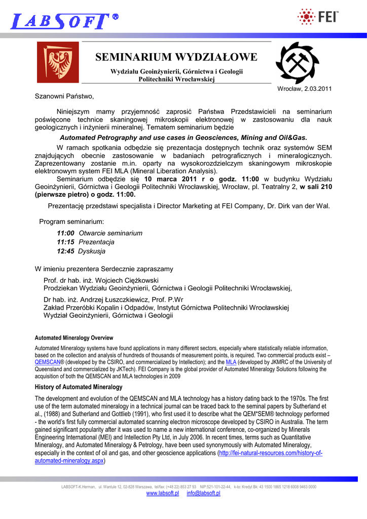 SEMINARIUM WYDZIAŁOWE Wydziału GeoinŜynierii, Górnictwa i Geologii Politechniki Wrocławskiej Wrocław, 2.03.2011 Szanowni Państwo, Niniejszym mamy przyjemność zaprosić Państwa Przedstawicieli na seminarium poświęcone technice skaningowej mikroskopii elektronowej w zastosowaniu dla nauk geologicznych i inŜynierii mineralnej. Tematem seminarium będzie Automated Petrography and use cases in Geosciences, Mining and Oil&Gas. W ramach spotkania odbędzie się prezentacja dostępnych technik oraz systemów SEM znajdujących obecnie zastosowanie w badaniach petrograficznych i mineralogicznych. Zaprezentowany zostanie m.in. oparty na wysokorozdzielczym skaningowym mikroskopie elektronowym system FEI MLA (Mineral Liberation Analysis). Seminarium odbędzie się 10 marca 2011 r o godz. 11:00 w budynku Wydziału GeoinŜynierii, Górnictwa i Geologii Politechniki Wrocławskiej, Wrocław, pl. Teatralny 2, w sali 210 (pierwsze pietro) o godz. 11:00. Prezentację przedstawi specjalista i Director Marketing at FEI Company, Dr. Dirk van der Wal. Program seminarium: 11:00 Otwarcie seminarium 11:15 Prezentacja 12:45 Dyskusja W imieniu prezentera Serdecznie zapraszamy Prof. dr hab. inŜ. Wojciech CięŜkowski Prodziekan Wydziału GeoinŜynierii, Górnictwa i Geologii Politechniki Wrocławskiej, Dr hab. inŜ. Andrzej Łuszczkiewicz, Prof. P.Wr Zakład Przeróbki Kopalin i Odpadów, Instytut Górnictwa Politechniki Wrocławskiej Wydział GeoinŜynierii, Górnictwa i Geologii Automated Mineralogy Overview Automated Mineralogy systems have found applications in many different sectors, especially where statistically reliable information, based on the collection and analysis of hundreds of thousands of measurement points, is required. Two commercial products exist – QEMSCAN® (developed by the CSIRO, and commercialized by Intellection); and the MLA (developed by JKMRC of the University of Queensland and commercialized by JKTech). FEI Company is the global provider of Automated Mineralogy Solutions following the acquisition of both the QEMSCAN and MLA technologies in 2009 History of Automated Mineralogy The development and evolution of the QEMSCAN and MLA technology has a history dating back to the 1970s. The first use of the term automated mineralogy in a technical journal can be traced back to the seminal papers by Sutherland et al., (1988) and Sutherland and Gottlieb (1991), who first used it to describe what the QEM*SEM® technology performed - the world’s first fully commercial automated scanning electron microscope developed by CSIRO in Australia. The term gained significant popularity after it was used to name a new international conference, co-organized by Minerals Engineering International (MEI) and Intellection Pty Ltd, in July 2006. In recent times, terms such as Quantitative Mineralogy, and Automated Mineralogy & Petrology, have been used synonymously with Automated Mineralogy, especially in the context of oil and gas, and other geoscience applications (http://fei-natural-resources.com/history-ofautomated-mineralogy.aspx) LABSOFT-K.Herman, ul. Wantule 12, 02-828 Warszawa, tel/fax: (+48 22) 853 27 93 NIP:521-101-22-44, k-to: Kredyt Bk: 43 1500 1865 1218 6008 9463 0000 www.labsoft.pl [email protected]