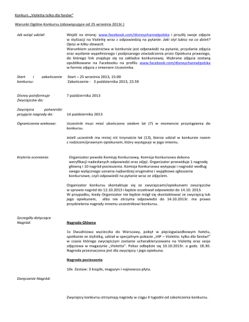 Konkurs „Violetta tylko dla fanów” Warunki Ogólne Konkursu (obowiązujące od 25 września 2013r.) Jak wziąć udział: Wejdź na stronę: www.facebook.com/disneychannelpolska i przyślij swoje zdjęcie w stylizacji na Violettę wraz z odpowiedzią na pytanie: Jaki styl lubisz na co dzień? Opisz w kilku słowach. Warunkiem uczestnictwa w konkursie jest odpowiedź na pytanie, przysłanie zdjęcia oraz wysłanie wypełnionego i podpisanego oświadczenia przez Opiekuna prawnego, do którego link znajduje się na zakładce konkursowej. Wybrane zdjęcia zostaną opublikowane na Facebooku na profilu www.facebook.com/disneychannelpolska w formie zdjęcia z imieniem Uczestnika. Start i konkursu: Start – 25 września 2013, 15:00 Zakończenie - 3 października 2013, 23.59 zakończenie Disney poinformuje Zwycięzców do: Zwycięzca potwierdzi przyjęcie nagrody do: Ograniczenia wiekowe: 7 października 2013 14 października 2013 Uczestnik musi mieć ukończone siedem lat (7) w momencie przystąpienia do konkursu. Jeżeli uczestnik ma mniej niż trzynaście lat (13), bierze udział w konkursie razem z rodzicem/prawnym opiekunem, który występuje w jego imieniu. Kryteria oceniania: Organizator powoła Komisję Konkursową. Komisja Konkursowa dokona weryfikacji nadesłanych odpowiedzi oraz zdjęć. Organizator przewiduje 1 nagrodę główną i 10 nagród pocieszenia. Komisja Konkursowa wytypuje i nagrodzi według swego wyłącznego uznania najbardziej oryginalne i wyjątkowe zgłoszenia konkursowe, czyli odpowiedź na pytanie wraz ze zdjęciem. Organizator konkursu skontaktuje się ze zwycięzcami/opiekunami zwycięzców w sprawie nagród do 12.10.2013 i będzie oczekiwał odpowiedzi do 14.10. 2013. W przypadku, kiedy Organizator nie będzie mógł się skontaktować ze zwycięzcą lub jego opiekunem, albo nie otrzyma odpowiedzi do 14.10.2013r. ma prawo przydzielenia nagrody innemu uczestnikowi konkursu. Szczegóły dotyczące Nagród: Nagroda Główna 1x Dwudniowa wycieczka do Warszawy, pobyt w pięciogwiazdkowym hotelu, spotkanie ze stylistką, udział w specjalnym pokazie „VIP – Violetta: tylko dla fanów!” w czasie którego zwyciężczyni zostanie ucharakteryzowana na Violettę oraz sesja zdjęciowa w magazynie „Violetta”. Pokaz odbędzie się 10.10.2013r. o godz. 18.30. Nagroda przeznaczona jest dla zwycięzcy i jego opiekuna. Nagroda pocieszenia 10x Zestaw: 3 książki, magazyn i najnowsza płyta. Doręczenie Nagród: Zwycięzcy konkursu otrzymają nagrody w ciągu 4 tygodni od zakończenia konkursu. Warunki Ogólne Organizatorem niniejszego konkursu jest The Walt Disney Company Limited. Building 12, 566 Chiswick High Road, London W4 5AN („Disney”). W przypadku jakichkolwiek pytań, proszę kontaktować się z Biurem Obsługi Klienta poprzez adres e-mail [email protected] . Biorąc udział w konkursie, wy („Wy”, „Uczestnik/Uczestnicy”) oraz gdy ma to zastosowanie – Wasi rodzice/przedstawiciele ustawowi (zwani łącznie „Rodzicem”), przyjmujecie i zgadzacie się na warunki określone w poniższych Warunkach Ogólnych. 1. Kwalifikacja. a. Aby wziąć udział w Konkursie musisz być zarejestrowanym użytkownikiem strony Facebook i posiadać aktywne konto. b. Jeśli masz mniej niż trzynaście (13) lat możesz brać udział w konkursie tylko pod nadzorem rodzica lub przedstawiciela ustawowego, który powinien działać w Twoim imieniu. c. Konkurs nie jest dostępny dla pracowników (i ich najbliższych rodzin) Disney’a, jego oddziałów lub jakiejkolwiek innej osoby związanej zawodowo z tym konkursem. d. Jeżeli nie zostało to inaczej uregulowane, maksymalnie jedno (1) zgłoszenie konkursowe przypada na osobę. Niedopuszczalne są zgłoszenia dokonywane za pośrednictwem przedstawicieli lub osób trzecich, a także wykorzystywanie wielu tożsamości lub adresów e-mail. Niedozwolone jest wykorzystywanie narzędzi lub programów automatycznych, a wszystkie takie zgłoszenia konkursowe zostaną zdyskwalifikowane. e. Akceptowane będą wyłącznie zgłoszenia internetowe dokonane z komputerów osobistych (takich jak PC) za pośrednictwem aplikacji danego konkursu. Zgłoszenie konkursowe należy dokonać przez Internet przed datą zakończenia. 2. Dane osobowe. Dokonując zgłoszenia konkursowego udostępniasz swoje dane spółce Disney (lub jej przedstawicielom), a nie portalowi Facebook. W celu przystąpienia do zgłoszenia konkursowego prosimy o podanie swojej nazwy użytkownika i adresu email. Disney (i/lub jej przedstawiciele) zachowa twój adres e-mail/nr telefonu z portalu Facebook (jako daną użytkownika), w celu zarządzania twoim dostępem do konkursu. Twoje dane osobowe (tj. Twoje imię i nazwisko, imię i nazwisko rodzica lub przedstawiciela ustawowego, adres e-mail, adres zamieszkania, data urodzenia, wizerunek, pseudonim, numer telefonu) będą wykorzystywane zgodnie z obowiązującą opublikowaną Polityką zachowania prywatności Disneya i mogą być przekazywane do naszych przedstawicieli w celu administrowania konkursem, wysyłania nagród i umożliwienia spółce Disney promowania konkursu oraz produktów i usług Disney’a (w tym produktów i usług jakiegokolwiek partnera, będącego sponsorem konkursu) we wszystkich mediach, w tym między innymi Disney TV, w Internecie, innych kanałach publikacji i serwisach społecznościowych. Dane osobowe będą wykorzystywane w celach marketingowych wyłącznie wtedy, gdy zgodziłeś się na otrzymywanie informacji marketingowych od Disney’a w przyszłości (mogłeś to zrobić, jeżeli wcześniej zarejestrowałeś swoje dane w Disney). Wyłonienie Zwycięzców. a. W przypadku konkursów opartych na umiejętnościach, zwycięzcy będą wyłonieni przez zespół sędziów według kryteriów oceny określonych powyżej. Sędziowie będą decydowali o przyznaniu każdej z nagród według swojego absolutnego i wyłącznego uznania (w przypadku, gdy zwycięzcy są wybierani spośród uzyskujących najle