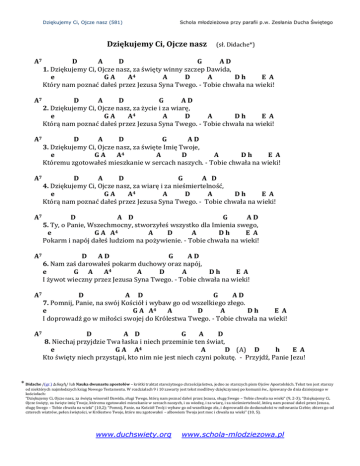 Dziękujemy Ci, Ojcze nasz (581) Schola młodzieżowa przy parafii p.w. Zesłania Ducha Świętego Dziękujemy Ci, Ojcze nasz (sł. Didache*) A7 D A D G AD 1. Dziękujemy Ci, Ojcze nasz, za święty winny szczep Dawida, e GA A4 A D A Dh E A Który nam poznać dałeś przez Jezusa Syna Twego. - Tobie chwała na wieki! A7 D A D G AD 2. Dziękujemy Ci, Ojcze nasz, za życie i za wiarę, e GA A4 A D A Dh E A Którą nam poznać dałeś przez Jezusa Syna Twego. - Tobie chwała na wieki! A7 D A D G AD 3. Dziękujemy Ci, Ojcze nasz, za święte Imię Twoje, e GA A4 A D A Dh E A Któremu zgotowałeś mieszkanie w sercach naszych. - Tobie chwała na wieki! A7 D A D G A D 4. Dziękujemy Ci, Ojcze nasz, za wiarę i za nieśmiertelność, e GA A4 A D A Dh E A Którą nam poznać dałeś przez Jezusa Syna Twego. - Tobie chwała na wieki! A7 D A D G AD 5. Ty, o Panie, Wszechmocny, stworzyłeś wszystko dla Imienia swego, e G A A4 A D A Dh E A Pokarm i napój dałeś ludziom na pożywienie. - Tobie chwała na wieki! A7 D AD G AD 6. Nam zaś darowałeś pokarm duchowy oraz napój, e G A A4 A D A Dh E A I żywot wieczny przez Jezusa Syna Twego. - Tobie chwała na wieki! A7 D A D G AD 7. Pomnij, Panie, na swój Kościół i wybaw go od wszelkiego złego. e G A A4 A D A Dh E A I doprowadź go w miłości swojej do Królestwa Twego. - Tobie chwała na wieki! A7 D A D G A D 8. Niechaj przyjdzie Twa łaska i niech przeminie ten świat, e G A A4 A D (A) D h E A Kto święty niech przystąpi, kto nim nie jest niech czyni pokutę. - Przyjdź, Panie Jezu! * Didache /(gr.) Διδαχὴ / lub Nauka dwunastu apostołów – krótki traktat starożytnego chrześcijaństwa, jedno ze starszych pism Ojców Apostolskich. Tekst ten jest starszy od niektórych najmłodszych ksiąg Nowego Testamentu. W rozdziałach 9 i 10 zawarty jest tekst modlitwy dziękczynnej po komunii św., śpiewany do dnia dzisiejszego w kościołach: “Dziękujemy Ci, Ojcze nasz, za świętą winorośl Dawida, sługi Twego, którą nam poznać dałeś przez Jezusa, sługę Swego – Tobie chwała na wieki” (9, 2-3); “Dziękujemy Ci, Ojcze święty, za święte imię Twoje, któremu zgotowałeś mieszkanie w sercach naszych, i za wiedzę, i za wiarę, i za nieśmiertelność, którą nam poznać dałeś przez Jezusa, sługę Swego – Tobie chwała na wieki” (10,2); “Pomnij, Panie, na Kościół Twój i wybaw go od wszelkiego zła, i doprowadź do doskonałości w miłowaniu Ciebie; zbierz go od czterech wiatrów, pełen świętości, w Królestwo Twoje, które mu zgotowałeś – albowiem Twoja jest moc i chwała na wieki” (10, 5). www.duchswiety.org www.schola-mlodziezowa.pl