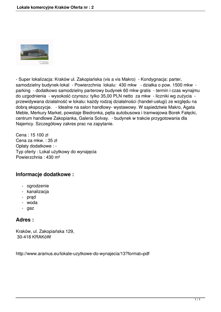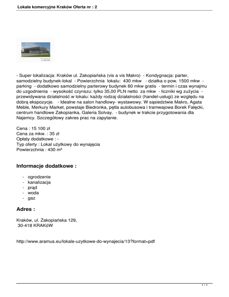 Lokale komercyjne Kraków Oferta nr : 2 - Super lokalizacja: Kraków ul. Zakopiańska (vis a vis Makro) - Kondygnacja: parter, samodzielny budynek-lokal - Powierzchnia lokalu: 430 mkw - działka o pow. 1500 mkw parking - dodatkowo samodzielny parterowy budynek 60 mkw gratis - termin i czas wynajmu do uzgodnienia - wysokość czynszu: tylko 35,00 PLN netto za mkw - liczniki wg zużycia przewidywana działalność w lokalu: każdy rodzaj działalności (handel-usługi) ze względu na dobrą ekspozycje. - Idealne na salon handlowy- wystawowy. W sąsiedztwie Makro, Agata Meble, Merkury Market, powstaje Biedronka, pętla autobusowa i tramwajowa Borek Fałęcki, centrum handlowe Zakopianka, Galeria Solvay. - budynek w trakcie przygotowania dla Najemcy. Szczegółowy zakres prac na zapytanie. Cena : 15 100 zł Cena za mkw. : 35 zł Opłaty dodatkowe : Typ oferty : Lokal użytkowy do wynajęcia Powierzchnia : 430 m² Informacje dodatkowe : - ogrodzenie kanalizacja prąd woda gaz Adres : Kraków, ul. Zakopiańska 129, 30-418 KRAKóW http://www.aramus.eu/lokale-uzytkowe-do-wynajecia/13?format=pdf 1/1