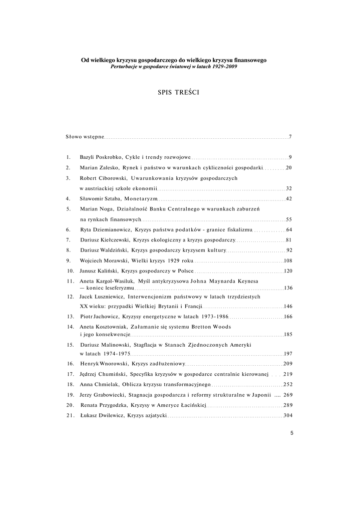 Od wielkiego kryzysu gospodarczego do wielkiego kryzysu finansowego Perturbacje w gospodarce światowej w latach 1929-2009 SPIS TREŚCI Słowo wstępne 7 1. Bazyli Poskrobko, Cykle i trendy rozwojowe 9 2. Marian Zalesko, Rynek i państwo w warunkach cykliczności gospodarki 3. Robert Ciborowski, Uwarunkowania kryzysów gospodarczych 20 w austriackiej szkole ekonomii 32 4. Sławomir Sztaba, M o n e t a r y z m 42 5. Marian Noga, Działalność Banku Centralnego w warunkach zaburzeń na rynkach finansowych 55 6. Ryta Dziemianowicz, Kryzys państwa p o d a t k ó w - granice fiskalizmu 64 7. Dariusz Kiełczewski, Kryzys ekologiczny a kryzys gospodarczy 81 8. Dariusz Waldziński, Kryzys gospodarczy kryzysem kultury 92 9. Wojciech Morawski, Wielki kryzys 1929 roku 108 10. Janusz Kaliński, Kryzys gospodarczy w Polsce 120 11. Aneta Kargol-Wasiluk, Myśl antykryzysowa J o h n a Maynarda Keynesa — koniec leseferyzmu 136 12. Jacek Luszniewicz, Interwencjonizm państwowy w latach trzydziestych XX wieku: przypadki Wielkiej Brytanii i Francji 146 13. Piotr Jachowicz, Kryzysy energetyczne w latach 1973-1986 166 14. Aneta Kosztowniak, Załamanie się systemu Bretton W o o d s i jego konsekwencje 185 15. Dariusz Malinowski, Stagflacja w Stanach Zjednoczonych Ameryki w latach 1974-1975 197 16. Henryk Wnorowski, Kryzys zadłużeniowy 209 17. Jędrzej Chumiński, Specyfika kryzysów w gospodarce centralnie kierowanej 219 18. Anna Chmielak, Oblicza kryzysu transformacyjnego 252 19. Jerzy Grabowiecki, Stagnacja gospodarcza i reformy strukturalne w Japonii .... 2 6 9 20. Renata Przygodzka, Kryzysy w Ameryce Łacińskiej 289 21. Łukasz Dwilewicz, Kryzys azjatycki 304 5 22. Andrzej Pieczewski, Gospodarka Indonezji w obliczu kryzysu azjatyckiego 329 23. Leonid N. Davydenko, Kryzys finansowy w Rosji 345 24. Nina Siemieniuk, Grzegorz Kowerda, Bańka internetowa - wybrane aspekty .... 358 25. Grażyna Michalczuk, Rachunkowość kreatywna czy rachunkowość agresywna? 366 26. Ireneusz Pszczółka, Amerykański „kryzys hipoteczny" 380 27. Andrzej F. Bocian, Procesy globalizacji a kryzys światowy 400 28. Jerzy Borowski, Korporacje transnarodowe wobec kryzysu hipotecznego 426 29. Wanda Karpińska-Mizielińska, Tadeusz Smuga, Wpływ pomocy z funduszy strukturalnych na zachowania przedsiębiorstw w warunkach kryzysu Afiliacje autorów 443 461