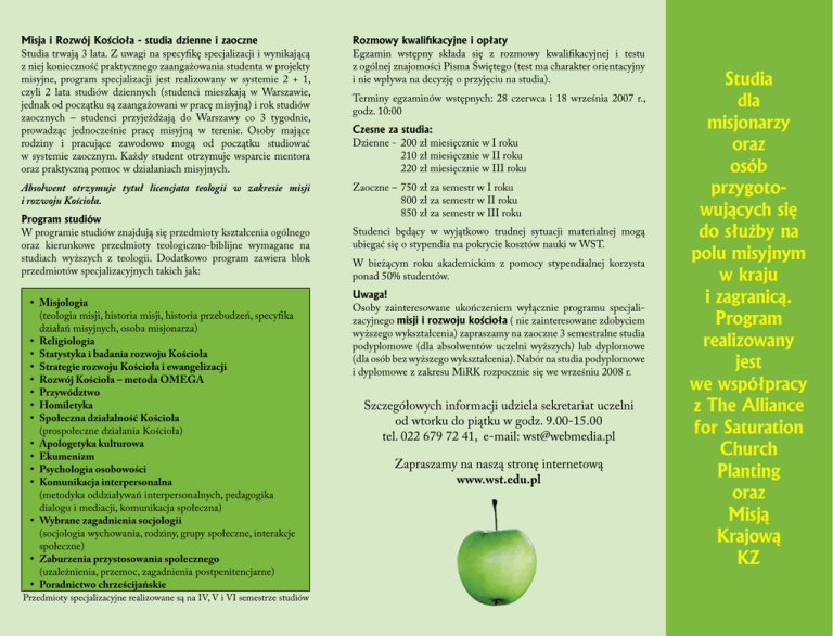 Misja i Rozwój Kościoła - studia dzienne i zaoczne Studia trwają 3 lata. Z uwagi na specyfikę specjalizacji i wynikającą z niej konieczność praktycznego zaangażowania studenta w projekty misyjne, program specjalizacji jest realizowany w systemie 2 + 1, czyli 2 lata studiów dziennych (studenci mieszkają w Warszawie, jednak od początku są zaangażowani w pracę misyjną) i rok studiów zaocznych – studenci przyjeżdżają do Warszawy co 3 tygodnie, prowadząc jednocześnie pracę misyjną w terenie. Osoby mające rodziny i pracujące zawodowo mogą od początku studiować w systemie zaocznym. Każdy student otrzymuje wsparcie mentora oraz praktyczną pomoc w działaniach misyjnych. Absolwent otrzymuje tytuł licencjata teologii w zakresie misji i rozwoju Kościoła. Program studiów W programie studiów znajdują się przedmioty kształcenia ogólnego oraz kierunkowe przedmioty teologiczno-biblijne wymagane na studiach wyższych z teologii. Dodatkowo program zawiera blok przedmiotów specjalizacyjnych takich jak: • Misjologia (teologia misji, historia misji, historia przebudzeń, specyfika działań misyjnych, osoba misjonarza) • Religiologia • Statystyka i badania rozwoju Kościoła • Strategie rozwoju Kościoła i ewangelizacji • Rozwój Kościoła – metoda OMEGA • Przywództwo • Homiletyka • Społeczna działalność Kościoła (prospołeczne działania Kościoła) • Apologetyka kulturowa • Ekumenizm • Psychologia osobowości • Komunikacja interpersonalna (metodyka oddziaływań interpersonalnych, pedagogika dialogu i mediacji, komunikacja społeczna) • Wybrane zagadnienia socjologii (socjologia wychowania, rodziny, grupy społeczne, interakcje społeczne) • Zaburzenia przystosowania społecznego (uzależnienia, przemoc, zagadnienia postpenitencjarne) • Poradnictwo chrześcijańskie Przedmioty specjalizacyjne realizowane są na IV, V i VI semestrze studiów Rozmowy kwalifikacyjne i opłaty Egzamin wstępny składa się z rozmowy kwalifikacyjnej i testu z ogólnej znajomości Pisma Świętego (test ma charakter orientacyjny i nie wpływa na decyzję o przyjęciu na studia). Terminy egzaminów wstępnych: 28 czerwca i 18 września 2007 r., godz. 10:00 Czesne za studia: Dzienne - 200 zł miesięcznie w I roku 210 zł miesięcznie w II roku 220 zł miesięcznie w III roku Zaoczne – 750 zł za semestr w I roku 800 zł za semestr w II roku 850 zł za semestr w III roku Studenci będący w wyjątkowo trudnej sytuacji materialnej mogą ubiegać się o stypendia na pokrycie kosztów nauki w WST. W bieżącym roku akademickim z pomocy stypendialnej korzysta ponad 50% studentów. Uwaga! Osoby zainteresowane ukończeniem wyłącznie programu specjalizacyjnego misji i rozwoju kościoła ( nie zainteresowane zdobyciem wyższego wykształcenia) zapraszamy na zaoczne 3 semestralne studia podyplomowe (dla absolwentów uczelni wyższych) lub dyplomowe (dla osób bez wyższego wykształcenia). Nabór na studia podyplomowe i dyplomowe z zakresu MiRK rozpocznie się we wrześniu 2008 r. Szczegółowych informacji udziela sekretariat uczelni od wtorku do piątku w godz. 9.00-15.00 tel. 022 679 72 41, e-mail: [email protected] Zapraszamy na naszą stronę internetową www.wst.edu.pl Studia dla misjonarzy oraz osób przygotowujących się do służby na polu misyjnym w kraju i zagranicą. Program realizowany jest we współpracy z The Alliance for Saturation Church Planting oraz Misją Krajową KZ Misja i Rozwój Warszawskie Seminarium Teologiczne jest zielonoświątkową wyższą szkołą teologiczną. Głównym celem uczelni jest kształcenie intelektu i chrześcijańskiego charakteru studentów, by służyli Bogu, Kościołowi i światu, jako pracownicy duchowni i świeccy. WST jest otwarte dla wszystkich społeczności ewangelicznowolnokościelnych Kościoła Specjalizacja w ramach studiów licencjackich w Warszawskim Seminarium Teologicznym Warszawskie Seminarium Teologiczne prowadzi nabór na trzyletnie licencjackie studia teologiczne, stacjonarne i zaoczne o specjalnościach: • pedagogika religii • muzyka chrześcijańska • teologia pastoralna • poradnictwo chrześcijańskie i profilaktyka społeczna • misja i rozwój kościoła Studia podyplomowe: • pastoralne • katechetyczno-pedagogiczne • katechetyczne • poradnictwo i profilaktyka społeczna