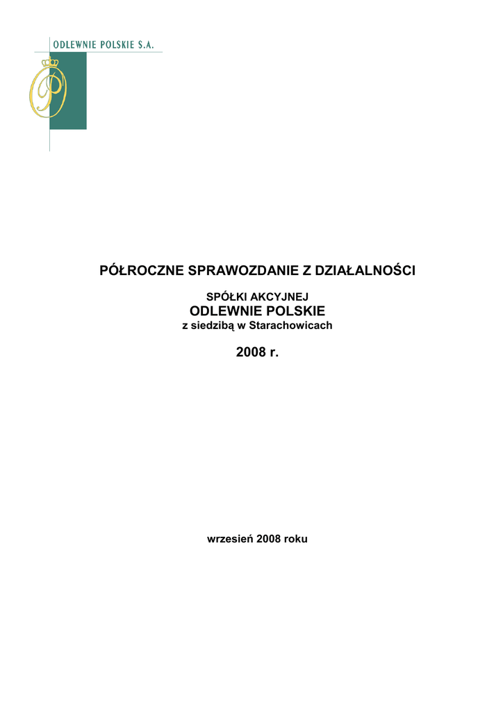 PÓŁROCZNE SPRAWOZDANIE Z DZIAŁALNOŚCI SPÓŁKI AKCYJNEJ ODLEWNIE POLSKIE z siedzibą w Starachowicach 2008 r. wrzesień 2008 roku SPIS TREŚCI Dane o Spółce .............................................................................................................................................. 4 1. Informacje ogólne o Spółce .................................................................................................................. 4 2. Kapitał zakładowy Spółki ...................................................................................................................... 4 3. Notowania akcji Spółki .......................................................................................................................... 4 Dane o działalności Spółki ............................................................................................................................ 5 4. Charakterystyka działalności Spółki ..................................................................................................... 5 5. Podstawowe produkty Spółki ................................................................................................................ 5 6. SprzedaŜ poszczególnych grup produktów i usług .............................................................................. 8 7. Rynki zbytu oferowanych produktów .................................................................................................... 9 8. Odbiorcy produktów Spółki ................................................................................................................. 11 9. Źródła zaopatrzenia w materiały do produkcji, w towary i usługi........................................................ 11 10. Umowy znaczące dla działalności Spółki ........................................................................................... 12 10.1. Umowy ubezpieczenia ...................................................................................................................... 13 11. Zmiany w powiązaniach Spółki z innymi podmiotami ......................................................................... 14 11.1. Zmiany w powiązaniach kapitałowych .............................................................................................. 14 11.2. Zmiany w powiązaniach organizacyjnych ......................................................................................... 14 12. Transakcje z podmiotami powiązanymi .............................................................................................. 14 13. Zaciągnięte kredyty i poŜyczki ............................................................................................................ 14 14. Udzielone poŜyczki i poręczenia ........................................................................................................ 15 14.1. Udzielone poŜyczki ........................................................................................................................... 15 14.2. Udzielone poręczenia ........................................................................................................................ 15 15. Emisja papierów wartościowych ......................................................................................................... 15 16. Działalność inwestycyjna .................................................................................................................... 15 16.1. Inwestycje rzeczowe ......................................................................................................................... 15 16.2. Inwestycje kapitałowe ....................................................................................................................... 16 17. WaŜniejsze osiągnięcia w dziedzinie badań i rozwoju ....................................................................... 16 18. Ochrona środowiska ........................................................................................................................... 16 Oceny i prognozy Spółki dotyczące prowadzonej działalności gospodarczej ............................................ 18 19. Zasady sporządzenia sprawozdania finansowego ............................................................................. 18 20. Omówienie podstawowych wielkości ekonomiczno-finansowych, ujawnionych w półrocznym sprawozdaniu finansowym .............................................................................................. 18 20.1. Analiza bilansu ........................................................................................................................................... 18 20.2. Analiza kosztów ......................................................................................................................................... 21 20.3. Analiza przychodów ................................................................................................................................... 22 20.4. Analiza wyniku finansowego ...................................................................................................................... 23 21. Objaśnienie róŜnic pomiędzy wynikami finansowymi wykazanymi w raporcie a wcześniej publikowanymi prognozami wyników na dany rok .............................................................................. 24 22. Ocena zarządzania zasobami finansowymi ...................................................................................... 24 22.1. Analiza zadłuŜenia ..................................................................................................................................... 24 22.2. Analiza płynności ....................................................................................................................................... 24 22.3. Analiza rentowności ...........................................................................