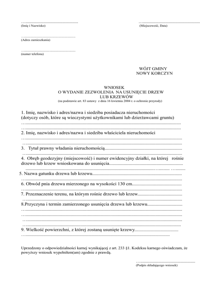 …............................................... …................................................... (Imię i Nazwisko) (Miejscowość, Data) …............................................................. (Adres zamieszkania) …............................................................. (numer telefonu) WÓJT GMINY NOWY KORCZYN WNIOSEK O WYDANIE ZEZWOLENIA NA USUNIĘCIE DRZEW LUB KRZEWÓW (na podstawie art. 83 ustawy z dnia 16 kwietnia 2004 r. o ochronie przyrody) 1. Imię, nazwisko i adres/nazwa i siedziba posiadacza nieruchomości (dotyczy osób, które są wieczystymi użytkownikami lub dzierżawcami gruntu) …................................................................................................................................ …................................................................................................................................ 2. Imię, nazwisko i adres/nazwa i siedziba właściciela nieruchomości …................................................................................................................................. …................................................................................................................................ 3. Tytuł prawny władania nieruchomością................................................................ …................................................................................................................................ 4. Obręb geodezyjny (miejscowość) i numer ewidencyjny działki, na której rośnie drzewo lub krzew wnioskowana do usunięcia............................................................. ..........................................................................................................…......... …........ 5. Nazwa gatunku drzewa lub krzewu.......................................................................... …................................................................................................................................. 6. Obwód pnia drzewa mierzonego na wysokości 130 cm......................................... …................................................................................................................................. 7. Przeznaczenie terenu, na którym rośnie drzewo lub krzew..................................... …................................................................................................................................ 8.Przyczyna i termin zamierzonego usunięcia drzewa lub krzewu............................. …................................................................................................................................. …................................................................................................................................. …................................................................................................................................ …............................................................................................................................... 9. Wielkość powierzchni, z której zostaną usunięte krzewy....................................... …................................................................................................................................. Uprzedzony o odpowiedzialności karnej wynikającej z art. 233 §1. Kodeksu karnego oświadczam, że powyższy wniosek wypełniłem(am) zgodnie z prawdą. …................................................. (Podpis składającego wniosek) (należy wypełnić w przypadku o uregulowanym stanie prawnym) wniosku składanego przez posiadacza nieruchomości Oświadczam, że posiadam prawo do nieruchomości oznaczonej w pkt 4 niniejszego wniosku na podstawie tytułu prawnego wskazanego w pkt 3 niniejszego wniosku. Świadomy/a/ odpowiedzialności karnej za podanie w niniejszym oświadczeniu nieprawdy – zgodnie z art. 233 k.k., potwierdzam własnoręcznym podpisem prawdziwość danych zamieszczonych powyżej. ……………………………….. czytelny odpis wnioskodawcy (należy wypełnić w przypadku wniosku o nieuregulowanym stanie prawnym) składanego przez posiadacza nieruchomości Oświadczam, że jestem posiadaczem nieruchomości o nieuregulowanym stanie prawnym oznaczonej w pkt 4 niniejszego wniosku. Świadomy/a/ odpowiedzialności karnej za podanie w niniejszym oświadczeniu nieprawdy – zgodnie z art. 233 k.k., potwierdzam własnoręcznym podpisem prawdziwość danych zamieszczonych powyżej. ……………………………….. czytelny podpis wnioskodawcy Do wniosku należy załączyć: 1. Oświadczenie o posiadanym tytule prawnym władania nieruchomością. 2. Zgodę właściciela nieruchomości, jeżeli posiadacz nieruchomości nie jest właścicielem lub użytkownikiem wieczystym. 3. W przypadku gdy nieruchomość jest współwłasnością należy dołączyć pisemną zgodę wszystkich współwłaścicieli. 4. Pełnomocnictwo w przypadku działania w imieniu posiadacza nieruchomości. 5. Rysunek lub mapkę określającą usytuowanie drzewa w stosunku do granic nieruchomości i obiektów budowlanych istniejących lub budowanych na tej nieruchomości. Uwaga: W myśl art. 83f, ust. 1 ustawy o ochronie przyrody nie jest wymagane zezwolenie na usunięcie m.in.: 1) krzewów, których wiek nie przekracza 10 lat; 2) krzewów na terenach pokrytych roślinnością pełniącą funkcje ozdobne, urządzoną pod względem rozmieszczenia i doboru gatunków posadzonych roślin, z wyłączeniem krzewów w pasie drogowym drogi publicznej, na terenie nieruchomości wpisanej do rejestru zabytków oraz na terenach zieleni; 3) drzew, których obwód pnia na wysokości 5 cm nie przekracza: a) 35 cm – w przypadku topoli, wierzb, kasztanowca zwyczajnego, klonu jesionolistnego, klonu srebrzystego, robinii akacjowej oraz platanu klonolistnego, b) 25 cm – w przypadku pozostałych gatunków drzew; 5) drzew lub krz