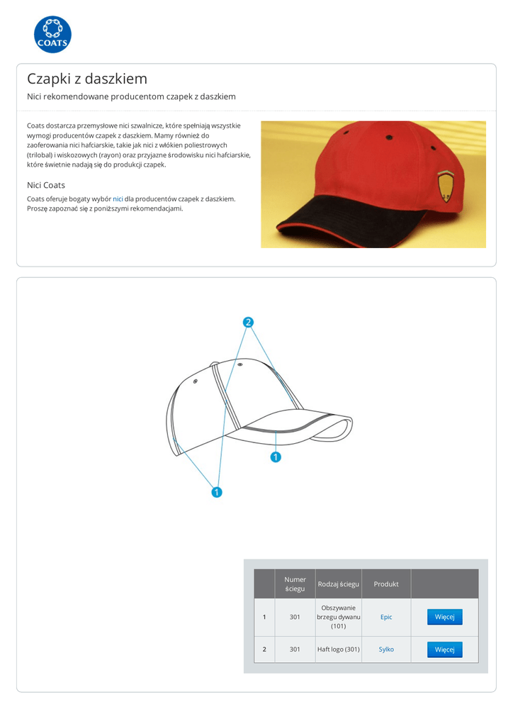 Czapki z daszkiem Nici rekomendowane producentom czapek z daszkiem Coats dostarcza przemysłowe nici szwalnicze, które spełniają wszystkie wymogi producentów czapek z daszkiem. Mamy również do zaoferowania nici hafciarskie, takie jak nici z włókien poliestrowych (trilobal) i wiskozowych (rayon) oraz przyjazne środowisku nici hafciarskie, które świetnie nadają się do produkcji czapek. Nici Coats Coats oferuje bogaty wybór nici dla producentów czapek z daszkiem. Proszę zapoznać się z poniższymi rekomendacjami. Numer ściegu Rodzaj ściegu Produkt Obszywanie 1 301 brzegu dywanu (101) Epic Więcej 2 301 Haft logo (301) Sylko Więcej Premium Nici przemysłowe Coats dostępne są w szerokiej gamie rodzajów włókien i wykończeń, z których każdy opracowany jest pod kątem konkretnych potrzeb naszych klientów. Zapraszamy do zapoznania się z naszą bogatą ofertą poniżej. W przypadku dostępności innych opcji, proszę wybrać odpowiednią opcję z listy. Wygląd szwu Rodzaj ściegu Numer ściegu Górna nitka Dolna nitka Produkt Tex Tkt Produkt Tex Tkt 1 Obszywanie brzegu dywanu (101) 301 Epic 24 120 Epic 24 120 2 Haft logo (301) 301 Sylko 27 120 Epic 18 180 Ponieważ rodzaje produktów i warunki zastosowania nici znacznie się między sobą różnią, Coats ani jego poszczególne oddziały nie mogą zagwarantować jednolitych rezultatów. Niniejsze zalecenia udzielone są w dobrej wierze, jednak bez gwarancji i odpowiedzialności ze strony firmy lub jej pracowników. Nie możemy zagwarantować, że produkt jest odpowiedni do określonego zastosowania. Klienci zawsze powinni przeprowadzić własne testy. W przypadku wątpliwości prosimy o odwołanie się do warunków użytkowania serwisu.