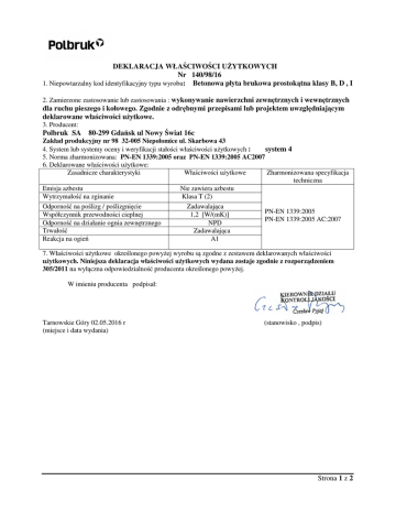DEKLARACJA WŁAŚCIWOŚCI UŻYTKOWYCH Nr 140/98/16 1. Niepowtarzalny kod identyfikacyjny typu wyrobu: Betonowa płyta brukowa prostokątna klasy B, D , I 2. Zamierzone zastosowanie lub zastosowania : wykonywanie nawierzchni zewnętrznych i wewnętrznych dla ruchu pieszego i kołowego. Zgodnie z odrębnymi przepisami lub projektem uwzględniającym deklarowane właściwości użytkowe. 3. Producent: Polbruk SA 80-299 Gdańsk ul Nowy Świat 16c Zakład produkcyjny nr 98 32-005 Niepołomice ul. Skarbowa 43 system 4 4. System lub systemy oceny i weryfikacji stałości właściwości użytkowych : 5. Norma zharmonizowana: PN-EN 1339:2005 oraz PN-EN 1339:2005 AC2007 6. Deklarowane właściwości użytkowe: Zasadnicze charakterystyki Właściwości użytkowe Zharmonizowana specyfikacja techniczna Emisja azbestu Nie zawiera azbestu Wytrzymałość na zginanie Klasa T (2) Odporność na poślizg / poślizgnięcie Współczynnik przewodności cieplnej Odporność na działanie ognia zewnętrznego Trwałość Reakcja na ogień Zadawalająca 1,2 [W/(mK)] NPD Zadawalająca A1 PN-EN 1339:2005 PN-EN 1339:2005 AC:2007 7. Właściwości użytkowe określonego powyżej wyrobu są zgodne z zestawem deklarowanych właściwości użytkowych. Niniejsza deklaracja właściwości użytkowych wydana zostaje zgodnie z rozporządzeniem 305/2011 na wyłączna odpowiedzialność producenta określonego powyżej. W imieniu producenta podpisał: Tarnowskie Góry 02.05.2016 r (miejsce i data wydania) (stanowisko , podpis) Strona 1 z 2 Dodatkowo deklarowane właściwości użytkowe: Odporność na warunki atmosferyczne Klasa B,D PN-EN 1339:2005 PN-EN 1339:2005 AC2007 Odporność na ścieranie Klasa I Obciążenie niszczące Klasa 3 (3 kN) Wymiary: klasa P Przekątne : klasa J Deklaracja Właściwości Użytkowych nr 140/98/16 i podany w pkt.1 niepowtarzalny kod typu wyrobów dotyczy następujących rodzajów płyt: Prostokątna 4x10x20 cm Kolory: szary , czerwony , grafitowy , oliwkowy, brązowy, pomarańczowy. Tekstura standardowa. Powierzchnia plaska. Strona 2 z 2