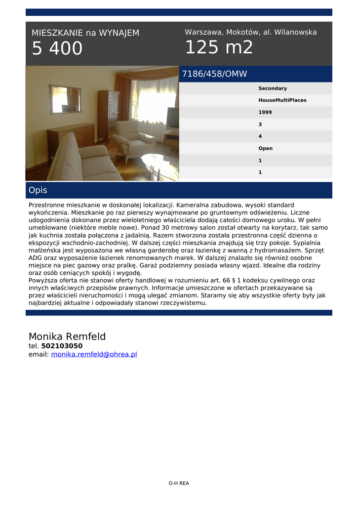 MIESZKANIE na WYNAJEM 5 400 Warszawa, Mokotów, al. Wilanowska 125 m2 7186/458/OMW Secondary HouseMultiPlaces 1999 3 4 Open 1 1 Opis Przestronne mieszkanie w doskonałej lokalizacji. Kameralna zabudowa, wysoki standard wykończenia. Mieszkanie po raz pierwszy wynajmowane po gruntownym odświeżeniu. Liczne udogodnienia dokonane przez wieloletniego właściciela dodają całości domowego uroku. W pełni umeblowane (niektóre meble nowe). Ponad 30 metrowy salon został otwarty na korytarz, tak samo jak kuchnia została połączona z jadalnią. Razem stworzona została przestronna część dzienna o ekspozycji wschodnio-zachodniej. W dalszej części mieszkania znajdują się trzy pokoje. Sypialnia małżeńska jest wyposażona we własną garderobę oraz łazienkę z wanną z hydromasażem. Sprzęt ADG oraz wyposażenie łazienek renomowanych marek. W dalszej znalazło się również osobne miejsce na piec gazowy oraz pralkę. Garaż podziemny posiada własny wjazd. Idealne dla rodziny oraz osób ceniących spokój i wygodę. Powyższa oferta nie stanowi oferty handlowej w rozumieniu art. 66 § 1 kodeksu cywilnego oraz innych właściwych przepisów prawnych. Informacje umieszczone w ofertach przekazywane są przez właścicieli nieruchomości i mogą ulegać zmianom. Staramy się aby wszystkie oferty były jak najbardziej aktualne i odpowiadały stanowi rzeczywistemu. Monika Remfeld tel. 502103050 email: [email protected] O-H REA Powered by TCPDF (www.tcpdf.org)