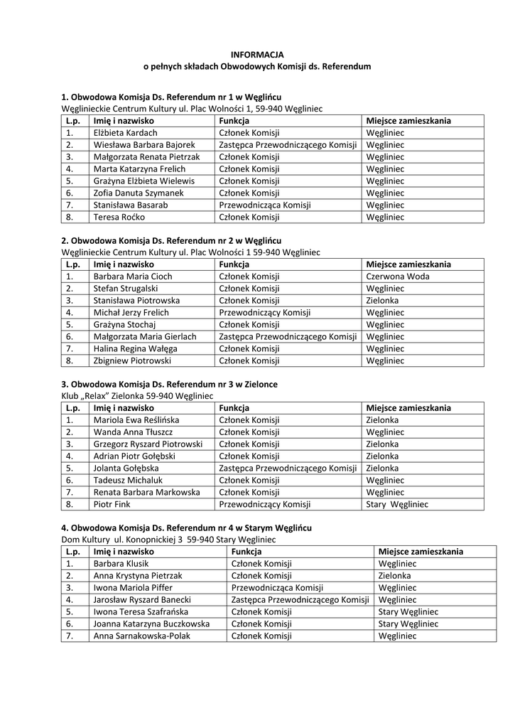 INFORMACJA o pełnych składach Obwodowych Komisji ds. Referendum 1. Obwodowa Komisja Ds. Referendum nr 1 w Węglińcu Węglinieckie Centrum Kultury ul. Plac Wolności 1, 59-940 Węgliniec L.p. Imię i nazwisko Funkcja 1. Elżbieta Kardach Członek Komisji 2. Wiesława Barbara Bajorek Zastępca Przewodniczącego Komisji 3. Małgorzata Renata Pietrzak Członek Komisji 4. Marta Katarzyna Frelich Członek Komisji 5. Grażyna Elżbieta Wielewis Członek Komisji 6. Zofia Danuta Szymanek Członek Komisji 7. Stanisława Basarab Przewodnicząca Komisji 8. Teresa Roćko Członek Komisji Miejsce zamieszkania Węgliniec Węgliniec Węgliniec Węgliniec Węgliniec Węgliniec Węgliniec Węgliniec 2. Obwodowa Komisja Ds. Referendum nr 2 w Węglińcu Węglinieckie Centrum Kultury ul. Plac Wolności 1 59-940 Węgliniec L.p. Imię i nazwisko Funkcja 1. Barbara Maria Cioch Członek Komisji 2. Stefan Strugalski Członek Komisji 3. Stanisława Piotrowska Członek Komisji 4. Michał Jerzy Frelich Przewodniczący Komisji 5. Grażyna Stochaj Członek Komisji 6. Małgorzata Maria Gierlach Zastępca Przewodniczącego Komisji 7. Halina Regina Wałęga Członek Komisji 8. Zbigniew Piotrowski Członek Komisji Miejsce zamieszkania Czerwona Woda Węgliniec Zielonka Węgliniec Węgliniec Węgliniec Węgliniec Węgliniec 3. Obwodowa Komisja Ds. Referendum nr 3 w Zielonce Klub „Relax” Zielonka 59-940 Węgliniec L.p. Imię i nazwisko Funkcja 1. Mariola Ewa Reślińska Członek Komisji 2. Wanda Anna Tłuszcz Członek Komisji 3. Grzegorz Ryszard Piotrowski Członek Komisji 4. Adrian Piotr Gołębski Członek Komisji 5. Jolanta Gołębska Zastępca Przewodniczącego Komisji 6. Tadeusz Michaluk Członek Komisji 7. Renata Barbara Markowska Członek Komisji 8. Piotr Fink Przewodniczący Komisji Miejsce zamieszkania Zielonka Węgliniec Zielonka Zielonka Zielonka Węgliniec Węgliniec Stary Węgliniec 4. Obwodowa Komisja Ds. Referendum nr 4 w Starym Węglińcu Dom Kultury ul. Konopnickiej 3 59-940 Stary Węgliniec L.p. Imię i nazwisko Funkcja 1. Barbara Klusik Członek Komisji 2. Anna Krystyna Pietrzak Członek Komisji 3. Iwona Mariola Piffer Przewodnicząca Komisji 4. Jarosław Ryszard Banecki Zastępca Przewodniczącego Komisji 5. Iwona Teresa Szafrańska Członek Komisji 6. Joanna Katarzyna Buczkowska Członek Komisji 7. Anna Sarnakowska-Polak Członek Komisji Miejsce zamieszkania Węgliniec Zielonka Węgliniec Węgliniec Stary Węgliniec Stary Węgliniec Węgliniec 5. Obwodowa Komisja Ds. Referendum nr 5 w Jagodzinie Dom Kultury Jagodzin 30 59-950 Ruszów L.p. Imię i nazwisko Funkcja 1. Małgorzata Kurianowicz Członek Komisji 2. Agnieszka Beata Olbert Członek Komisji 3. Edyta Marianna Sadko Członek Komisji 4. Justyna Anna Glonek Przewodnicząca Komisji 5. Mariola Nikola Kaczor Członek Komisji 6. Monika Agnieszka Mazur Zastępca Przewodniczącego Komisji 7. Mariola Magda Członek Komisji 8. Anna Bezeg Członek Komisji Miejsce zamieszkania Węgliniec Czerwona Woda Zielonka Jagodzin Piaseczna Jagodzin Jagodzin Jagodzin 6. Obwodowa Komisja Ds. Referendum nr 6 w Ruszowie Dom Kultury ul. Strzelecka 3 59-950 Ruszów L.p. Imię i nazwisko Funkcja 1. Grażyna Iwona Perońska Członek Komisji 2. Krystyna Cieśla Członek Komisji 3. Sylwia Justyna Lisowska Członek Komisji 4. Teresa Gabriela Wankowska Członek Komisji 5. Anna Baut Przewodnicząca Komisji 6. Bożena Natalia Szczepaniak Członek Komisji 7. Anna Katarzyna Pluskota Członek Komisji 8. Elżbieta Deluga Zastępca Przewodniczącego Komisji Miejsce zamieszkania Ruszów Węgliniec Kościelna Wieś Węgliniec Ruszów Ruszów Ruszów Ruszów 7. Obwodowa Komisja Ds. Referendum nr 7 w Ruszowie Dom Kultury ul. Strzelecka 3 59-950 Ruszów L.p. Imię i nazwisko Funkcja 1. Krystyna Masina Członek Komisji 2. Karolina Sylwia Bajorek Członek Komisji 3. Joanna Stanisława Banaszewska Członek Komisji 4. Szymon Mikołajczyk Zastępca Przewodniczącego Komisji 5. Agata Anna Rutka Członek Komisji 6. Gabriel Skowroński Członek Komisji 7. Katarzyna Julia Podkalicka Członek Komisji 8. Mariola Podkalicka Przewodnicząca Komisji Miejsce zamieszkania Ruszów Węgliniec Kościelna Wieś Jagodzin Ruszów Jagodzin Węgliniec Węgliniec 8. Obwodowa Komisja Ds. Referendum nr 8 w Czerwonej Wodzie Szkoła Podstawowa ul. Kolejowa 22 59-940 Czerwona Woda L.p. Imię i nazwisko Funkcja 1. Monika Izabela Piątka Członek Komisji 2. Cezary Adam Bajorek Przewodniczący Komisji 3. Barbara Podlewska Członek Komisji 4. Łukasz Jochna Członek Komisji 5. Maria Wędzina Członek Komisji 6. Ewa Irena Burda Członek Komisji 7. Dorota Agnieszka Wałęga Zastępca Przewodniczącego Komisji 8. Marzena Stefańska Członek Komisji Miejsce zamieszkania Czerwona Woda Węgliniec Zielonka Węgliniec Węgliniec Czerwona Woda Węgliniec Czerwona Woda Burmistrz Gminy i Miasta Węgliniec (-) Stanisław Mikołajczyk