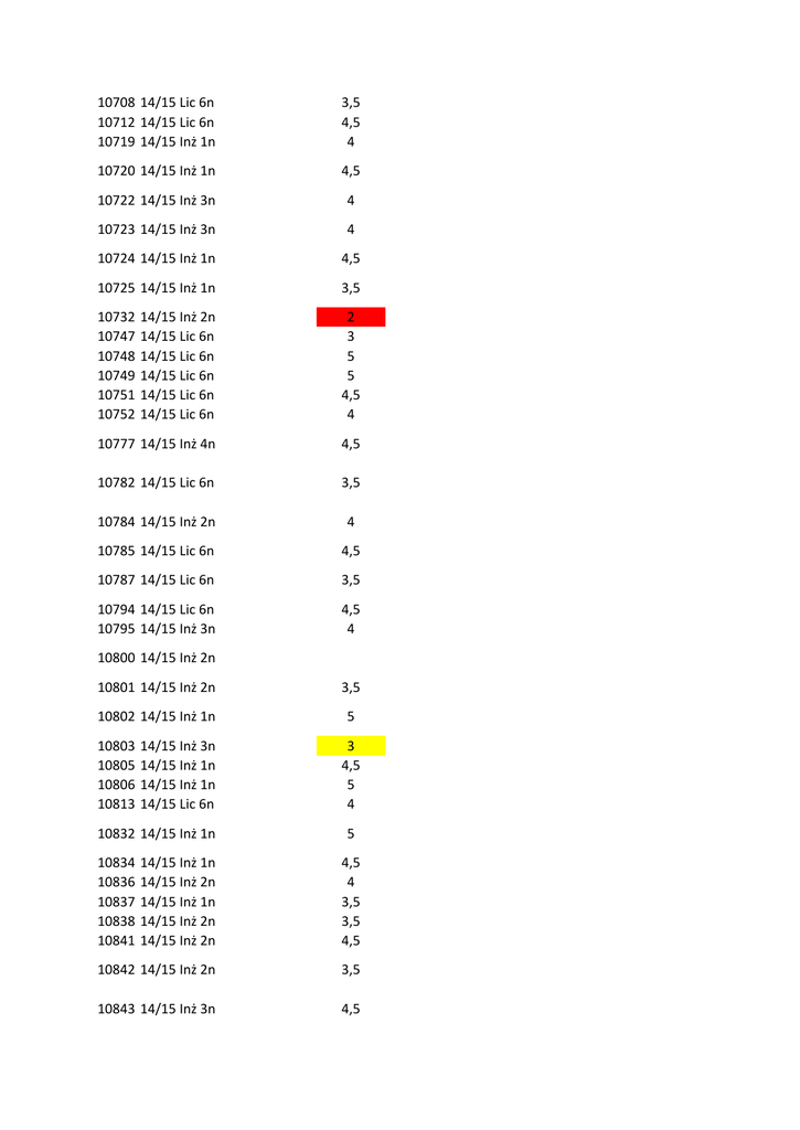 10708 14/15 Lic 6n 10712 14/15 Lic 6n 10719 14/15 Inż 1n 3,5 4,5 4 10720 14/15 Inż 1n 4,5 10722 14/15 Inż 3n 4 10723 14/15 Inż 3n 4 10724 14/15 Inż 1n 4,5 10725 14/15 Inż 1n 3,5 10732 10747 10748 10749 10751 10752 14/15 Inż 2n 14/15 Lic 6n 14/15 Lic 6n 14/15 Lic 6n 14/15 Lic 6n 14/15 Lic 6n 2 3 5 5 4,5 4 10777 14/15 Inż 4n 4,5 10782 14/15 Lic 6n 3,5 10784 14/15 Inż 2n 4 10785 14/15 Lic 6n 4,5 10787 14/15 Lic 6n 3,5 10794 14/15 Lic 6n 10795 14/15 Inż 3n 4,5 4 10800 14/15 Inż 2n 10801 14/15 Inż 2n 3,5 10802 14/15 Inż 1n 5 10803 10805 10806 10813 14/15 Inż 3n 14/15 Inż 1n 14/15 Inż 1n 14/15 Lic 6n 10832 14/15 Inż 1n 10834 10836 10837 10838 10841 3 4,5 5 4 5 14/15 Inż 1n 14/15 Inż 2n 14/15 Inż 1n 14/15 Inż 2n 14/15 Inż 2n 4,5 4 3,5 3,5 4,5 10842 14/15 Inż 2n 3,5 10843 14/15 Inż 3n 4,5 10845 14/15 Inż 2n 10847 14/15 Inż 2n 3,5 10856 14/15 Lic 6n 4 10864 14/15 Lic 6n 3,5 10876 14/15 Lic 6n 3,5 10877 14/15 Lic 6n 4 10905 14/15 Lic 6n 4 10915 14/15 B 10918 14/15 Inż 2n 10920 14/15 Inż 4n 10921 14/15 Inż 2n 3,5 3,5 10922 14/15 Inż 4n 4,5 10923 14/15 Inż 3n 10924 14/15 Inż 2n 3,5 10925 14/15 Inż 3n 4,5 10926 10927 10929 10930 14/15 Inż 3n 14/15 Inż 1n 14/15 Inż 2n 14/15 Inż 3n 2 4 4 4,5 10931 14/15 Inż 1n 4,5 10946 14/15 Inż 2n 4 10947 14/15 Inż 3n 3,5 10948 14/15 Inż 2n 4,5 10949 14/15 Inż 2n 4,5 10950 14/15 Inż 3n 2 10955 14/15 Inż 2n 10956 14/15 Inż 2n 4 3,5 10958 14/15 Inż 3n 4 10960 14/15 Inż 2n 3,5 10961 14/15 Inż 2n 4 10962 14/15 Inż 3n 4 10964 14/15 Inż 3n 3,5 10965 14/15 Inż 3n 10966 14/15 Inż 2n 11053 14/15 Lic 6n 3 4 4,5 11063 14/15 Lic 6n 3,5 11066 14/15 Lic 6n 3,5 11074 14/15 Lic 6n 4 11075 14/15 Lic 6n 3,5 11079 14/15 Lic 6n 3 11082 14/15 Lic 6n 4 11084 14/15 Inż 3n 11085 14/15 Inż 1n 3,5 11087 14/15 Inż 2n 4 11088 11090 11091 11093 11094 14/15 Inż 3n 14/15 Inż 1n 14/15 Inż 3n 14/15 Inż 3n 14/15 Inż 1n 4 3,5 4 3 11096 14/15 Inż 1n 4,5 11097 14/15 Inż 2n 11098 14/15 Inż 1n 4 3,5 11099 14/15 Inż 2n 3,5 11100 14/15 Inż 1n 11101 14/15 Inż 2n 5 4 11102 14/15 Inż 1n 4,5 11150 11151 11152 11153 11154 11155 11156 11157 11158 11159 11160 11161 11162 11163 11164 4 3,5 4,5 4 3,5 4,5 3 14/15 Inż 2n 14/15 Inż 2n 14/15 Inż 2n 14/15 Inż 2n 14/15 Inż 1n 14/15 Inż 1n 14/15 Inż 1n 14/15 Inż 3n 14/15 Inż 1n 14/15 Inż 2n 14/15 Inż 3n 14/15 Inż 3n 14/15 Inż 3n 14/15 Inż 4n 14/15 Inż 3n PS 3 4 3,5 3 2 4,5 11165 14/15 Inż 1n 3,5 11166 14/15 Inż 3n 4 11167 14/15 Inż 1n 4 11175 14/15 Lic 6n 4,5 11176 14/15 Lic 6n 4,5 11181 14/15 Lic 6n 3,5 11184 14/15 Lic 6n 3,5 11190 14/15 Lic 6n 3 11191 14/15 Lic 6n 4 11242 14/15 Lic 6n 11247 14/15 Lic 6n 3 3,5 11252 14/15 Lic 6n 4,5 11255 11265 11267 11268 11269 3,5 4 4,5 4,5 4 14/15 Lic 6n 14/15 Inż 3n 14/15 Inż 4n 14/15 Inż 3n 14/15 Inż 3n 11270 14/15 Inż 3n 3 11271 14/15 Inż 3n 4 11272 14/15 Inż 3n 3,5 11273 14/15 Inż 3n 4,5 11274 14/15 Inż 4n 4,5 11275 14/15 Inż 3n 11276 14/15 Inż 3n 11277 14/15 Inż 1n 4 4 5 11278 14/15 Inż 3n 4 11279 11280 11342 11346 14/15 Inż 3n 14/15 Inż 3n 14/15 Lic 7n 14/15 Lic 7n 4,5 4 5 4,5 11348 14/15 Lic 7n 4 11379 11380 11381 11382 11383 5 √ 3,5 3,5 √ √ 4 √ 14/15 A 14/15 B 14/15 B 14/15 A 14/15 A 11384 14/15 B 11386 14/15 B 11387 14/15 A 11388 11389 11390 11391 14/15 B 14/15 B 14/15 B 14/15 A 5 √ 11392 14/15 A 4 √ 14/15 A 14/15 A 14/15 Lic 7n 14/15 Lic 7n 14/15 Lic 7n 4 4 3 3,5 4,5 √ √ 11432 14/15 Lic 7n 4,5 11434 14/15 Lic 7n 4,5 11445 14/15 Lic 7n 5 11457 14/15 Lic 7n 4 11394 11396 11424 11425 11429 11489 14/15 A 3,5 √ 11490 14/15 A 3 √ 11501 11506 11508 11509 14/15 Lic 7n 14/15 Lic 7n 14/15 Lic 7n 14/15 Lic 7n 3 3,5 3,5 4,5 11510 14/15 Lic 7n 3,5 11519 14/15 Lic 7n 3,5 11522 14/15 Lic 7n 4,5 11523 14/15 Inż 1n 11524 11525 11526 11527 11528 14/15 Inż 4n 14/15 Inż 4n 14/15 Inż 4n 14/15 Inż 4n 14/15 Inż 4n 4,5 4 4 4 11529 14/15 Inż 4n 4,5 11530 14/15 Inż 4n 4,5 11531 11532 11534 11535 11536 3,5 4 3,5 2 2 14/15 Inż 4n 14/15 Inż 4n 14/15 Inż 4n 14/15 Inż 4n 14/15 Inż 4n 11538 14/15 Inż 4n 4 11539 14/15 Inż 4n 11540 14/15 Inż 1n 3,5 3,5 11541 14/15 Inż 4n 3,5 11542 14/15 Inż 4n 11544 14/15 Inż 4n 4,5 4,5 11545 14/15 Inż 4n 3,5 11547 14/15 Inż 2n 4 11548 14/15 Inż 4n 2 11549 14/15 Inż 4n 4,5 11551 14/15 Inż 1n 5 11552 11554 11555 11557 11558 11559 11560 11561 11563 11583 11585 14/15 Inż 2n 14/15 Inż 4n 14/15 Inż 4n 14/15 Inż 1n 14/15 Inż 4n 14/15 Inż 4n 14/15 Inż 4n 14/15 Inż 4n 14/15 Inż 4n 14/15 Lic 7n 14/15 Lic 7n 11586 14/15 Lic 7n 11607 11608 11609 11615 11617 3,5 3,5 4 2 4,5 4 5 3,5 3 3,5 14/15 Lic 7n 14/15 Lic 7n 14/15 Lic 7n 14/15 Lic 7n 14/15 Inż 2n 4 3 11618 14/15 Inż 2n 4 11619 14/15 Inż 2n 4 11622 14/15 Inż 1n 4,5 11623 14/15 Inż 4n 3 11625 14/15 Inż 1n 11626 14/15 Inż 1n 5 4,5 11630 14/15 Lic 7n 3,5 11631 14/15 Lic 7n 11632 14/15 Lic 7n 11635 14/15 Inż 1n 4 4 2 11640 14/15 Inż 1n 3 11653 14/15 Lic 7n 4 11674 14/15 Lic 7n 3 11692 14/15 Inż 2n 4 11693 14/15 Inż 2n 3,5 11707 14/15 Lic 6n 3,5 11712 14/15 Lic 6n 3 10709 14/15 Lic 4n 4,5 10710 14/15 Lic 3n 4 10711 14/15 Lic 4n 3,5 10713 14/15 Lic 4n 3,5 10714 14/15 Lic 4n 3,5 10715 10716 10717 10743 10744 14/15 Lic 1n 14/15 Lic 3n 14/15 Lic 1n 14/15 Lic 2n 14/15 Lic 4n 3,5 3 4 3 3 10745 14/15 Lic 3n 3,5 10746 14/15 Lic 1n 3,5 10750 14/15 Lic 2n 4 10753 14/15 Lic 4n 2 10754 14/15 Lic 3n 3 10755 14/15 Lic 1n 10769 14/15 Lic 1n 10770 14/15 Lic 3n 4 4 3 10771 14/15 Lic 1n ITS 4 10772 14/15 Lic 2n 4 10774 14/15 Lic 3n 3,5 10775 14/15 Lic 4n 4 10776 14/15 Lic 3n 10778 14/15 Lic 1n 3,5 4 10779 14/15 Lic 3n 3 10780 14/15 Lic 2n 2 10781 14/15 Lic 1n 10783 14/15 Lic 4n 3,5 3 10786 14/15 Lic 5n 3 10788 10789 10790 10791 10792 10793 14/15 Lic 4n 14/15 Lic 1n 14/15 Lic 1n 14/15 Lic 3n 14/15 Lic 4n 14/15 Lic 3n 5 4 3 3,5 3,5 4 10808 14/15 Lic 2n 3,5 10812 14/15 Lic 2n 4 10817 14/15 Lic 1n 4 10819 14/15 Lic 4n 3,5 10821 10822 10823 10850 10851 14/15 Lic 2n 14/15 Lic 2n 14/15 Lic 4n 14/15 Lic 4n 14/15 Lic 1n 3 3,5 3,5 4,5 3,5 10853 14/15 Lic 