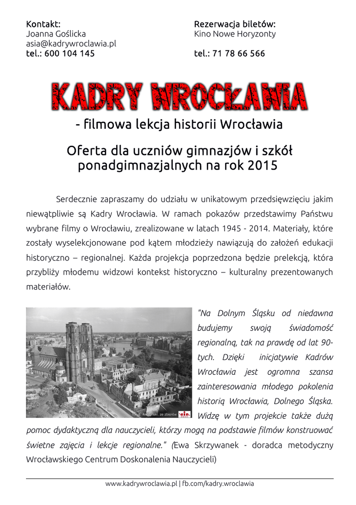 Kontakt: Joanna Goślicka [email protected] tel.: 600 104 145 Rezerwacja biletów: Kino Nowe Horyzonty tel.: 71 78 66 566 - filmowa lekcja historii Wrocławia Oferta dla uczniów gimnazjów i szkół ponadgimnazjalnych na rok 2015 Serdecznie zapraszamy do udziału w unikatowym przedsięwzięciu jakim niewątpliwie są Kadry Wrocławia. W ramach pokazów przedstawimy Państwu wybrane filmy o Wrocławiu, zrealizowane w latach 1945 - 2014. Materiały, które zostały wyselekcjonowane pod kątem młodzieży nawiązują do założeń edukacji historyczno – regionalnej. Każda projekcja poprzedzona będzie prelekcją, która przybliży młodemu widzowi kontekst historyczno – kulturalny prezentowanych materiałów. "Na Dolnym Śląsku od niedawna budujemy swoją świadomość regionalną, tak na prawdę od lat 90tych. Dzięki Wrocławia inicjatywie Kadrów jest ogromna szansa zainteresowania młodego pokolenia historią Wrocławia, Dolnego Śląska. Widzę w tym projekcie także dużą pomoc dydaktyczną dla nauczycieli, którzy mogą na podstawie filmów konstruować świetne zajęcia i lekcje regionalne." (Ewa Skrzywanek - doradca metodyczny Wrocławskiego Centrum Doskonalenia Nauczycieli) www.kadrywroclawia.pl | fb.com/kadry.wroclawia Program pokazów dla uczniów gimnazjów i szkół podnadgimnazjalnych: „Wyrok na miasto”, reż. Janusz Chodnikiewicz, 1968 Film opowiada o losach Festung Breslau, a komentarzem do unikatowych archiwalnych zdjęć są wspomnienia niemieckiego księdza, autora "Kroniki oblężenia Wrocławia w roku 1945". „Wrocław w Polskiej Kronice Filmowej” (1945 - 1965) Blok poświęconych Wrocławiowi fragmentów Polskiej Kroniki Filmowej z lat 194565. Można tu zobaczyć m.in. dymiące ruiny miasta, deportację ludności niemieckiej, odbudowę miasta. „Odbudowa Wrocławia”, reż. Marcin Bradke, 2005 Film opowiada o skali zniszczeń wojennych oraz o trudach i problemach powojennej odbudowy Wrocławia. Przypomina także historię miasta i jego wielokulturową przeszłość. „Kręci Cię Wrocław? Kręć Wrocław!” Filmy nagrodzone w konkursie na krótki film o Wrocławiu „Kręci Cię Wrocław? Kręć Wrocław!”. W programie wybrane filmy z lat 2011-2014. Harmonogram pokazów: Wszystkie pokazy odbędą się w Kinie Nowe Horyzonty, ul. Kazimierza Wielkiego 19a – 21, Wrocław 26.02.2015 – czwartek, godz. 10:00 20.03.2015 – piątek, godz. 10:00 13.04.2015 – poniedziałek, godz. 10:00 05.05.2015 – wtorek, godz. 10:00 Każdy pokaz poprzedzony zostanie prelekcją historyka. Czas trwania pokazu – około 90 min (z prelekcją). Dla większej ilości osób istnieje możliwość zorganizowania pokazów w innych terminach. Cena biletu grupowego: 10 zł, opiekunowie gratis. www.kadrywroclawia.pl | fb.com/kadry.wroclawia