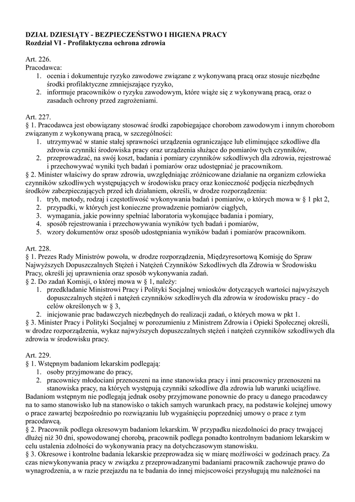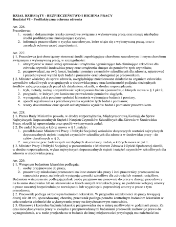 DZIAŁ DZIESIĄTY - BEZPIECZEŃSTWO I HIGIENA PRACY Rozdział VI - Profilaktyczna ochrona zdrowia Art. 226. Pracodawca: 1. ocenia i dokumentuje ryzyko zawodowe związane z wykonywaną pracą oraz stosuje niezbędne środki profilaktyczne zmniejszające ryzyko, 2. informuje pracowników o ryzyku zawodowym, które wiąże się z wykonywaną pracą, oraz o zasadach ochrony przed zagrożeniami. Art. 227. § 1. Pracodawca jest obowiązany stosować środki zapobiegające chorobom zawodowym i innym chorobom związanym z wykonywaną pracą, w szczególności: 1. utrzymywać w stanie stałej sprawności urządzenia ograniczające lub eliminujące szkodliwe dla zdrowia czynniki środowiska pracy oraz urządzenia służące do pomiarów tych czynników, 2. przeprowadzać, na swój koszt, badania i pomiary czynników szkodliwych dla zdrowia, rejestrować i przechowywać wyniki tych badań i pomiarów oraz udostępniać je pracownikom. § 2. Minister właściwy do spraw zdrowia, uwzględniając zróżnicowane działanie na organizm człowieka czynników szkodliwych występujących w środowisku pracy oraz konieczność podjęcia niezbędnych środków zabezpieczających przed ich działaniem, określi, w drodze rozporządzenia: 1. tryb, metody, rodzaj i częstotliwość wykonywania badań i pomiarów, o których mowa w § 1 pkt 2, 2. przypadki, w których jest konieczne prowadzenie pomiarów ciągłych, 3. wymagania, jakie powinny spełniać laboratoria wykonujące badania i pomiary, 4. sposób rejestrowania i przechowywania wyników tych badań i pomiarów, 5. wzory dokumentów oraz sposób udostępniania wyników badań i pomiarów pracownikom. Art. 228. § 1. Prezes Rady Ministrów powoła, w drodze rozporządzenia, Międzyresortową Komisję do Spraw Najwyższych Dopuszczalnych Stężeń i Natężeń Czynników Szkodliwych dla Zdrowia w Środowisku Pracy, określi jej uprawnienia oraz sposób wykonywania zadań. § 2. Do zadań Komisji, o której mowa w § 1, należy: 1. przedkładanie Ministrowi Pracy i Polityki Socjalnej wniosków dotyczących wartości najwyższych dopuszczalnych stężeń i natężeń czynników szkodliwych dla zdrowia w środowisku pracy - do celów określonych w § 3, 2. inicjowanie prac badawczych niezbędnych do realizacji zadań, o których mowa w pkt 1. § 3. Minister Pracy i Polityki Socjalnej w porozumieniu z Ministrem Zdrowia i Opieki Społecznej określi, w drodze rozporządzenia, wykaz najwyższych dopuszczalnych stężeń i natężeń czynników szkodliwych dla zdrowia w środowisku pracy. Art. 229. § 1. Wstępnym badaniom lekarskim podlegają: 1. osoby przyjmowane do pracy, 2. pracownicy młodociani przenoszeni na inne stanowiska pracy i inni pracownicy przenoszeni na stanowiska pracy, na których występują czynniki szkodliwe dla zdrowia lub warunki uciążliwe. Badaniom wstępnym nie podlegają jednak osoby przyjmowane ponownie do pracy u danego pracodawcy na to samo stanowisko lub na stanowisko o takich samych warunkach pracy, na podstawie kolejnej umowy o prace zawartej bezpośrednio po rozwiązaniu lub wygaśnięciu poprzedniej umowy o prace z tym pracodawcą. § 2. Pracownik podlega okresowym badaniom lekarskim. W przypadku niezdolności do pracy trwającej dłużej niż 30 dni, spowodowanej chorobą, pracownik podlega ponadto kontrolnym badaniom lekarskim w celu ustalenia zdolności do wykonywania pracy na dotychczasowym stanowisku. § 3. Okresowe i kontrolne badania lekarskie przeprowadza się w miarę możliwości w godzinach pracy. Za czas niewykonywania pracy w związku z przeprowadzanymi badaniami pracownik zachowuje prawo do wynagrodzenia, a w razie przejazdu na te badania do innej miejscowości przysługują mu należności na pokrycie kosztów przejazdu według zasad obowiązujących przy podróżach służbowych. § 4. Pracodawca nie może dopuścić do pracy pracownika bez aktualnego orzeczenia lekarskiego stwierdzającego brak przeciwwskazań do pracy na określonym stanowisku. § 5. Pracodawca zatrudniający pracowników w warunkach narażenia na działanie substancji i czynników rakotwórczych lub pyłów zwłókniających jest obowiązany zapewnić tym pracownikom okresowe badania lekarskie także: 1. po zaprzestaniu pracy w kontakcie z tymi substancjami, czynnikami lub pyłami, 2. po rozwiązaniu stosunku pracy, jeżeli zainteresowana osoba zgłosi wniosek o objęcie takimi badaniami. § 6. Badania, o których mowa w § 1, 2 i 5, są przeprowadzane na koszt pracodawcy. Pracodawca ponosi ponadto inne koszty profilaktycznej opieki zdrowotnej nad pracownikami, niezbędnej z uwagi na warunki pracy. § 7. Pracodawca jest obowiązany przechowywać orzeczenia wydane na podstawie badań lekarskich, o których mowa w § 1, 2 i 5. § 8. Minister Zdrowia i Opieki Społecznej w porozumieniu z Ministrem Pracy i Polityki Socjalnej określi w drodze rozporządzenia: 1. tryb i zakres badań lekarskich, o których mowa w § 1, 2 i 5, oraz częstotliwość badań okresowych, a także sposób dokumentowania i kontroli badań lekarskich, 2. tryb wydawania i przechowywania orzeczeń lekarskich do celów przewidzianych w Kodeksie pracy i w przepisach wydanych na jego podstawie, 3. zakres profilaktycznej opieki zdrowotnej, o której mowa w § 6 zdanie drugie, 4. dodatkowe wymagania kwalifikacyjne, jakie powinni spełniać lekarze przeprowadzający badania, o których mowa w § 1, 2 i 5, oraz sprawujący profilaktyczną opiekę zdrowotną, o której mowa w § 6 zdanie drugie. Art. 230. § 1. W razie stwierdzenia u pracownika objawów wskazujących na powstawanie choroby zawodowej, pracodawca jest obowiązany, na podstawie orzeczenia lekarskiego, w terminie i na czas określony w tym orzeczeniu, przenieść pracownika do innej pracy nie narażającej go na działanie czynnika, który wywołał te objawy. § 2. Jeżeli przeniesienie do innej pracy powoduje obniżenie wynagrodzenia, pracownikowi przysługuje dodatek wyrównawczy przez okres nie przekraczający 6 