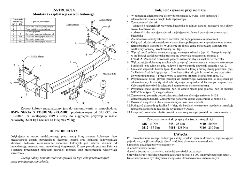 INSTRUKCJA MontaŜu i eksploatacji zaczepu kulowego Oznaczenie zacisku wg ISO PN 1 L 2 + 3 31 4 R 5 58R 6 54 7 58L Kolejność czynności przy montaŜu M10x35mm Łączenie przewodów Do świateł kierunku jazdy lewych Tylne światła przeciwmgłowe Do masy pojazdu Do świateł kierunku jazdy prawych Do świateł pozycyjnych prawych Do świateł hamowania Do świateł pozycyjnych lewych M10x35mm 5 A 4 M10x35mm 1 7 5 M12x75mm A 4 3 2 Zaczep kulowy przeznaczony jest do zamontowania w samochodzie: BMW SERIA 5 TOURING (KOMBI), produkowanym od 02.1997r. do 01.2004r., nr katalogowy B09 i słuŜy do ciągnięcia przyczep o masie całkowitej 2200 kg i nacisku na kulę max 90 kg. 1. W bagaŜniku zdemontować osłony boczne nadkoli, wyjąć koło zapasowe i zdemontować osłonę z wnęki koła zapasowego. 2. Zdemontować zderzak: - odkręcić 6 nakrętek M8 wewnątrz bagaŜnika na tylnym panelu i rozłączyć po 3 klipsy wokół błotników kół. - odkręcić śruby mocujące zderzak znajdujące się z lewej i prawej strony wewnątrz bagaŜnika 3. Zdemontować amortyzatorki ze zderzaka (nie będą ponownie montowane). 4. Odłączyć od zderzaka metalowe wzmocnienie, polistyrenowe wypełnienie oraz osłonę termiczną (jeśli występuje). Wypiłować środkową część metalowego wzmocnienia wzdłuŜ wytłoczonej, kropkowanej linii (rys. 3). 5. Wyciąć część grzbietu wzmacniającego wewnątrz zderzaka (rys. 4). Następnie wyciąć w środkowej części zderzaka prostokątny otwór jak pokazano na rysunku 5. UWAGA! Zachować ostroŜność podczas wiercenia aby nie uszkodzić zderzaka. 6. Wykorzystując dołączony szablon naleŜy wyciąć dwa elementy z tworzywa sztucznego i umieścić je na tylnej ścianie, na lewej i prawej stronie podwozia zgodnie z rys. 2. 7. Umieścić wsporniki boczne (poz. 4) w otworach z lewej i prawej strony podwozia (rys. 2). Umieścić nakładki gięte (poz. 5) w bagaŜniku i skręcić luźno od strony bagaŜnika ze wspornikami poz. 4 przez otwory A czterema śrubami M10x35mm (poz. 7). 8. Przymocować belkę główną zaczepu do metalowego wzmocnienia w miejscach po zdemontowanych amortyzatorkach uŜywając oryginalne dołączanego wyposaŜenia. Cały zespół przyłoŜyć do zderzaka i zamontować osłonę termiczną. 9. Przykręcić część kulistą zaczepu (poz. 2) wraz z blachą pod gniazdo (poz. 3) śrubami M12x75mm (poz. 6) z wyposaŜenia. 10. Zamontować powstały zespół zderzaka z hakiem uŜywając nakrętek M10 i dołączonych podkładek. Zamontować ponownie części wymienione w punkcie 1. 11. Dokręcić wszystkie śruby z momentem jak pokazano w tabeli. 12. Podłączyć przewody gniazdka 7 – bieg. do instalacji elektrycznej zgodnie z instrukcją fabryczną samochodu (zaleca się wykonanie w ASO). 13. Uzupełnić ewentualne ubytki powłoki malarskiej zaczepu powstałe w trakcie montaŜu. Zalecany moment skręcający dla śrub i nakrętek 8,8: M6 - 11 Nm M8 - 25 Nm M10 - 50 Nm M12 - 87 Nm M14 - 138 Nm M16 - 210 Nm OD PRODUCENTA Dziękujemy za wybór produkowanego przez naszą firmę zaczepu kulowego. Jego niezawodność została potwierdzona licznymi testami oraz opiniami zadowolonych klientów. JednakŜe niezawodność zaczepów kulowych jest zaleŜna równieŜ od prawidłowego montaŜu oraz prawidłowej eksploatacji. Z tego powodu prosimy Państwa o staranne przeczytanie niniejszej instrukcji montaŜu oraz przestrzeganie właściwych wskazówek. Zaczep naleŜy zamontować w miejscach do tego celu przeznaczonych przez producenta samochodu. UWAGA Po zamontowaniu zaczepu kulowego naleŜy uzyskać wpis w dowodzie rejestracyjnym pojazdu na „stacji kontroli pojazdów” właściwej dla miejsca zamieszkania. Samochód powinien być wyposaŜony w : -kierunkowskazy boczne -lusterka boczne o rozstawie co najmniej szerokości przyczepy Sprawdzać śruby mocujące zaczepu kulowego po około 1 000 km przebiegu eksploatacji. Kula zaczepu musi być utrzymana w czystości i konserwowana smarem stałym PPUH AUTO-HAK Sp.J. WyposaŜenie zaczepu: Produkcja Zaczepów Kulowych Henryk & Zbigniew Nejman 76-200 SŁUPSK ul. Słoneczna 16K tel/fax (059) 8-414-414; 8-414-413 E-mail: [email protected] www. autohak.com.pl Zaczep kulowy bez wyposaŜenia elektrycznego B09 Klasa: A50-X Nr kat. Przeznaczony do zamontowania w samochodzie: Producent: BMW Model: seria 5 Typ: Touring (kombi) produkowanym od 02.1997r. do 01.2004r. Dane techniczne: wartość siły D: 11,4 kN maksymalna masa przyczepy: 2200 kg maksymalny nacisk na kulę: 90 kg Numer homologacji zgodnie z Dyrektywą 94/20/WE: e20*94/20*0092*01 KARTA GWARANCYJNA Producent udziela gwarancji niniejszą kartą gwarancyjną na okres 24 miesięcy licząc od dnia zakupu zaczepu kulowego do samochodu: INFORMACJA WSTĘPNA BMW seria 5 Touring (kombi) produkowanego od 02.1997r. do 01.2004r. Data produkcji .............................. Data zakupu............................................. Zakres gwarancji obejmuje wyłącznie wady jakościowe wynikające z winy producenta. Gwarancja nie obejmuje natomiast uszkodzeń zawinionych przez nabywcę, wynikających z niewłaściwego montaŜu, uŜytkowania lub konserwacji, uszkodzeń mechanicznych, normalnego zuŜycia podczas eksploatacji itp. Gwarancja udzielona na zakupiony towar nie wyłącza, nie ogranicza ani nie zawiesza uprawnień kupującego wynikających z niezgodności towaru z umową. Reklamacje naleŜy zgłaszać w punkcie sprzedaŜy, składając jednocześnie kartę gwarancyjną. Usunięcie "wady" następuje po stwierdzeniu przez punkt sprzedaŜy wspólnie z producentem słuszności złoŜonej reklamacji. Reklamacja powinna być załatwiona w ciągu 14 dni od dnia uznania reklamacji. Karta gwarancyjna jest niewaŜna jeŜeli nie jest wypełniona i podpisana. Data zgłoszenia reklamacji: ................................................................... Zaczep kulowy jest skonstruowany zgodnie z zasadami bezpieczeństwa ruchu drogowego. Zaczep kulowy jest elementem wpływający