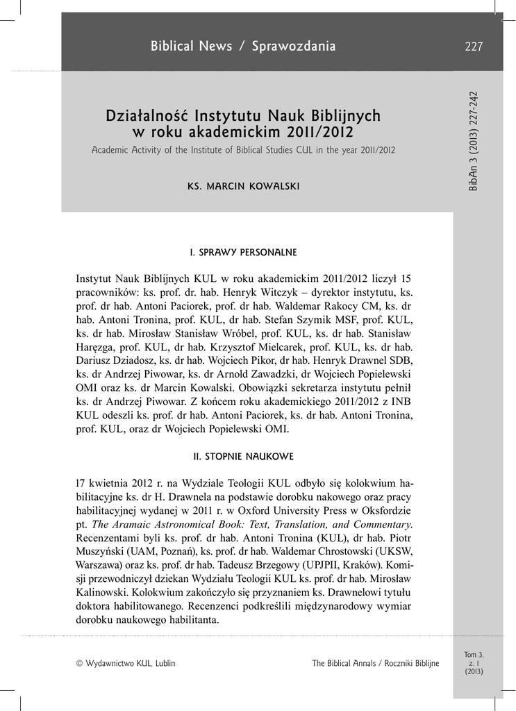 Działalność Instytutu Nauk Biblijnych w roku akademickim 2011/2012 Academic Activity of the Institute of Biblical Studies CUL in the year 2011/2012 KS. MARCIN KOWALSKI 227 BibAn 3 (2013) 227-242 Biblical News / Sprawozdania I. SPRAWY PERSONALNE Instytut Nauk Biblijnych KUL w roku akademickim 2011/2012 liczył 15 pracowników: ks. prof. dr. hab. Henryk Witczyk – dyrektor instytutu, ks. prof. dr hab. Antoni Paciorek, prof. dr hab. Waldemar Rakocy CM, ks. dr hab. Antoni Tronina, prof. KUL, dr hab. Stefan Szymik MSF, prof. KUL, ks. dr hab. Mirosław Stanisław Wróbel, prof. KUL, ks. dr hab. Stanisław Haręzga, prof. KUL, dr hab. Krzysztof Mielcarek, prof. KUL, ks. dr hab. Dariusz Dziadosz, ks. dr hab. Wojciech Pikor, dr hab. Henryk Drawnel SDB, ks. dr Andrzej Piwowar, ks. dr Arnold Zawadzki, dr Wojciech Popielewski OMI oraz ks. dr Marcin Kowalski. Obowiązki sekretarza instytutu pełnił ks. dr Andrzej Piwowar. Z końcem roku akademickiego 2011/2012 z INB KUL odeszli ks. prof. dr hab. Antoni Paciorek, ks. dr hab. Antoni Tronina, prof. KUL, oraz dr Wojciech Popielewski OMI. II. STOPNIE NAUKOWE 17 kwietnia 2012 r. na Wydziale Teologii KUL odbyło się kolokwium habilitacyjne ks. dr H. Drawnela na podstawie dorobku nakowego oraz pracy habilitacyjnej wydanej w 2011 r. w Oxford University Press w Oksfordzie pt. The Aramaic Astronomical Book: Text, Translation, and Commentary. Recenzentami byli ks. prof. dr hab. Antoni Tronina (KUL), dr hab. Piotr Muszyński (UAM, Poznań), ks. prof. dr hab. Waldemar Chrostowski (UKSW, Warszawa) oraz ks. prof. dr hab. Tadeusz Brzegowy (UPJPII, Kraków). Komisji przewodniczył dziekan Wydziału Teologii KUL ks. prof. dr hab. Mirosław Kalinowski. Kolokwium zakończyło się przyznaniem ks. Drawnelowi tytułu doktora habilitowanego. Recenzenci podkreślili międzynarodowy wymiar dorobku naukowego habilitanta. © Wydawnictwo KUL, Lublin The Biblical Annals / Roczniki Biblijne Tom 3, z. 1 (2013) 228 Biblical News Ks. Marcin Kowalski 8 stycznia 2011 r. w École Biblique et Archéologique Française w Jerozolimie ks. Adam Kubiś (od października 2012 r. zatrudniony w INB KUL) otrzymał tytuł doktora nauk biblijnych, prezentując rozprawę doktorską pt. The Use of Zechariah in the Gospel of John. Promotorem rozprawy był prof. Luc Devillers OP. Recenzentami byli prof. Hervé Ponsot OP, prof. Étienne Nodet OP, prof. Frédéric Manns OFM i prof. Alain Marchadour AA. Zrewidowana i uaktualniona rozprawa ukazała się w formie książkowej: The Book of Zechariah in the Gospel of John (Études bibliques: Nouvelle serie 64; Pendé: J. Gabalda et Cie, 2012). 19 listopada 2011 r. w École Biblique et Archéologique Française w Jerozolimie obyła się publiczna obrona pracy doktorskiej Krzysztofa Napory SCJ (od października 2012 r. zatrudnionego w INB KUL). Tytuł dysertacji naukowej brzmiał: The Concept of Separation in the Flood Narrative (Gen. 6–9). Promotorem pracy był prof. Krzysztof Sonek OP. W komisji zasiedli również recenzenci: prof. Adrian Schenker OP, prof. Maurice Gilbert SJ i prof. Étienne Nodet OP. III. SYMPOZJA NAUKOWE ORGANIZOWANE W INSTYTUCIE NAUK BIBLIJNYCH KUL Pierwszy Kongres Biblijny i sesja naukowa „Biblia kodem kulturowym Europy” (UKSW, Warszawa, 28–30 października 2011) Kongres został zorganizowany wspólnie przez INB KUL oraz Dzieło Biblijne im. Jana Pawła II. Gościem honorowym był JE ks. kard. Gianfranco Ravasi, przewodniczący Papieskiej Komisji do spraw Kultury. Bogaty program 1. Kongresu Biblijnego obejmował sesję naukową, prezentacje książek, przedstawienie teatralne oraz odczyty. Podczas sesji naukowej 28 października 2011 r. zaprezentowano następujące referaty: Sesja I – przewodniczył ks. dr hab. Zdzisław Pawłowski (UMK, Toruń) – Ks. prof. dr hab. Henryk Witczyk (KUL, Lublin), „Psalm 137 w kantacie An Wasserflüssen Babylon J.S. Bacha i w Nabucco G. Verdiego”. – Ks. dr Marcin Kowalski, „Hiob wzywa Zmartwychwstałego – ujęcie dramatu zbawienia w Mesjaszu G.F. Haendla”. – Ks. prof. dr hab. Waldemar Chrostowski (UKSW, Warszawa), „«Nad rzekami Babilonu» (Ps 137,1) – polskie reminiscencje pieśni żydowskich wygnańców”. Sesja II – przewodniczył ks. dr hab. Sławomir Stasiak (PFT, Wrocław) Vol. 3, no. 1 (2013) The Biblical Annals / Roczniki Biblijne 229 – Ks. prof. dr hab. Ryszard Knapiński (KUL, Lublin), „Biblia w egzegezie sztuki – słowo obrazem się staje”. – Ks. dr hab. Stefan Szymik (KUL, Lublin), „Wieża Babel P. Breughla czytana oczami biblisty”. – Ks. dr hab. Marek Lis (UO, Opole), „Biblia w Dekalogu Krzysztofa Kieślowskiego i milczenie teologów”. – Ks. dr Wojciech Popielewski (KUL, Lublin), „Od Siódmej pieczęci I. Bergmana aż po Legion C. Stewarta: czego laicka sztuka filmowa szuka w Apokalipsie św. Jana?” Sesja III – przewodniczył ks. prof. dr hab. Antoni Tronina (KUL, Lublin) – Ks. dr hab. Zdzisław Pawłowski (UMK, Toruń), „Historia Józefa egipskiego w powieści Thomasa Manna Józef i jego bracia”. – Ks. prof. dr hab. Waldemar Rakocy (KUL, Lublin), „Afirmacja Pawłowej nauki o usprawiedliwieniu z wiary w Fauście J. Goethego i jej meandry w Braciach Karamazow F. Dostojewskiego”. – Ks. dr Arnold Zawadzki (KUL, Lublin), „Biblijne pojęcie «odkupienia» w poezji Z. Herberta”. Sesja IV – przewodniczył ks. dr Wojciech Węgrzyniak (UPJP II, Kraków) – Dr Tomasz Terlikowski, „Biblia w twórczości F. Dostojewskiego”. – Ks. dr Bartosz Adamczewski (UKSW, Warszawa), „Ewangelia według św. Marka jako «opus classicum» literatury chrześcijańskiej Europy”. – Ks. dr hab. Mirosław Wróbel (KUL, Lublin), „Biblijne inspiracje w twórczości J. Słowackiego”. – Ks. dr Stefan Radziszewski (KUL, Lublin – Kielce), „«Emaus to dla niej pusty dźwięk». O podróży z marksizmu do Biblii, czyli Anny Kamieńskiej portret biblijny”. Sprawozdani a Działalność Instytutu Nauk Biblijnych w roku akademic