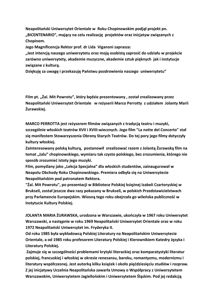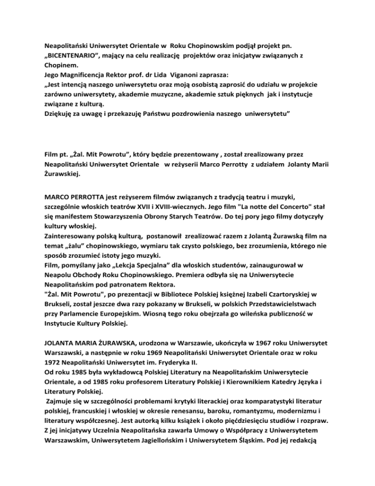 Neapolitański Uniwersytet Orientale w Roku Chopinowskim podjął projekt pn. „BICENTENARIO”, mający na celu realizację projektów oraz inicjatyw związanych z Chopinem. Jego Magnificencja Rektor prof. dr Lida Viganoni zaprasza: „Jest intencją naszego uniwersytetu oraz moją osobistą zaprosić do udziału w projekcie zarówno uniwersytety, akademie muzyczne, akademie sztuk pięknych jak i instytucje związane z kulturą. Dziękuję za uwagę i przekazuję Państwu pozdrowienia naszego uniwersytetu” Film pt. „Żal. Mit Powrotu”, który będzie prezentowany , został zrealizowany przez Neapolitański Uniwersytet Orientale w reżyserii Marco Perrotty z udziałem Jolanty Marii Żurawskiej. MARCO PERROTTA jest reżyserem filmów związanych z tradycją teatru i muzyki, szczególnie włoskich teatrów XVII i XVIII-‐wiecznych. Jego film "La notte del Concerto" stał się manifestem Stowarzyszenia Obrony Starych Teatrów. Do tej pory jego filmy dotyczyły kultury włoskiej. Zainteresowany polską kulturą, postanowił zrealizować razem z Jolantą Żurawską film na temat „żalu” chopinowskiego, wymiaru tak czysto polskiego, bez zrozumienia, którego nie sposób zrozumieć istoty jego muzyki. Film, pomyślany jako „Lekcja Specjalna” dla włoskich studentów, zainaugurował w Neapolu Obchody Roku Chopinowskiego. Premiera odbyła się na Uniwersytecie Neapolitańskim pod patronatem Rektora. "Żal. Mit Powrotu", po prezentacji w Bibliotece Polskiej księżnej Izabeli Czartoryskiej w Brukseli, został jeszcze dwa razy pokazany w Brukseli, w polskich Przedstawicielstwach przy Parlamencie Europejskim. Wiosną tego roku obejrzała go wileńska publiczność w Instytucie Kultury Polskiej. JOLANTA MARIA ŻURAWSKA, urodzona w Warszawie, ukończyła w 1967 roku Uniwersytet Warszawski, a następnie w roku 1969 Neapolitański Uniwersytet Orientale oraz w roku 1972 Neapolitański Uniwersytet im. Fryderyka II. Od roku 1985 była wykładowcą Polskiej Literatury na Neapolitańskim Uniwersytecie Orientale, a od 1985 roku profesorem Literatury Polskiej i Kierownikiem Katedry Języka i Literatury Polskiej. Zajmuje się w szczególności problemami krytyki literackiej oraz komparatystyki literatur polskiej, francuskiej i włoskiej w okresie renesansu, baroku, romantyzmu, modernizmu i literatury współczesnej. Jest autorką kilku książek i około pięćdziesięciu studiów i rozpraw. Z jej inicjatywy Uczelnia Neapolitańska zawarła Umowy o Współpracy z Uniwersytetem Warszawskim, Uniwersytetem Jagiellońskim i Uniwersytetem Śląskim. Pod jej redakcją ukazały się zbiorowe tomy ukazujące literaturę polską od Kochanowskiego do Gałczyńskiego w porównawczym kontekście europejskim. W roku 1997 za osiągnięcia naukowe i organizowanie współpracy naukowej i kulturalnej z zagranicą został jej przyznany przez Prezydenta Włoch "Krzyż Komandorski za zasługi dla Republiki Włoskiej". W roku 1998 w Wenecji otrzymała Złoty Medal "Najlepsi w Roku" w dziedzinie krytyki literackiej. W roku 2003 została laureatką "Nagrody Sociéte Européenne de Culture. Centre Polonais" za zasługi położone dla dobra kultury polskiej poza granicami Kraju.Jest członkiem "Sociéte Européenne De Culture", "Bolońskiej Akademii Mickiewiczowskiej" oraz "Akademie de la Mediterranèe". Honorowy Członek Budowy Pomnika Bohaterów Monte Cassino w Warszawie, honorowy Członek Towarzystwa Przyjaźni Polsko-‐Włoskiej.