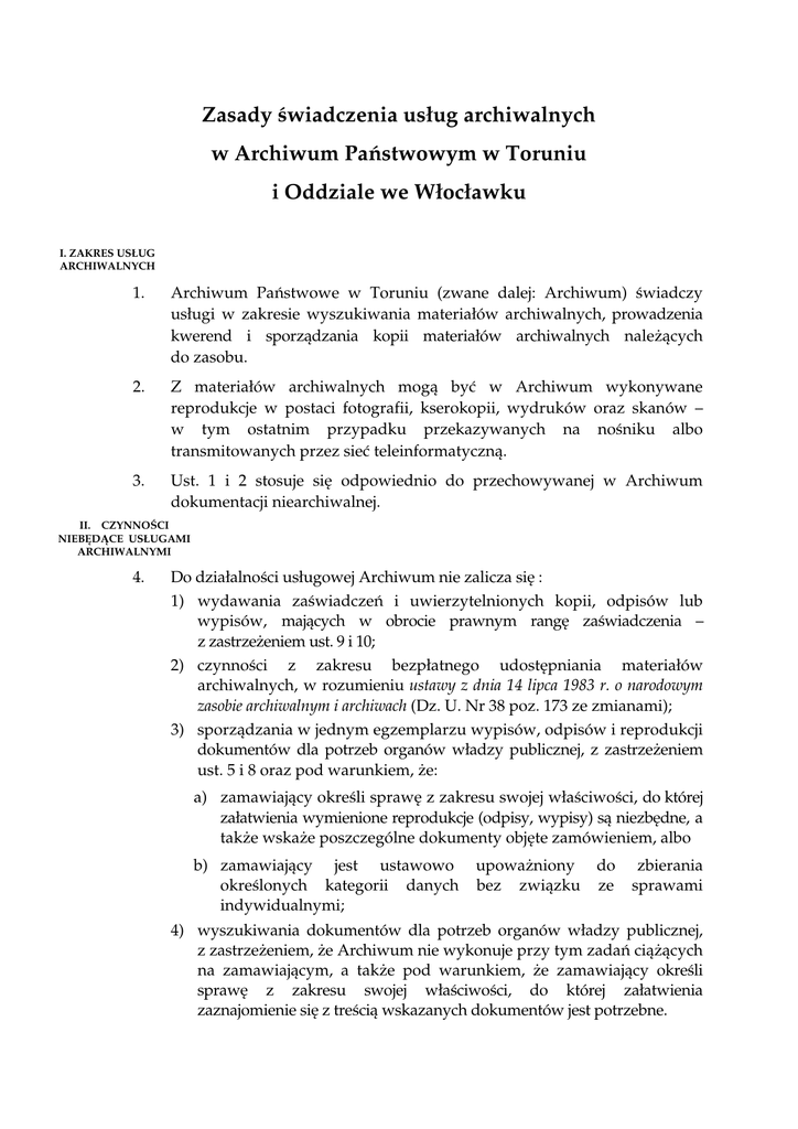 Zasady świadczenia usług archiwalnych w Archiwum Państwowym w Toruniu i Oddziale we Włocławku I. ZAKRES USŁUG ARCHIWALNYCH 1. Archiwum Państwowe w Toruniu (zwane dalej: Archiwum) świadczy usługi w zakresie wyszukiwania materiałów archiwalnych, prowadzenia kwerend i sporządzania kopii materiałów archiwalnych należących do zasobu. 2. Z materiałów archiwalnych mogą być w Archiwum wykonywane reprodukcje w postaci fotografii, kserokopii, wydruków oraz skanów – w tym ostatnim przypadku przekazywanych na nośniku albo transmitowanych przez sieć teleinformatyczną. 3. Ust. 1 i 2 stosuje się odpowiednio do przechowywanej w Archiwum dokumentacji niearchiwalnej. II. CZYNNOŚCI NIEBĘDĄCE USŁUGAMI ARCHIWALNYMI 4. Do działalności usługowej Archiwum nie zalicza się : 1) wydawania zaświadczeń i uwierzytelnionych kopii, odpisów lub wypisów, mających w obrocie prawnym rangę zaświadczenia – z zastrzeżeniem ust. 9 i 10; 2) czynności z zakresu bezpłatnego udostępniania materiałów archiwalnych, w rozumieniu ustawy z dnia 14 lipca 1983 r. o narodowym zasobie archiwalnym i archiwach (Dz. U. Nr 38 poz. 173 ze zmianami); 3) sporządzania w jednym egzemplarzu wypisów, odpisów i reprodukcji dokumentów dla potrzeb organów władzy publicznej, z zastrzeżeniem ust. 5 i 8 oraz pod warunkiem, że: a) zamawiający określi sprawę z zakresu swojej właściwości, do której załatwienia wymienione reprodukcje (odpisy, wypisy) są niezbędne, a także wskaże poszczególne dokumenty objęte zamówieniem, albo b) zamawiający jest ustawowo określonych kategorii danych indywidualnymi; upoważniony bez związku do ze zbierania sprawami 4) wyszukiwania dokumentów dla potrzeb organów władzy publicznej, z zastrzeżeniem, że Archiwum nie wykonuje przy tym zadań ciążących na zamawiającym, a także pod warunkiem, że zamawiający określi sprawę z zakresu swojej właściwości, do której załatwienia zaznajomienie się z treścią wskazanych dokumentów jest potrzebne. 2 III. SZCZEGÓLNE ZASTOSOWANIA CENNIKA 5. Kopie oraz odpisy zamawiane do własnych celów urzędowych przez organy władzy publicznej w Polsce i krajach Unii Europejskiej – z wyłączeniem sądów, organów prokuratury i polskich urzędów konsularnych – wykonuje się nieodpłatnie w ramach limitu reprodukcji 10 dokumentów lub odpisów (wypisów) 2 dokumentów – w odniesieniu do określonej sprawy. Za ewentualne dalsze reprodukcje lub odpisy do tej samej sprawy pobiera się należność według stawek podanych w ust. 22 pkt 1 i 2. 6. Kopie oraz odpisy zamawiane do własnych celów urzędowych przez sądy, organy prokuratury i polskie urzędy konsularne wykonuje się nieodpłatnie. 7. Kopie oraz odpisy zamawiane do własnych celów urzędowych przez obce przedstawicielstwa w Polsce wykonywane są na ogólnych zasadach niniejszego zarządzenia chyba, że umowy międzynarodowe lub ustawy stanowią inaczej. 8. W przypadkach, gdy realizacja zamówienia złożonego przez organ władzy publicznej pociągnąć może za sobą znaczne koszty, Archiwum ustali z zamawiającym pokrycie przezeń całości albo części niezbędnych nakładów. 9. Za wykonanie uwierzytelnionych kopii lub odpisów równorzędnych w obrocie prawnym z zaświadczeniami pobierana jest należność – za kopie w wysokości 50% ceny określonej w ust. 22 pkt 1, a za odpisy – w wysokości 33% ceny określonej w ust. 22 pkt 2. 10. W sprawach wydawania zaświadczeń oraz równorzędnych z nimi dokumentów przeznaczonych do obrotu prawnego (uwierzytelnionych kopii lub odpisów) Archiwum może kwalifikować wyszukiwanie dokumentów jako mające charakter usługi i pobierać przychody z tego tytułu – o ile wnioskodawca nie jest w stanie wskazać wystawcy bądź przybliżonego (z dokładnością do jednego roku) czasu powstania określonego przezeń dokumentu albo innych danych niezbędnych do identyfikacji dokumentu, a ich ustalenie przez Archiwum wymaga znacznego nakładu pracy. 11. Ust. 10 nie ma zastosowania do spraw emerytalno-rentowych, które są w całości załatwiane nieodpłatnie. 12. Należności określone w ust. 9 i 10 pobiera się niezależnie od ewentualnych opłat skarbowych, włącznie z opłatą za uwierzytelnienie, wymaganych na podstawie odrębnych przepisów. IV. USTALENIE ZAKRESU I CHARAKTERU ŚWIADCZEŃ 13. Usługi archiwalne – z wyłączeniem usług realizowanych w związku z wydawaniem zaświadczeń i równorzędnych z nimi dokumentów – świadczone są na podstawie zamówienia, które powinno zawierać co najmniej dane o zamawiającym i jego potrzebach oraz szczegółowe określenie przedmiotu usługi, formy zapłaty należności, a w razie 3 potrzeby – również szczególnych wymogów technicznych, według których zamówienie powinno być wykonane. 14. Przed podjęciem czynności z zakresu usług archiwalnych Archiwum powiadamia wnioskodawcę o odpłatnym charakterze tych świadczeń i w miarę możności określa przybliżoną wysokość końcowej należności, z uwzględnieniem ust. 21. V. ZALICZKI .................. 15. Podjęcie działalności usługowej może zostać uzależnione od uiszczenia z góry należności bądź wpłacenia zaliczki na jej poczet. 16. Działalność usługowa związana z wydawaniem zaświadczeń i równorzędnych z nimi dokumentów może być podjęta – jeśli otrzymane podanie ma braki, o których mowa w ust. 10 – po uprzednim wezwaniu wnioskodawcy do uzupełnienia podania, pod rygorem pozostawienia go bez dalszego biegu, lub uiszczenia z góry należności bądź wpłacenia zaliczki na jej poczet – za ustalenie przez Archiwum brakujących składników podania. 17. Archiwum może zażądać wniesienia zaliczki na poczet należności w szczególności wówczas, jeżeli świadczenie usług pociąga za sobą zaangażowanie znacznych środków. Zaliczka jest pobierana – w wysokości nie mniejszej niż 25% przewidywanej końcowej należności – zwłaszcza, gdy nale
