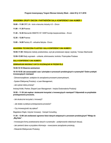Program towarzyszący Targom Warsaw Industry Week – dzień III tj. 9.11.2016 AKADEMIA GRUPY ENCON I PARTNERÓW SALA KONFERENCYJNA NUMER 1 10.00 – 11.00 OPC UA - krok w kierunku Industry 4.0 – Encon 11.00 – 11.30 Przerwa 11.30 – 12.30 Sterowniki SIMATIC S7-1200F-funckje bezpieczeństwa – Encon 12.30 – 13.00 Przerwa 13.00 – 14.00 Factory IO - wirtualna fabryka - Encon AKADEMIA TECHNICZNA PLASTIGO SALA KONFERENCYJNA NUMER 3 10:00–11:00 Efektywne metody przetwórstwa, czyli jak produkować więcej i szybciej. Tomasz Stachowiak 12:00–13:00 Wady wyprasek – unikanie, eliminowanie, kontrola. Przemysław Postawa SALA KONFERENCYJNA NUMER 5 SEMINARIUM INNOWACYJNYCH ROZWIĄZAŃ W PRZEMYŚLE 10:00-10:10 Otwarcie seminarium 10:10-10:50 Jak zaoszczędzić czas i pieniądze w procesach produkcyjnych w przemyśle? Dobre praktyki innowacyjnych rozwiązań - Zdroworozsądkowe podejście do zarządzania procesami przemysłowymi, - System Efektywnej Produkcji a Lean Management, - Jak wybrać dobrą zmianę? Andrzej Krótki, Partner, Ekspert Lean Management - Instytut Doskonalenia Produkcji 10:50 – 11:30 Jak mądrze i skutecznie korzystać z innowacyjnych rozwiązań? Odpowiedź na przykładzie prototypowania procesów, - Jak skutecznie korzystać z innowacji? - Jak działa w praktyce prototypowania procesów? - Czy innowacyjność się opłaca? Magdalena Wąsik, Inżynier Innowacji - Cempel Consulting 11:30 – 12:00 Jak analizować ogromne ilości danych związanych z procesem produkcyjnym? Wstęp do „Big Data”. - Innowacyjne formy przetwarzania danych w przemyśle – podejmowanie właściwych decyzji, - Jak zamienić dane w przydatne informacje – nowoczesne zarządzanie produkcją - Wskaźniki Efektywności Produkcji, Grzegorz Pawłowski, Konsultant Handlowy - DSR Solutions 12:00 – 12:30 Innowacyjne podejście do zasobów ludzkich - Przewaga outsorcingu zasobów ludzkich w przemyśle - Korzyści alternatywnych możliwości zatrudnienia, - Wzmocnienie procesów produkcyjnych odpowiednimi zasobami ludzkimi Bartosz Loch, właściciel, Michał Gros, Dyrektor Sprzedaży - Workagency Profi-HR, 12:30 – 13:00 Panel dyskusyjny z udziałem prelegentów 13:00 – 14:30 Gra symulacyjna K3E – optymalizacja procesów produkcyjnych w przemyśle prowadzi Andrzej Krótki, Partner, Ekspert Lean Management - Instytut Doskonalenia Produkcji STREFA LASERY 4:0 – SEMINARIUM FIRMY GRAVOTECH 10.00 Powitanie gości seminarium 10.15–11.00 Rozwiązania w zakresie znakowania i identyfikacji produktów 11.15–12.15 Technologie znakowania laserowego 12.15–12.30 Zastosowanie materiałów grawerskich w grawerowaniu laserowym 12.45–13.15 Przerwa 13.15–15.30 Pokazy znakowania i spotkania przy stanowiskach tematycznych. Znakowanie materiałów organicznych typu karton, drewno, szkło Wysokowydajne znakowanie stali Nieinwazyjne znakowanie tworzyw Zastosowanie modułów: 3D, AutoFocous i Vision Manager w produkcji Seryjna produkcja tabliczek i oznaczeń na laserach typu gantry 15.45 Podsumowanie seminarium. Czas na pytania i odpowiedzi.