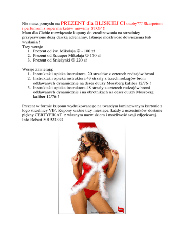 Nie masz pomysłu na PREZENT dla BLISKIEJ CI osoby??? Skarpetom i perfumom z supermarketów mówimy STOP !! Mam dla Ciebie rozwiązanie kupony do zrealizowania na strzelnicy przyprawione dużą dawką adrenaliny. Istnieje możliwość dowiezienia lub wysłania ! Trzy wersje 1. Prezent od św. Mikołaja ☺ - 100 zł 2. Prezent od Suuuper Mikołaja ☺ 170 zł 3. Prezent od Śnieżynki ☺ 220 zł Wersje zawierają: 1. Instruktaż i opieka instruktora, 20 strzałów z czterech rodzajów broni 2. Instruktaż i opieka instruktora 43 strzały z trzech rodzajów broni oddawanych dynamicznie na deser duuży Mossberg kaliber 12/76 ! 3. Instruktaż i opieka instruktora 48 strzały z czterech rodzajów broni oddawanych dynamicznie i na obrotnikach na deser duuży Mossberg kaliber 12/76 ! Prezent w formie kuponu wydrukowanego na twardym laminowanym kartonie z logo strzelnicy VIP. Kupony ważne trzy miesiące, każdy z uczestników dostanie piękny CERTYFIKAT z własnym nazwiskiem i możliwość sesji zdjęciowej. Info Robert 501923333