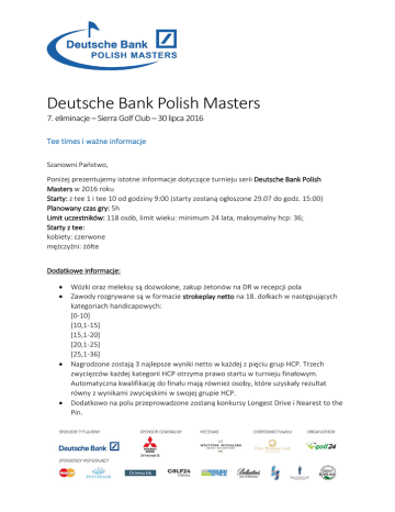 Deutsche Bank Polish Masters 7. eliminacje – Sierra Golf Club – 30 lipca 2016 Tee times i ważne informacje Szanowni Państwo, Poniżej prezentujemy istotne informacje dotyczące turnieju serii Deutsche Bank Polish Masters w 2016 roku Starty: z tee 1 i tee 10 od godziny 9:00 (starty zostaną ogłoszone 29.07 do godz. 15:00) Planowany czas gry: 5h Limit uczestników: 118 osób, limit wieku: minimum 24 lata, maksymalny hcp: 36; Starty z tee: kobiety: czerwone mężczyźni: żółte Dodatkowe informacje: Wózki oraz meleksy są dozwolone, zakup żetonów na DR w recepcji pola Zawody rozgrywane są w formacie strokeplay netto na 18. dołkach w następujących kategoriach handicapowych: [0-10] [10,1-15] [15,1-20] [20,1-25] [25,1-36] Nagrodzone zostają 3 najlepsze wyniki netto w każdej z pięciu grup HCP. Trzech zwycięzców każdej kategorii HCP otrzyma prawo startu w turnieju finałowym. Automatyczna kwalifikację do finału mają również osoby, które uzyskały rezultat równy z wynikami zwycięskimi w swojej grupie HCP. Dodatkowo na polu przeprowadzone zostaną konkursy Longest Drive i Nearest to the Pin. W turnieju obowiązuje limit uderzeń +5 powyżej PAR danego dołka. W przypadku przekroczenia limitu, zawodnik ma możliwość podniesienia piłki i zapisania na karcie wyników PAR+5 (nie skreślamy dołków). Zasada ta ma za zadanie przyspieszenie gry. Uwaga - jeśli gracz chce, aby jego wynik turniejowy został zaliczony do rankingu PZG, stosowanie powyższej zasady jest zabronione. W związku ze zmianami w systemie HCP PZG w tym roku w turniejach mogą grać tylko amatorzy posiadający aktywną kartę HCP (opłacona składka na sezon 2016 do PZG). Prosimy upewnić się, że Państwa HCP jest aktywny, ponieważ brak dopełnienia tej formalności będzie skutkował grą z HCP = 0. W przypadku wątpliwości, co do aktywności HCP prosimy skorzystać ze strony pzgolf.pl (zakładka: Zawodnicy) lub skontaktować się ze swoim klubem macierzystym, który prowadzi Państwa HCP. Dopuszczalny limit HCP wynosi 36. Osoby z hcp wyższym grają z HCP=36. Finał turnieju Deutsche Bank Polish Masters odbędzie się w dniach 23-25 września na dwóch podwarszawskich polach: First Warsaw Golf&CC oraz Sobienie Królewskie Golf&CC. Po dwóch dniach nastąpi cut, a ostatnia runda będzie miała miejsce na First Warsaw Golf&CC. Trzech zwycięzców finałowych rozgrywek z każdej kategorii hcp otrzyma prawo gry w zagranicznym finale, którego miejsce i termin zostanie podany wkrótce. Szczegółowe informacje oraz regulamin znajdują się na stronie www.polishmasters.pl Harmonogram zawodów: 08:00 - 11:00 Rejestracja zawodników 09:00 - 11:00 Starty turnieju Deutsche Bank Polish Masters 14:00 - 18:00 Catering w domku klubowym 14:00 - 17:00 Nauka gry w golfa dla zaproszonych gości 14:30 - 16:30 Planowane ukończenie turnieju przez zawodników 17:30 - 18:00 Zakończenie turnieju i ceremonia wręczenia nagród Kontakty: Dyrektor turnieju: Anna Maliszewska, tel. 664 941 994 Sędzia turnieju: Mirosław Domosławski tel. 502 756 939 Tee times TEE 1 09:00 09:10 09:20 09:30 09:40 TEE 10 Lech Sokołowski Andrzej Macygon Cezary Łosko Piotr Mroczek Oksana Wojtkiewicz Tadeusz Leszczyński Piotr Robełek Małgorzata Ścisk Henryk Konopka Leszek Pohl Michał Poniż Wiktor Wilandt Bogdan Bigus Mateusz Babij Dariusz Koss Grzegorz Czelej Masanori Iwasaki Tomasz Onichowski Masaharu Takada Paweł Purgal Kazuhiro Abe Mariusz Pełka Osamu Ishikawa Wojciech Zasuwik Piotr Ostaszewski Jarosław Szwarc Piotr Klemba Marcin Gniazdowski Antoni Wierciński Andrzej Regliński Conny Lind Lech Baranowski Tomasz Ładocha Damian Fernezy Andrzej Dembowski Bartłomiej Babij Artur Dudek Michał Ścisk Tomasz Martko Hanna Pałdyna 09:00 09:10 09:20 09:30 09:40 09:50 10:00 10:10 10:20 10:30 10:40 Mateusz Kusznierewicz Agnieszka Jakubowska Jacek Gulmantowicz Katarzyna Liszewska Jan Kolański Marek Kamiński Maciej Sus Luciano D'Amico Bogdan Szpilman Marcin Benbenek Krzysztof Jankowski Jan Czachowicz Jarosław Sroka Jacek Liszewski Waldemar Łazarczyk Mirosław Brańka Robert Karbowniczek Yann Guen Tomasz Wolf Sławomir Huniewicz Dariusz Bobiński Kamil Juszczyński Piotr Mondalski Stephane Rauber Anna Rydzkowska Gracjan Osak Barbara Bobińska Lucyna Gieldon Marzena Szpilman Małgorzata Buca - Nowosad Iwona Sroka Janusz Morawiak Kazimierz Gieldon Zbyszek Puwalski Marcin Gregorowicz Paweł Piątek Krzysztof Przeździecki Waldemar Żuk Cezary Skotak Joanna Łukaszewicz Ernest Kiruja Krzysztof Borowski Jan Łabas Dariusz Knapik Jacek Ciesiołkiewicz Bożena Dekert Sunny Ahuja Paulina Roszkowska 09:50 10:00 10:10 10:20 10:30 10:40 10:50 11:00 Mariusz Orliński Ewa Kacprzak-Skotak Ireneusz Bill Małgorzata Szrubkowska Ryszard Lesiński Mirosław Kęcik Ryszard Sobolewski Wojciech Wąsowicz Jerzy Czuczman Alicja Poborca Wojciech Sadoch Danuta Freiherr Wiesław Orzechowski Piotr Gurgul Mieczysław Pohl Alicja Wałaszewska Krzysztof Zienkiewicz Żaneta MendykaSadoch 11:10 Andrzej 11:20 11:30 Łukaszewicz 10:50 11:00 11:10 Elżbieta Czuczman Krystyna Lind Magdalena Alama-Bertel Andrzej Syldatk Anna Milka-Lisiecka Sławomir Bajczyk Zdzisław Radelski Ireneusz Kwiatkowski Marian Kempa Adam Górko Aleksandra Bąk Marcin Wiewióra Tomasz Rek