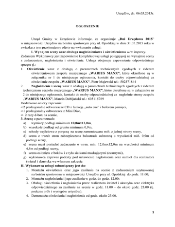 Urzędów, dn. 06.05.2015r. OGŁOSZENIE Urząd Gminy w Urzędowie informuje, że organizuje „Dni Urzędowa 2015” w miejscowości Urzędów na boisku sportowym przy ul. Opolskiej w dniu 31.05.2015 roku w związku z tym przyjmujemy oferty na wykonanie usługi: I. Wynajem sceny oraz obsługa nagłośnieniowa i oświetleniowa w/w imprezy. Zadaniem Wykonawcy jest zapewnienie kompleksowej usługi polegającej na wynajmie sceny z zadaszeniem, nagłośnienia i oświetlenia. Usługa obejmuje zapewnienie odpowiedniego sprzętu tj.: 1. Oświetlenie wraz z obsługą o parametrach technicznych zgodnych z riderem oświetleniowym zespołu muzycznego „WARIUS MANX”, które określone są w załączniku nr 1 do niniejszego ogłoszenia, kontakt do osoby odpowiedzialnej za oświetlenie zespołu „WARIUS MANX”, Piotr Majewski tel.: 502371844 2. Nagłośnienie i scenę wraz z obsługą o parametrach technicznych zgodnych z riderem technicznym zespołu muzycznego „WARIUS MANX”, które określone są w załączniku nr 2 do niniejszego ogłoszenia, kontakt do osoby odpowiedzialnej za nagłośnie strony zespołu „WARIUS MANX”, Marcin Dobijański tel.: 605115769 Dodatkowo należy zapewnić: • 2 profesjonalne odtwarzacze CD z funkcją „auto cue” i buforem pamięci, • 1 profesjonalny odtwarzacz z Mini Disc, • 2 razy d-box na scenie, 3. Scenę o parametrach: a) wymiary podłogi minimum 10,0mx12,0m, b) wysokość podłogi od gruntu minimum 0,9m, c) schody wejściowe z poręczą na scenę zamontowane miń. z jednej strony sceny, d) scena z trzech stron zabezpieczona balustrada ochronną o wysokości miń. 0,9m od podłogi sceny, e) scena musi posiadać zadaszenie o wym. min. 12,0mx12,0m na wysokości minimum 4,5m od podłogi sceny, f) scena osłonięta z boków i z tyłu siatkami maskującymi (czarnymi), g) wykonawca zapewni podesty pod ustawienie nagłośnienia oraz namiot dla realizatora świateł i akustyka we własnym zakresie. II. Wykonawca usługi zobowiązany jest do: 1. Montażu oświetlenia oraz jego zasilania na scenie z zadaszeniem usytuowanej na boisku sportowym w miejscowości Urzędów przy ul. Opolskiej do godz. 11.00; 2. Montażu nagłośnienia i jego zasilania w godz. do godz. 12.00; 3. Obsługi oświetlenia i nagłośnienia przez realizatora świateł i akustyka oraz elektryka odpowiedzialnego za zasilanie na scenie w godz. 11.00 – do około godz. 23.00 (tj. podczas prób i występów artystów); 4. Demontażu oświetlenia i nagłośnienia od godz. około 23.00. 1 5. ustawienie sceny należy wykonać w miejscu zgodnie z planem organizacyjnym usytuowania na boisku sportowym w miejscowości Urzędów, ul. Opolska na placu przy boisku do godz. 10:00 dnia 31.05.2015 roku. 6. Podniesienie dachu po zamontowaniu oświetlenia oraz banera reklamowego tj. około godz. 11:00 dnia 31.05.2015 roku. 7. Czas wynajmu sceny od godz. 10:00 do godz. 23.00 dnia 31.05.2015 roku. 8. Dostarczenia sceny, sprzętu nagłośnieniowo - oświetleniowego transportem własnym wykonawcy oraz na koszt własny wykonawcy. 9. Za jakość użytych materiałów i szkody powstałe w wyniku nienależycie wykonanej usługi określonej jw. odpowiada Wykonawca. 10. Zamawiający zastrzega, że Wykonawca musi posiadać niezbędną wiedzę i doświadczenie oraz dysponuje potencjałem technicznym i osobami zdolnymi do wykonania zamówienia tj.: a) posiada sprzęt i urządzenia niezbędne do wykonania usługi, b) posiada dostateczną ilość pracowników do wykonania usługi, c) posiada odpowiednie środki transportu, d) posiada ubezpieczenie w zakresie odpowiedzialności cywilnej w zakresie świadczenia w/w usługi. Wartość polisy miń na kwotę 100 000,00zł III. Zamawiający zapewnia zasilenie elektryczne dla sceny w odległości 40mb w godz. 10:00 do 24:00 dnia 31.05.2015 roku. Miejsce wykonania usługi – plac przy boisku sportowym ul. Opolska w Urzędowie. Uwaga - miejsce pod ustawienie sceny jest utwardzone płytami ażurowymi typu YOMB. W ofertach należy podać: 1. Nazwę firmy. 2. Cenę brutto za wykonanie w/w usługi. 3. Kopię niniejszego ogłoszenia z dopiskiem: „Akceptuję warunki niniejszego ogłoszenia”. 4. Kryterium wyboru ofert – cena 100%. Dodatkowe informacje można uzyskać pod nr tel. (081)8225052 Zainteresowane podmioty gospodarcze mogą składać oferty do dnia 14.05.2015r. w kancelarii Urzędu Gminy w Urzędowie, ul. Rynek 26, 23 - 250 Urzędów do godziny 14:00 w zamkniętych kopertach z dopiskiem „Oferta na scenę, nagłośnienie i oświetlenie. Nie otwierać do godz. 14:15 dnia 14.05.2015r.” Otwarcie ofert odbędzie się dnia 14.05.2015 roku o godzinie 14:15. Informacje o rozstrzygnięciu ofert pod nr telefonu 081 8225 052. UWAGA: Rozpatrywane będą oferty tylko kompletne według w/w wykazu. Wójt Gminy Urzędów mgr inż. Jan Woźniak 2