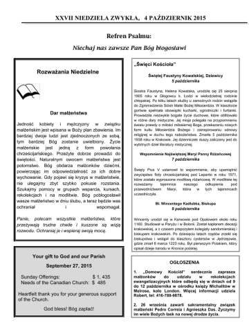 XXVII NIEDZIELA ZWYKŁA, 4 PAŹDZIERNIK 2015 Refren Psalmu: Niechaj nas zawsze Pan Bóg błogosławi „Święci Kościoła” Rozważania Niedzielne Dar małżeństwa Jedność kobiety i mężczyzny w związku małżeńskim jest wpisana w Boży plan zbawienia. Im bardziej dwoje ludzi jest zjednoczonych ze sobą, tym bardziej Bóg zostanie uwielbiony. Życie małżeńskie jest jedną z form powołania chrześcijańskiego. Przeżyte dobrze prowadzi do świętości. Naturalnym owocem małżeństwa jest potomstwo. Bóg obdarza małżonków dziećmi, powierzając im odpowiedzialność za ich dobre wychowanie. Gdy pojawi się kryzys w małżeństwie, nie ulegajmy zbyt szybko pokusie rozstania. Szukajmy pomocy w grupach wsparcia, kursach, rekolekcjach i na modlitwie. Bóg pobłogosławił wasze małżeństwo w dniu ślubu, a teraz będzie was ochraniał i wspomagał. Panie, polecam wszystkie małżeństwa, które przeżywają trudne chwile i kuszone są wizją rozwodu. Ochraniaj je i wspieraj swoją mocą. Świętej Faustyny Kowalskiej, Dziewicy 5 października Siostra Faustyna, Helena Kowalska, urodziła się 25 sierpnia 1905 roku w Głogowcu k. Łodzi w wielodzietnej rodzinie chłopskiej. Po kilku latach służby u zamożnych rodzin wstąpiła do Zgromadzenia Sióstr Matki Bożej Miłosierdzia. W klasztorze gorliwie spełniała obowiązki kucharki, ogrodniczki i furtianki. Prowadziła niezwykle bogate życie duchowe, które obfitowało w różne dary mistyczne. Jej misja polegała na przypomnieniu światu prawdy o miłości miłosiernej Boga, przekazaniu nowych form kultu Miłosierdzia Bożego i zainspirowaniu odnowy religijnej w duchu tego nabożeństwa. Zmarła 5 października 1938 roku w Krakowie. Jej dzienniczek duszy zaliczany jest do wybitnych dzieł literatury mistycznej. Wspomnienie Najświętszej Maryi Panny Różańcowej 7 października Święty Pius V ustanowił to wspomnienie, aby upamiętnić zwycięstwo floty chrześcijańskiej pod Lepanto w roku 1571, które zostało wyproszone modlitwą różańcową. W modlitwie tej rozważamy tajemnice naszego odkupienia pod przewodnictwem Maryi, która w tych tajemnicach uczestniczyła. Bł. Wincentego Kadłubka, Biskupa 9 października Wincenty urodził się w Karwowie pod Opatowem około roku 1160. Studiował w Paryżu i w Bolonii. Został kapłanem diecezji krakowskiej, a z czasem prepozytem kolegiaty sandomierskiej i biskupem krakowskim. Po dziesięciu latach rządów zrzekł się biskupstwa i wstąpił do klasztoru cystersów w Jędrzejowie, gdzie zmarł 8 marca 1223 roku. Był pierwszym Polakiem, który opisał dzieje narodu w Kronice polskiej. Your gift to God and our Parish September 27, 2015 Sunday Offerings: $ 1, 435 Needs of the Canadian Church: $ 485 Heartfelt thank you for your generous support of the Church. God bless! Bóg zapłać! OGŁOSZENIA 1. „Domowy Kościół” serdecznie zaprasza małżonków do udziału w rekolekcjach ewangelizacyjnych które odbędą się w dniach od 9 do 12 października w ośrodku księży Michalitów w Melrose, koło London. Więcej informacji udziela Robert, tel: 416-788-9878. 2. 26 września zawarli sakramentalny związek małżeński Pedro Correia i Agnieszka Das. Życzymy im wiele Bożych łask na nowej drodze życia. XXVII SUNDAY IN ORDINARY TIME, OCTOBER 4, 2015 Psalm Refrain: May the Lord bless us all the days of our lives Reflection ..... Today we continue to read from the Gospel according to Mark. For the past three Sundays, we have been hearing Mark's reports of conversations between Jesus and his disciples. Recall that in Mark's Gospel, Jesus uses these private moments to teach his disciples in greater detail about the Kingdom of God. Beginning with today's Gospel, Jesus returns to Judea, Jewish territory, and resumes his public ministry. The first verse of chapter 10 of Mark's Gospel tells us that crowds gathered around Jesus, and he taught them, as was his custom. Immediately, the Pharisees approach Jesus to test him. The Pharisees question Jesus about the lawfulness of divorce. Under specific conditions, divorce was an accepted practice among the Jewish people during the time of Jesus. It was regulated by the Law of Moses, as found in Deuteronomy 24:1-5. This law only permits that a husband may divorce his wife if he finds her to be indecent. This is the justification that the Pharisees reference when Jesus inquires about the commandment of Moses. In reply, Jesus quotes from the Book of Genesis and counters that God's original intention was that men and women would become one flesh in marriage. Jesus describes the teaching of Moses as a concession made to God's original intention because of human stubbornness. In private, Jesus' disciples question him further about this teaching on divorce. It is to his disciples that Jesus lays out the implications of his teaching by explaining that remarriage after divorce is adultery. Jesus' teaching was more restrictive than the teaching of the Pharisees, which permitted remarriage. Jesus further distinguished his teaching from the cultural norms of his time by applying his words equally to men and women. Jewish culture permitted only that a husband may divorce his wife. Wives were not permitted to divorce their husband for any reason, including adultery. At first glance, the final part of today's Gospel seems unconnected to the previous teaching about divorce. When read together, however, these passages present a strong picture of Jesus' emphasis on the importance of family. God intended for women and men to be joined together in marriage. Among the purposes of marriage is the raising of children. By welcoming children and fostering their relationship with God, parents and families bear witness to the Kingdom of God. At the end of today's Gospel, the people were bringing their children to Jesus, and again Jesus' disciples show that they just don't get it. Recall that in the Gospel for each of the past two Sundays, Jesus has taught his disci