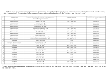 D. Leki, środki spożywcze specjalnego przeznaczenia żywieniowego oraz wyroby medyczne przysługujące świadczeniobiorcom, o których mowa w art. 43a ust. 1 ustawy z dnia 27 sierpnia 2004 r. o świadczeniach opieki zdrowotnej finansowanych ze środków publicznych (Dz. U. z 2016 r. poz. 1793, 1807, 1860.1)) lp. 1) Substancja czynna Nazwa, postać i dawka leku, środka spożywczego specjalnego przeznaczenia żywieniowego albo wyrobu medycznego Zawartość opakowania Kod EAN lub inny kod odpowiadający kodowi EAN 1 2 3 4 5 1 Acidum alendronicum Alendran 70, tabl., 70 mg 4 szt. (1 blist.po 4 szt.) 5909990072156 2 Acidum alendronicum Alendrogen, tabl., 70 mg 4 szt. 5909990623112 3 Acidum alendronicum Alendronat Bluefish, tabl., 70 mg 4 szt. 5909990737673 4 Acidum alendronicum Alendronate Arrow, tabl., 70 mg 4 szt. 5909990693726 5 Acidum alendronicum Alendronic Acid Genoptim, tabl., 70 mg 4 szt. (1 blist.po 4 szt.) 5909990675302 6 Acidum alendronicum Ostemax 70 comfort, tabl., 70 mg 4 szt. (1 blist.po 4 szt.) 5909991081713 7 Acidum alendronicum Ostenil 70, tabl., 70 mg 4 szt. (1 blist.po 4 szt.) 5909991087418 8 Acidum alendronicum Ostenil 70, tabl., 70 mg 6 szt. (1 blist.po 6 szt.) 5909991087425 9 Acidum alendronicum Ostolek, tabl. powl., 70 mg 4 szt. (1 blist.po 4 szt.) 5909991032517 10 Acidum alendronicum Sedron 70 mg tabletki powlekane, tabl. powl., 70 mg 4 szt. (1 blist.po 4 szt.) 5909990039692 11 Acidum alendronicum Sedron 70 mg tabletki powlekane, tabl. powl., 70 mg 12 szt. (3 blist.po 4 szt.) 5909990039708 12 Amantadinum Viregyt-K, kaps., 100 mg 50 szt. 5909990320912 13 Amiloridum + Hydrochlorothiazidum Tialorid mite, tabl., 2,5+25 mg 50 tabl. 5909990373819 14 Amiloridum + Hydrochlorothiazidum Tialorid, tabl., 5+50 mg 50 tabl. 5909990206025 15 Amlodipinum Adipine, tabl., 10 mg 30 szt. (3 blist.po 10 szt.) 5909990642267 16 Amlodipinum Adipine, tabl., 5 mg 30 szt. (3 blist.po 10 szt.) 5909990642311 17 Amlodipinum Agen 10, tabl. powl., 10 mg 30 tabl. 5909997232904 18 Amlodipinum Agen 10, tabl., 10 mg 60 szt. (6 blist.po 10 szt.) 5909991067540 19 Amlodipinum Agen 10, tabl., 10 mg 30 szt. (3 blist.po 10 szt.) 5909991099022 20 Amlodipinum Agen 10, tabl., 10 mg 30 szt. 5909991226909 21 Amlodipinum Agen 10, tabl., 10 mg 60 szt. 5909991226916 22 Amlodipinum Agen 10, tabl., 10 mg 30 szt. 5909991230845 23 Amlodipinum Agen 5, tabl. powl., 5 mg 30 tabl. 5909997232928 24 Amlodipinum Agen 5, tabl., 5 mg 60 szt. (6 blist.po 10 szt.) 5909991067533 25 Amlodipinum Agen 5, tabl., 5 mg 30 szt. (3 blist.po 10 szt.) 5909991098926 Zmiany tekstu jednolitego wymienionej ustawy zostały ogłoszone w Dz. U. z 2015 r. poz. 1240, 1269, 1365, 1569, 1692, 1735, 1830, 1844, 1991 i 1994 oraz z 2016 r. poz. 65, 652, 960, 1793, 1807 i 1860. lp. Substancja czynna Nazwa, postać i dawka leku, środka spożywczego specjalnego przeznaczenia żywieniowego albo wyrobu medycznego Zawartość opakowania Kod EAN lub inny kod odpowiadający kodowi EAN 1 2 3 4 5 26 Amlodipinum Agen 5, tabl., 5 mg 30 szt. 5909991231811 27 Amlodipinum Aldan, tabl., 10 mg 30 szt. (3 blist.po 10 szt.) 5909991008734 28 Amlodipinum Aldan, tabl., 5 mg 30 szt. (3 blist.po 10 szt.) 5909991008635 29 Amlodipinum Alneta, tabl., 10 mg 30 szt. 5909991068073 30 Amlodipinum Alneta, tabl., 10 mg 60 tabl. 5909991068097 31 Amlodipinum Alneta, tabl., 10 mg 90 tabl. 5909991068141 32 Amlodipinum Alneta, tabl., 5 mg 30 szt. 5909991067977 33 Amlodipinum Alneta, tabl., 5 mg 60 tabl. 5909991067991 34 Amlodipinum Alneta, tabl., 5 mg 90 tabl. 5909991068035 35 Amlodipinum Amlaxopin, tabl., 10 mg 30 szt. 5909990752720 36 Amlodipinum Amlaxopin, tabl., 5 mg 30 szt. 5909990752690 37 Amlodipinum Amlodipine Aurobindo, tabl., 10 mg 30 szt. 5909990955008 38 Amlodipinum Amlodipine Aurobindo, tabl., 5 mg 30 szt. 5909990954254 39 Amlodipinum Amlodipine Bluefish, tabl., 10 mg 30 szt. 5909990800551 40 Amlodipinum Amlodipine Bluefish, tabl., 5 mg 30 szt. 5909990800469 41 Amlodipinum Amlodipinum 123ratio, tabl., 10 mg 30 szt. 5909991225650 42 Amlodipinum Amlomyl, tabl., 10 mg 30 szt. 5909990842698 43 Amlodipinum Amlomyl, tabl., 5 mg 30 szt. 5909990842476 44 Amlodipinum Amlonor, tabl., 10 mg 30 szt. (3 blist.po 10 szt.) 5909990642625 45 Amlodipinum Amlonor, tabl., 5 mg 30 szt. (3 blist.po 10 szt.) 5909990642618 46 Amlodipinum Amlopin 10 mg, tabl., 10 mg 30 szt. (3 blist.po 10 szt.) 5909990048977 47 Amlodipinum Amlopin 10 mg, tabl., 10 mg 30 szt. 5909997213699 48 Amlodipinum Amlopin 10 mg, tabl., 10 mg 30 szt. 5909997218090 49 Amlodipinum Amlopin 10 mg, tabl., 10 mg 30 tabl. 5909997231501 50 Amlodipinum Amlopin 10 mg, tabl., 10 mg 30 szt. 5909991276027 51 Amlodipinum Amlopin 5 mg, tabl., 5 mg 30 szt. (3 blist.po 10 szt.) 5909990048939 52 Amlodipinum Amlopin 5 mg, tabl., 5 mg 30 szt. 5909991200732 53 Amlodipinum Amlopin 5 mg, tabl., 5 mg 30 szt. 5909997213675 54 Amlodipinum Amlopin 5 mg, tabl., 5 mg 30 szt. 5909997218113 55 Amlodipinum Amlozek, tabl., 10 mg 30 szt. 5909990799817 lp. Substancja czynna Nazwa, postać i dawka leku, środka spożywczego specjalnego przeznaczenia żywieniowego albo wyrobu medycznego Zawartość opakowania Kod EAN lub inny kod odpowiadający kodowi EAN 1 2 3 4 5 56 Amlodipinum Amlozek, tabl., 5 mg 30 szt. 5909990799718 57 Amlodipinum Apo-Amlo 10, tabl., 10 mg 30 szt. (3 blist.po 10 szt.) 5909990565993 58 Amlodipinum Apo-Amlo 10, tabl., 10 mg 30 szt. 5909991236687 59 Amlodipinum Apo-Amlo 5, tabl., 5 mg 30 szt. (3 blist.po 10 szt.) 5909990565986 60 Amlodipinum Cardilopin, tabl., 10 mg 30 szt. (3 blist.po 10 szt.) 5909990907519 61 Amlodipinum Cardilopin, tabl., 2,5 mg 30 szt. (3 blist.po 10 szt.) 5909990907311 62 Amlodipinum Cardilopin, tabl., 5 mg 30 szt. (3 blist.po 10 szt.) 5909990907410 63 Amlodipinum Damloc, tabl., 10 mg 30 szt. 5909991261375 64 Amlodipinum Damloc, tabl., 5 mg 30 szt. 5909991261337 65 Amlodipinum Finamlox, tabl., 10 mg 30 szt. 5909990794461 66 Amlodipinum Finamlox, tabl., 5 mg 30 tabl. 5909990794430 67 Amlodipinum Normodipine, tabl., 10 mg 30 sz