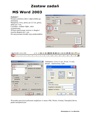 Zestaw zadań MS Word 2003 Zadanie I Przepisz poniŜszy tekst i odpowiednio go sformatuj: Marginesy: lewy, prawy po 2,5 cm, górny, dolny po 3 cm, Czcionka: verdana 10pkt., tekst wyjustowany, Wcięcie pierwszego wiersza w drugim i trzecim akapicie po 1 cm, Do narysowania strzałki uŜyj autokształtów. Tabulatory: Lewy (1 cm, 10 cm, 13 cm), Inicjał – wpuszczony 3 pkt., Wszystkie powyŜsze polecenia znajdziesz w menu: Plik, Wstaw, Format, Narzędzia lub na pasku narzędziowym. Gimnazjum nr 1 w Barcinie B arcin, stanowiący siedzibę władz samorządowych, jest wielofunkcyjnym ośrodkiem administracyjno-usługowym i mieszkaniowym. PołoŜony jest niemal centralnie w stosunku do obszaru gminy. UmoŜliwia to łatwość komunikowania się ze wszystkimi sołectwami. Charakterystycznym dla miasta zjawiskiem jest rozbicie układu przestrzennego na dwie odmienne jednostki – stary i nowy Barcin. Ukształtowany w procesie historycznym i mający wielowiekowe tradycje stary Barcin oddzielony jest łąkami i uŜytkiem ekologicznym doliny rzeki Noteci od nowej części miasta. Nowy Barcin jest jednostką mieszkaniowo-usługową utworzoną na potrzeby przemysłu cementowo-wapienniczego. Wiejską sieć osadniczą gminy tworzy 20 miejscowości wchodzących w skład 14 sołectw. Trzy największe wsie – Piechcin, Mamlicz i Krotoszyn – zamieszkuje łącznie 60% ludności wiejskiej gminy. Tak duŜa koncentracja przestrzenna mieszkańców jest korzystna, poniewaŜ ułatwia wyposaŜenie wsi w infrastrukturę techniczną i zwiększa dostępność do obiektów infrastruktury społecznej. Gminę Barcin zamieszkuje około 15.000 osób. Największym skupiskiem ludności jest Barcin, w którym Ŝyje ok. 9.000 osób. Drugą istotną miejscowością jest Piechcin z 3.100 mieszkańcami. W wieku przedprodukcyjnym jest 3039 osób, produkcyjnym – 9970 osób, a w grupie poprodukcyjnej 2046 osób. W kwietniu 2007 roku w gminie pozostawało bez pracy 1278 osób. Powierzchnia całkowita gminy obejmuje obszar 12.088 ha, w tym są: uŜytki rolne lasy, grunty zadrzewione i zakrzewione trzy jeziora i rzeka grunty zabudowane i zurbanizowane 9209 ha 1163 ha 371 ha 1029 ha (76%), (9,6%), (3,1%), (8,5%). Zadanie 2 Wykorzystując moŜliwości formatowania tekstu w edytorze tekstu stwórz oświadczenie wg wzoru: Czcionka: Tahoma 12pkt., tekst wyjustowany, Wcięcie pierwszego wiersza 2cm. Barcin, 14.02.2009 Xksińska Ygrekowska Barcin ul. Pakoska 24/158 Oświadczenie Gimnazjum nr 1 w Barcinie Oświadczam, iŜ ja niŜej podpisana jestem uczennicą Gimnazjum nr 1 w Barcinie i ubiegam się o tytuł najlepszego ucznia naszej szkoły w roku szkolnym 2008/2009. Xksińska Ygrekowska Zadanie 3 Stosując moŜliwości wyliczania i numerowania stwórz test składający się z 3 pytań z trzema wariantami odpowiedzi. 1. Woda to: a. H2O b. H2SO4 c. H2O2 2. Klub piłkarski w Barcinie nosi nazwę: a. Zagłębie b. Dąb c. Pogoń 3. Klas pierwszych w naszym gimnazjum jest: a. 7 b. 6 c. 8 4. W Barcinie są: a. 3 szkoły podstawowe b. 4 szkoły podstawowe c. 2 szkoły podstawowe Zadanie 4 Przygotować zaproszenie na przyjęcie urodzinowe wykorzystując dostępne clipart'y i odpowiednio formatowany tekst. Czcionka: garamond, 16 pkt., interlinia 1,5 pkt., wcięcie pierwszego wiersza w obu akapitach po 1 cm. Gimnazjum nr 1 w Barcinie "30 maja mija dokładnie 15 lat od chwili, gdy po raz pierwszy wydałam z siebie krzyk. Pragnę zaprosić wszystkie bliskie mi osoby na przyjęcie urodzinowe. Świetna zabawa w miłym towarzystwie zapewniona. Przyjęcie odbędzie się w sali bankietowej hoteliku „Orion” w sobotę 31 maja o godz. 2000. Serdecznie zapraszam." Xksiński Gimnazjum nr 1 w Barcinie Zadanie 5 1. Z wykorzystaniem edytora równań napisz następujące wyraŜenia: Powodzenia :-) Gimnazjum nr 1 w Barcinie