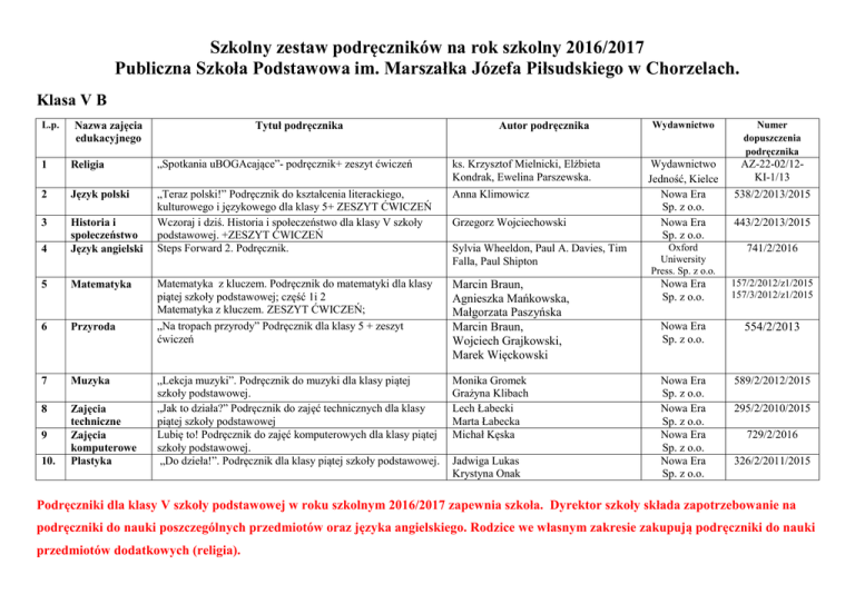 Szkolny zestaw podręczników na rok szkolny 2016/2017 Publiczna Szkoła Podstawowa im. Marszałka Józefa Piłsudskiego w Chorzelach. Klasa V B L.p. Nazwa zajęcia edukacyjnego Tytuł podręcznika Autor podręcznika 1 Religia „Spotkania uBOGAcające”- podręcznik+ zeszyt ćwiczeń ks. Krzysztof Mielnicki, Elżbieta Kondrak, Ewelina Parszewska. 2 Język polski Anna Klimowicz 3 4 Historia i społeczeństwo Język angielski „Teraz polski!” Podręcznik do kształcenia literackiego, kulturowego i językowego dla klasy 5+ ZESZYT ĆWICZEŃ Wczoraj i dziś. Historia i społeczeństwo dla klasy V szkoły podstawowej. +ZESZYT ĆWICZEŃ Steps Forward 2. Podręcznik. 5 Matematyka 6 Przyroda Matematyka z kluczem. Podręcznik do matematyki dla klasy piątej szkoły podstawowej; część 1i 2 Matematyka z kluczem. ZESZYT ĆWICZEŃ; „Na tropach przyrody” Podręcznik dla klasy 5 + zeszyt ćwiczeń 7 Muzyka 8 Zajęcia techniczne Zajęcia komputerowe Plastyka „Lekcja muzyki”. Podręcznik do muzyki dla klasy piątej szkoły podstawowej. „Jak to działa?” Podręcznik do zajęć technicznych dla klasy piątej szkoły podstawowej Lubię to! Podręcznik do zajęć komputerowych dla klasy piątej szkoły podstawowej. „Do dzieła!”. Podręcznik dla klasy piątej szkoły podstawowej. 9 10. Grzegorz Wojciechowski Wydawnictwo Numer dopuszczenia podręcznika Wydawnictwo Jedność, Kielce Nowa Era Sp. z o.o. Nowa Era Sp. z o.o. AZ-22-02/12KI-1/13 538/2/2013/2015 443/2/2013/2015 Oxford Uniwersity Press. Sp. z o.o. 741/2/2016 Marcin Braun, Agnieszka Mańkowska, Małgorzata Paszyńska Marcin Braun, Wojciech Grajkowski, Marek Więckowski Nowa Era Sp. z o.o. 157/2/2012/z1/2015 157/3/2012/z1/2015 Nowa Era Sp. z o.o. 554/2/2013 Monika Gromek Grażyna Klibach Lech Łabecki Marta Łabecka Michał Kęska Nowa Era Sp. z o.o. Nowa Era Sp. z o.o. Nowa Era Sp. z o.o. Nowa Era Sp. z o.o. 589/2/2012/2015 Sylvia Wheeldon, Paul A. Davies, Tim Falla, Paul Shipton Jadwiga Lukas Krystyna Onak 295/2/2010/2015 729/2/2016 326/2/2011/2015 Podręczniki dla klasy V szkoły podstawowej w roku szkolnym 2016/2017 zapewnia szkoła. Dyrektor szkoły składa zapotrzebowanie na podręczniki do nauki poszczególnych przedmiotów oraz języka angielskiego. Rodzice we własnym zakresie zakupują podręczniki do nauki przedmiotów dodatkowych (religia).