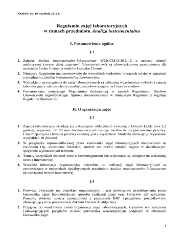 Kraków, dn. 16 września 2016 r. Regulamin zajęć laboratoryjnych w ramach przedmiotu Analiza instrumentalna I. Postanowienia ogólne §1 1. Zajęcia Analiza instrumentalna-laboratorium WCh-CM-O101L-12 z zakresu chemii analitycznej (zwane dalej zajęciami laboratoryjnymi) są obowiązkowym przedmiotem dla studentów I roku II stopnia studiów kierunku Chemia. 2. Niniejszy Regulamin ma zastosowanie do wszystkich studentów biorących udział w zajęciach z przedmiotu Analiza instrumentalna-laboratorium. 3. Warunkiem przystąpienia do zajęć laboratoryjnych są zaliczone wcześniejsze wykłady i zajęcia laboratoryjne z zakresu chemii analitycznej obowiązujące na I stopniu studiów. 4. Postanowienia niniejszego Regulaminu funkcjonują w ramach Regulaminu Studiów Uniwersytetu Jagiellońskiego. Sprawy nieunormowane w niniejszym Regulaminie reguluje Regulamin Studiów UJ. II. Organizacja zajęć §2 1. Zajęcia laboratoryjne składają się z dziesięciu oddzielnych ćwiczeń, z których każde trwa 3,5 godziny zegarowe. Po 90 min trwania ćwiczeń istnieje możliwość zorganizowania przerwy. Czas rozpoczęcia i trwania przerwy ustalany jest z asystentem. Studenta obowiązuje wykonanie wszystkich 10 ćwiczeń. 2. W przypadku usprawiedliwionej przez kierownika zajęć laboratoryjnych nieobecności na ćwiczeniu (np. zwolnienie lekarskie) student ma prawo odrobić zajęcia w dodatkowym, specjalnie wyznaczonym terminie. 3. Tematy wszystkich ćwiczeń wraz z harmonogramem ich wykonania są dostępne na wskazanej stronie internetowej. 4. Wszelkie informacje organizacyjne potrzebne do realizacji zajęć laboratoryjnych są zamieszczane w materiałach dydaktycznych przedmiotu Analiza instrumentalna-laboratorium na wskazanej stronie internetowej. §3 1. Pierwsze ćwiczenie ma charakter organizacyjny i jest poświęcone przedstawieniu przez kierownika zajęć laboratoryjnych sposobu realizacji zajęć oraz kryteriów ich zaliczenia. Ponadto, studenci zostają zaznajomieni z przepisami BHP i przepisami porządkowymi obowiązującymi w pracowniach Zakładu Chemii Analitycznej. 2. Przyjęcie do wiadomości zasad organizacji zajęć laboratoryjnych, kryteriów ich zaliczenia i obowiązujących przepisów student potwierdza własnoręcznym podpisem w obecności kierownika zajęć. 1 §4 1. Każde ćwiczenie laboratoryjne służy rozwiązaniu osobnego, ważnego problemu analitycznego, określonego na początku ćwiczenia przez asystenta. 2. Każde ćwiczenie składa się z trzech części: a) pisemnego sprawdzianu, b) pracy doświadczalnej, c) pisemnego raportu. 3. Sprawdzian to pisemna odpowiedź na trzy (spośród 12) losowo wybranych pytań mających charakter zagadnień teoretycznych. Sprawdzian trwa 20 minut. 4. Podczas części doświadczalnej studenci pod nadzorem asystenta wykonują eksperymenty potrzebne do rozwiązania zadanego problemu. 5. Raport jest to pisemne opracowanie dotyczące wykonanego ćwiczenia. Powinien być przygotowany według wzoru zamieszczonego w materiałach do ćwiczeń i zawierać: stronę tytułową, cel ćwiczenia, wyniki doświadczalne i dyskusję wyników oraz opracowanie zagadnienia naukowego zadanego przez asystenta indywidualnie dla każdego studenta. 6. Raport należy oddać najpóźniej w terminie określonym w harmonogramie ćwiczeń (z reguły w terminie 1 tygodnia po wykonaniu ćwiczenia). Raporty będą przyjmowane od studentów w dniach odbywających się ćwiczeń w pokoju nr 52 do godz. 15.00. 7. Data oddania raportu jest pisemnie potwierdzana przez studenta i osoby przyjmujące raport. §5 1. Do każdego ćwiczenia jest opracowana instrukcja zawierająca: a) zagadnienia teoretyczne w formie 12 pytań wymagane do zaliczenia sprawdzianu, b) pozycje literaturowe na podstawie, których student powinien przygotować się do ćwiczenia, c) plan wykonania ćwiczenia, d) wskazówki i wymagania dotyczące opracowania raportu z przeprowadzonych doświadczeń. 2. Wszystkie instrukcje są umieszczone w formacie PDF na stronie internetowej z materiałami dydaktycznymi dla studentów naszego Wydziału. W wyjątkowych przypadkach instrukcje w formie drukowanej wydawane będą studentom w pokoju nr 52, w dniach ćwiczeń w godz. od 10.00 do 15.00. III. Zaliczenie zajęć laboratoryjnych §6 1. Za każde ćwiczenie student może uzyskać 18 punktów, w tym: za sprawdzian – maksymalnie 6 pkt., (maksymalnie 2 punkty za odpowiedź na każde z trzech pytań), za raport – maksymalnie 12 pkt. 2. Student może uzyskać dodatkowo 1 pkt. za szczególne, ponadprzeciętne zainteresowanie tematem, wyjątkową aktywność w prowadzonej dyskusji lub pomysłowość i czynną pracę w rozwiązaniu zadanego problemu. 3. Student może utracić 1 pkt. za brak przygotowania do wykonania ćwiczenia, brak aktywności w pracach doświadczalnych lub nieprzestrzeganie przepisów porządkowych. 2 4. Nieuczciwe postępowanie studenta podczas pisania sprawdzianu i/lub opracowania raportu skutkuje brakiem zaliczenia sprawdzianu i/ lub raportu (0 pkt.). 5. Od liczby punktów uzyskanych przez studenta za opracowany raport odejmowane są 3 pkt. za każdy rozpoczęty tydzień zwłoki w oddaniu raportu. §7 1. O liczbie przyznanych punktów decyduje asystent po uwzględnieniu odpowiedzi na pytania sprawdzianu, aktywności studenta na ćwiczeniu oraz poprawności opracowania i stopnia trudności wszystkich elementów raportu. 2. Uzasadnienie oceny raportu zainteresowany student uzyskuje od asystenta w godzinach konsultacji. 3. Student nie ma możliwości poprawienia raportu. 4. Liczba punktów uzyskanych przez studenta z danego ćwiczenia jest podawana do wiadomości studentom w terminie do dwóch tygodni od daty wykonania ćwiczenia w systemie USOS. IV. Warunki zaliczenia zajęć laboratoryjnych §8 1. Punkty uzyskane przez studenta ze wszystkich ćwiczeń są sumowane. Maksymalnie student może uzyskać 60 pkt. za sprawdziany, 120 pkt. za raporty i 10 pkt. za aktywność (w sumie 190 pkt.). 2. Aby