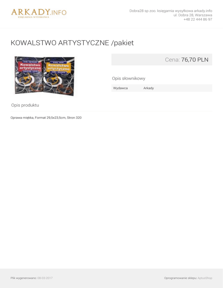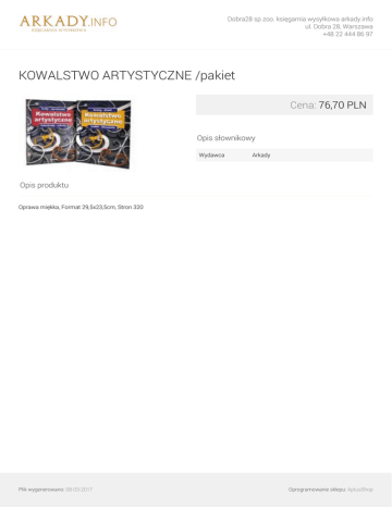 Dobra28 sp zoo. księgarnia wysyłkowa arkady.info ul. Dobra 28, Warszawa +48 22 444 86 97 KOWALSTWO ARTYSTYCZNE /pakiet Cena: 76,70 PLN Opis słownikowy Wydawca Arkady Opis produktu Oprawa miękka, Format 29,5x23,5cm, Stron 320 Plik wygenerowano: 08-03-2017 Powered by TCPDF (www.tcpdf.org) Oprogramowanie sklepu: AptusShop