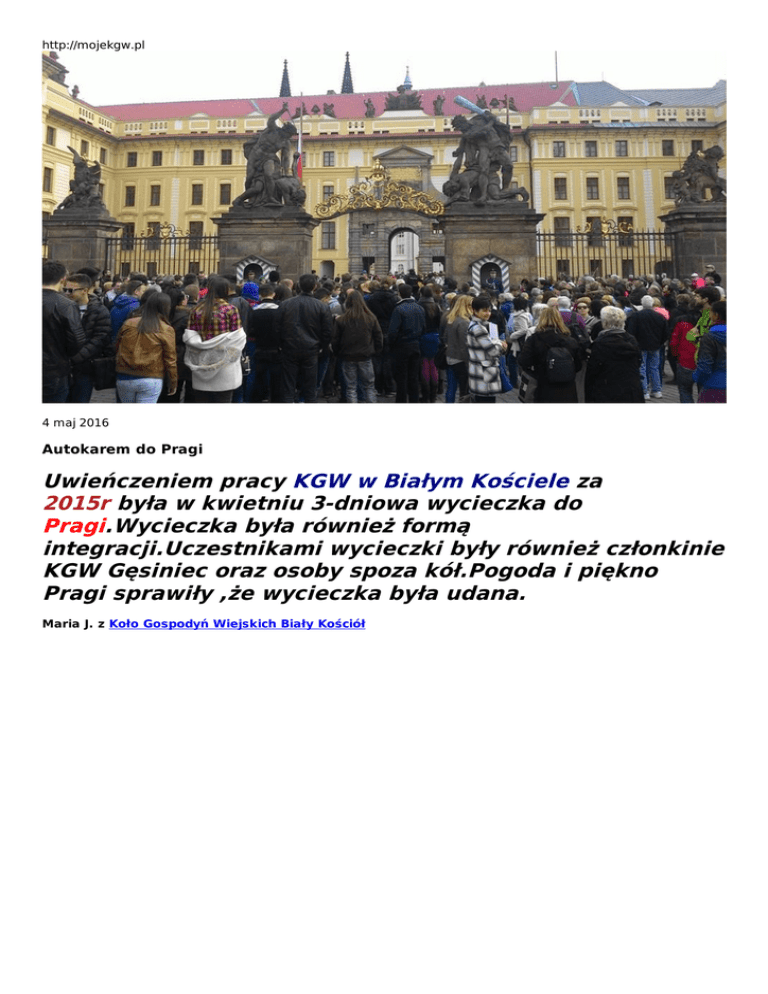 http://mojekgw.pl 4 maj 2016 Autokarem do Pragi Uwieńczeniem pracy KGW w Białym Kościele za 2015r była w kwietniu 3-dniowa wycieczka do Pragi.Wycieczka była również formą integracji.Uczestnikami wycieczki były również członkinie KGW Gęsiniec oraz osoby spoza kół.Pogoda i piękno Pragi sprawiły ,że wycieczka była udana. Maria J. z Koło Gospodyń Wiejskich Biały Kościół