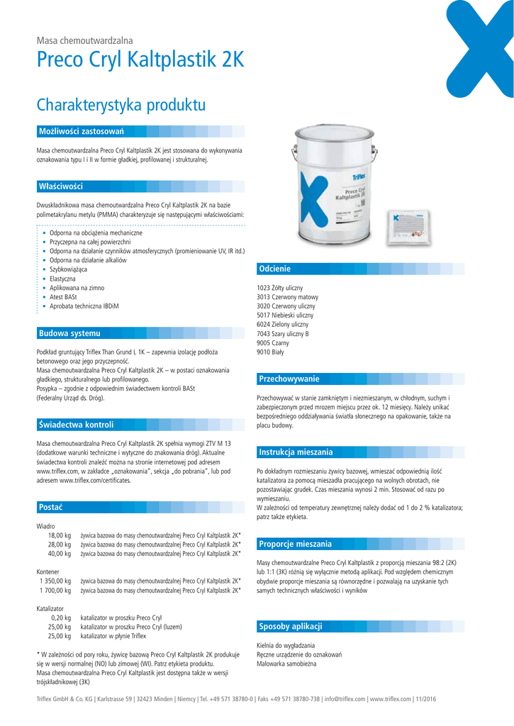 Masa chemoutwardzalna Preco Cryl Kaltplastik 2K Charakterystyka produktu Możliwości zastosowań Masa chemoutwardzalna Preco Cryl Kaltplastik 2K jest stosowana do wykonywania oznakowania typu I i II w formie gładkiej, profilowanej i strukturalnej. Właściwości Dwuskładnikowa masa chemoutwardzalna Preco Cryl Kaltplastik 2K na bazie polimetakrylanu metylu (PMMA) charakteryzuje się następującymi właściwościami: Odporna na obciążenia mechaniczne Przyczepna na całej powierzchni Odporna na działanie czynników atmosferycznych (promieniowanie UV, IR itd.) Odporna na działanie alkaliów Szybkowiążąca Elastyczna Aplikowana na zimno Atest BASt Aprobata techniczna IBDiM Budowa systemu Podkład gruntujący Triflex Than Grund L 1K – zapewnia izolację podłoża betonowego oraz jego przyczepność. Masa chemoutwardzalna Preco Cryl Kaltplastik 2K – w postaci oznakowania gładkiego, strukturalnego lub profilowanego. Posypka – zgodnie z odpowiednim świadectwem kontroli BASt (Federalny Urząd ds. Dróg). Świadectwa kontroli Masa chemoutwardzalna Preco Cryl Kaltplastik 2K spełnia wymogi ZTV M 13 (dodatkowe warunki techniczne i wytyczne do znakowania dróg). Aktualne świadectwa kontroli znaleźć można na stronie internetowej pod adresem www.triflex.com, w zakładce „oznakowania”, sekcja „do pobrania”, lub pod adresem www.triflex.com/certificates. Postać Wiadro 18,00 kgżywica bazowa do masy chemoutwardzalnej Preco Cryl Kaltplastik 2K* 28,00 kgżywica bazowa do masy chemoutwardzalnej Preco Cryl Kaltplastik 2K* 40,00 kgżywica bazowa do masy chemoutwardzalnej Preco Cryl Kaltplastik 2K* Kontener 1 350,00 kg żywica bazowa do masy chemoutwardzalnej Preco Cryl Kaltplastik 2K* 1 700,00 kg żywica bazowa do masy chemoutwardzalnej Preco Cryl Kaltplastik 2K* Katalizator 0,20 kg 25,00 kg 25,00 kg katalizator w proszku Preco Cryl katalizator w proszku Preco Cryl (luzem) katalizator w płynie Triflex * W zależności od pory roku, żywicę bazową Preco Cryl Kaltplastik 2K produkuje się w wersji normalnej (NO) lub zimowej (WI). Patrz etykieta produktu. Masa chemoutwardzalna Preco Cryl Kaltplastik jest dostępna także w wersji trójskładnikowej (3K) Odcienie 1023 Żółty uliczny 3013 Czerwony matowy 3020 Czerwony uliczny 5017 Niebieski uliczny 6024 Zielony uliczny 7043 Szary uliczny B 9005 Czarny 9010 Biały Przechowywanie Przechowywać w stanie zamkniętym i niezmieszanym, w chłodnym, suchym i zabezpieczonym przed mrozem miejscu przez ok. 12 miesięcy. Należy unikać bezpośredniego oddziaływania światła słonecznego na opakowanie, także na placu budowy. Instrukcja mieszania Po dokładnym rozmieszaniu żywicy bazowej, wmieszać odpowiednią ilość katalizatora za pomocą mieszadła pracującego na wolnych obrotach, nie pozostawiając grudek. Czas mieszania wynosi 2 min. Stosować od razu po wymieszaniu. W zależności od temperatury zewnętrznej należy dodać od 1 do 2 % katalizatora; patrz także etykieta. Proporcje mieszania Masy chemoutwardzalne Preco Cryl Kaltplastik z proporcją mieszania 98:2 (2K) lub 1:1 (3K) różnią się wyłącznie metodą aplikacji. Pod względem chemicznym obydwie proporcje mieszania są równorzędne i pozwalają na uzyskanie tych samych technicznych właściwości i wyników Sposoby aplikacji Kielnia do wygładzania Ręczne urządzenie do oznakowań Malowarka samobieżna Triflex GmbH & Co. KG | Karlstrasse 59 | 32423 Minden | Niemcy | Tel. +49 571 38780-0 | Faks +49 571 38780-738 | [email protected] | www.triflex.com | 11/2016 Masa chemoutwardzalna Preco Cryl Kaltplastik 2K Charakterystyka produktu Zużycie materiału Masa chemoutwardzalna Preco Cryl Kaltplastik 2K, gęstość ok. 1,9 g/cm³ Oznakowanie w formie gładkiej: Zużycie ok. 4,50 kg/m² przy grubości warstwy 2,5 mm. W odniesieniu do linii ciągłej wykonywanej na odcinku 1 km. Wskazówki odnośnie szczególnych zagrożeń Patrz Karta charakterystyki, rozdział 2 Zalecenia w zakresie bezpieczeństwa Patrz Karta charakterystyki, rozdział 7 i 8 Oznakowanie strukturalne: Zużycie ok. 2,20 kg/m². W odniesieniu do linii wykonywanej na odcinku 1 km. Oznakowanie profilowane: Zużycie ok. 6,50 kg/m² przy grubości warstwy od 3 do 5 mm. W odniesieniu do linii wykonywanej na odcinku 1 km. Wzór wyliczenia: Szerokość linii (m) x długość linii (m) x zużycie (kg/m²) = Zużycie powierzchniowe (kg) Czas zachowania stanu plastycznego Ok. 5 do 10 min. w temp. +20 °C Czas schnięcia Postępowanie w razie wypadku i pożaru Patrz Karta charakterystyki, rozdział 4, 5 i 6 Podstawowe informacje Gwarantujemy stałą, wysoką jakość naszych produktów. Systemów Triflex nie należy mieszać z wyrobami innych producentów. Zalecenia techniczne odnoszące się do stosowania naszych produktów opierają się na obszernych pracach rozwojowych oraz wieloletnich doświadczeniach i są przekazywane zgodnie z najlepszą wiedzą. Najróżniejsze wymogi związane ze specyfiką obiektów i odmiennymi warunkami zastosowania sprawiają jednak, że konieczne jest sprawdzenie przydatności produktu do konkretnego użycia przez wykonawcę. Zastrzega się prawo do wprowadzania w produktach zmian podyktowanych postępem techniki oraz poprawą ich właściwości. Ok. 15 do 20 min. w temp. +20 °C Triflex GmbH & Co. KG | Karlstrasse 59 | 32423 Minden | Niemcy | Tel. +49 571 38780-0 | Faks +49 571 38780-738 | [email protected] | www.triflex.com | 11/2016 Masa chemoutwardzalna Preco Cryl Kaltplastik 2K Opis produktu Masa chemoutwardzalna Preco Cryl Kaltplastik 2K to bezrozpuszczalnikowy, dwuskładnikowy produkt na bazie żywicy polimetakrylanu metylu (PMMA). Masa Preco Cryl Kaltplastik 2K umożliwia wykonywanie oznakowań w formie gładkiej typu I i II oraz w formie strukturalnej lub profilowanej. Masa chemoutwardzalna Preco Cryl Kaltplastik 2K sprawdza się szczególnie na drogach o dużym natężeniu ruchu i wysokich wymogach odnośnie dobrej widoczności nocnej. Masy chemoutwardzalne Triflex znajdują tak
