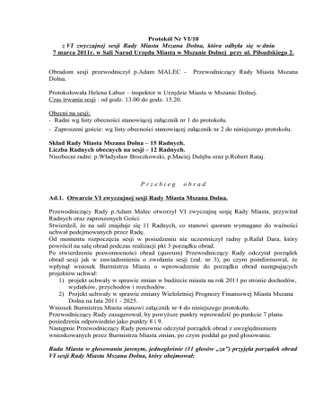 Protokół Nr VI/10 z VI zwyczajnej sesji Rady Miasta Mszana Dolna, która odbyła się w dniu 7 marca 2011r. w Sali Narad Urzędu Miasta w Mszanie Dolnej przy ul. Piłsudskiego 2. Obradom sesji przewodniczył p.Adam MALEC Dolna. Przewodniczący Rady Miasta Mszana Protokołowała Helena Łabuz – inspektor w Urzędzie Miasta w Mszanie Dolnej. Czas trwania sesji : od godz. 13.00 do godz. 15.20. Obecni na sesji: - Radni wg listy obecności stanowiącej załącznik nr 1 do protokołu. - Zaproszeni goście: wg listy obecności stanowiącej załącznik nr 2 do niniejszego protokołu. Skład Rady Miasta Mszana Dolna – 15 Radnych. Liczba Radnych obecnych na sesji – 12 Radnych. Nieobecni radni: p.Władysław Broczkowski, p.Maciej Dulęba oraz p.Robert Rataj. Przebieg obrad Ad.1. Otwarcie VI zwyczajnej sesji Rady Miasta Mszana Dolna. Przewodniczący Rady p.Adam Malec otworzył VI zwyczajną sesję Rady Miasta, przywitał Radnych oraz zaproszonych Gości. Stwierdził, że na sali znajduje się 11 Radnych, co stanowi quorum wymagane do ważności uchwał podejmowanych przez Radę. Od momentu rozpoczęcia sesji w posiedzeniu nie uczestniczył radny p.Rafał Dara, który powrócił na salę obrad podczas realizacji pkt 3 porządku obrad. Po stwierdzeniu prawomocności obrad (quorum) Przewodniczący Rady odczytał porządek obrad sesji jak w zawiadomieniu o zwołaniu sesji (zał. nr 3), po czym poinformował, że wpłynął wniosek Burmistrza Miasta o wprowadzenie do porządku obrad następujących projektów uchwał: 1) projekt uchwały w sprawie zmian w budżecie miasta na rok 2011 po stronie dochodów, wydatków, przychodów i rozchodów. 2) Projekt uchwały w sprawie zmiany Wieloletniej Prognozy Finansowej Miasta Mszana Dolna na lata 2011 - 2025. Wniosek Burmistrza Miasta stanowi załącznik nr 4 do niniejszego protokołu. Przewodniczący Rady zasugerował, by powyższe punkty wprowadzić po punkcie 7 planu posiedzenia odpowiednio jako punkty 8 i 9. Następnie Przewodniczący Rady ponownie odczytał porządek obrad z uwzględnieniem wnioskowanych przez Burmistrza Miasta zmian, po czym poddał go pod głosowanie. Rada Miasta w głosowaniu jawnym, jednogłośnie (11 głosów „za”) przyjęła porządek obrad VI sesji Rady Miasta Mszana Dolna, który obejmował: 2. 3. 4. 5. Przyjęcie protokołów nr IV/10 i V/11 z posiedzeń Rady Miasta Mszana Dolna. Informacja o pracy Burmistrza Miasta w okresie między sesjami. Interpelacje i zapytania Radnych. Informacja Komendanta Policji w Mszanie Dolnej o stanie bezpieczeństwa na terenie Miasta Mszana Dolna. 6. Informacja Kierownika MOPS w Mszanie Dolnej o realizacji projektu p.n. „Program aktywizacji społeczno – zawodowej w Mieście Mszana Dolna”. 7. Podjęcie uchwały w sprawie zmiany Statutu Miejskiego Ośrodka Pomocy Społecznej w Mszanie Dolnej. 8. Podjęcie uchwały w sprawie zmian w budżecie miasta na rok 2011 po stronie dochodów, wydatków, przychodów i rozchodów. 9. Podjęcie uchwały w sprawie zmiany Wieloletniej Prognozy Finansowej Miasta Mszana Dolna na lata 2011 – 2025. 10. Podjęcie uchwały w sprawie zbycia niezabudowanej nieruchomości (działki ewid.9642 o pow.0,0031ha) stanowiącej własność Miasta Mszana Dolna. 11. Podjęcie uchwały w sprawie wyrażenia zgody na zawarcie kolejnej umowy najmu lokalu użytkowego, położonego w Mszanie Dolnej przy ul.Starowiejskiej. 12. Podjęcie uchwały w sprawie zbycia niezabudowanej nieruchomości (działki ewid.4160/3 o pow.0,0143ha) stanowiącej własność Miasta Mszana Dolna. 13. Podjęcie uchwały w sprawie wyrażenia zgody na zawarcie na okres 1 roku, kolejnych umów dzierżawy nieruchomości – części działki ewid.4703/2 położonej w Mszanie Dolnej przy ul.Orkana. 14. Podjęcie uchwały w sprawie oddania w najem, na okres 10 lat w drodze przetargu, lokalu użytkowego nr 2 w budynku handlowym przy ul.Starowiejskiej. 15. Podjęcie uchwały w sprawie ustanowienia prawa służebności przejazdu i przechodu po działce nr 4316/20, stanowiącej własność Miasta Mszana Dolna. 16. Podjęcie uchwały w sprawie zatwierdzenia Regulaminu Komisji Ochrony Środowiska Rady Miasta Mszana Dolna. 17. Odpowiedzi na interpelacje i zapytania Radnych. 18. Wolne wnioski. 19. Zamknięcie obrad VI zwyczajnej sesji Rady Miasta Mszana Dolna. Ad.2. Przyjęcie protokołów nr IV/10 i V/11 z posiedzeń Rady Miasta Mszana Dolna. Przewodniczący obrad poinformował, że protokoły nr IV/10 i V/11 z posiedzeń Rady Miasta zostały wyłożone do wglądu w Biurze Rady Miasta. Radni nie wnieśli uwag do protokołów. Wobec powyższego, Przewodniczący Rady Miasta poddał pod głosowanie przyjęcie protokołów odpowiednio nr IV/10 i V/11 z posiedzeń Rady Miasta Mszana Dolna : Rada Miasta w głosowaniu jawnym, w dwóch odrębnych głosowaniach, jednogłośnie przyjęła protokoły nr IV/10 i nr V/11 z posiedzeń Rady Miasta Mszana Dolna. Ad.3. Informacja o pracy Burmistrza Miasta w okresie między sesjami. Burmistrz Miasta – p.Tadeusz Filipiak - przedstawił informację o pracy w okresie od ostatniej sesji Rady. Najważniejsze sprawy to: ► 01.02. – sala narad Urzędu Miasta: udział we wspólnym posiedzeniu Rady Społecznej SP ZOZ i Komisji Zdrowia n.t. funkcjonowania służby zdrowia (Ośrodka Zdrowia) w Mszanie Dolnej. ► 05.02. – Kraków, odbiór promesy MSWiA na odbudowę infrastruktury po powodziach (100 tys. zł. na odbudowę ul.M.Konopnickiej). ► 11.02 – Lubomierz: udział wspólnie z Wójtem Gminy Mszana Dolna w inauguracji zawodów pn. „Szukamy przyszłych mistrzów”. ► 14.02. – Mszana Dolna, inauguracja programu pn. „Atrakcyjne przedszkole”. ► 15.02. – Limanowa, konwent wójtów i starostów (podczas spotkania omawiano sprawy: stanu bezpieczeństwa, zarządzania kryzysowego, itd.) ► 16.02. – Poręba Wielka, Walne Zgromadzenie Wspólników GWT (bieżące informacje n.t. Spółki. Z najważniejszych spraw to jest unieważnienie przetargu na wykonanie odwiertu ze 