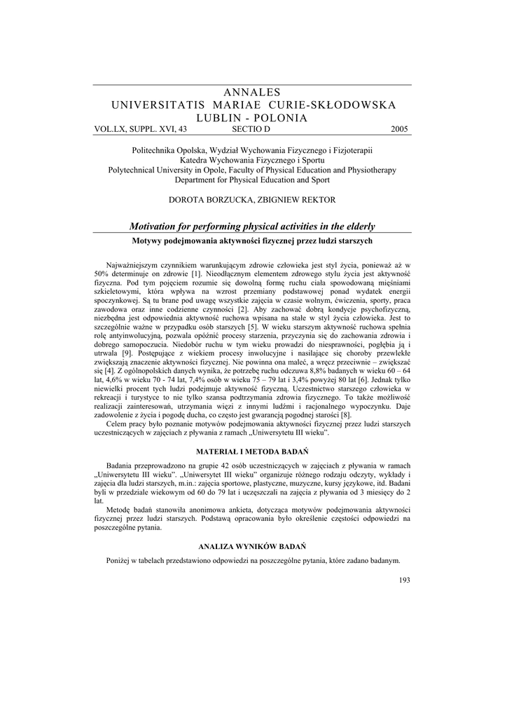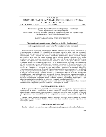 ANNALES UNIVERSITATIS MARIAE CURIE-SKŁODOWSKA LUBLIN - POLONIA VOL.LX, SUPPL. XVI, 43 SECTIO D 2005 Politechnika Opolska, Wydział Wychowania Fizycznego i Fizjoterapii Katedra Wychowania Fizycznego i Sportu Polytechnical University in Opole, Faculty of Physical Education and Physiotherapy Department for Physical Education and Sport DOROTA BORZUCKA, ZBIGNIEW REKTOR Motivation for performing physical activities in the elderly Motywy podejmowania aktywności fizycznej przez ludzi starszych Najważniejszym czynnikiem warunkującym zdrowie człowieka jest styl życia, ponieważ aż w 50% determinuje on zdrowie [1]. Nieodłącznym elementem zdrowego stylu życia jest aktywność fizyczna. Pod tym pojęciem rozumie się dowolną formę ruchu ciała spowodowaną mięśniami szkieletowymi, która wpływa na wzrost przemiany podstawowej ponad wydatek energii spoczynkowej. Są tu brane pod uwagę wszystkie zajęcia w czasie wolnym, ćwiczenia, sporty, praca zawodowa oraz inne codzienne czynności [2]. Aby zachować dobrą kondycje psychofizyczną, niezbędna jest odpowiednia aktywność ruchowa wpisana na stałe w styl życia człowieka. Jest to szczególnie ważne w przypadku osób starszych [5]. W wieku starszym aktywność ruchowa spełnia rolę antyinwolucyjną, pozwala opóźnić procesy starzenia, przyczynia się do zachowania zdrowia i dobrego samopoczucia. Niedobór ruchu w tym wieku prowadzi do niesprawności, pogłębia ją i utrwala [9]. Postępujące z wiekiem procesy inwolucyjne i nasilające się choroby przewlekłe zwiększają znaczenie aktywności fizycznej. Nie powinna ona maleć, a wręcz przeciwnie – zwiększać się [4]. Z ogólnopolskich danych wynika, że potrzebę ruchu odczuwa 8,8% badanych w wieku 60 – 64 lat, 4,6% w wieku 70 - 74 lat, 7,4% osób w wieku 75 – 79 lat i 3,4% powyżej 80 lat [6]. Jednak tylko niewielki procent tych ludzi podejmuje aktywność fizyczną. Uczestnictwo starszego człowieka w rekreacji i turystyce to nie tylko szansa podtrzymania zdrowia fizycznego. To także możliwość realizacji zainteresowań, utrzymania więzi z innymi ludźmi i racjonalnego wypoczynku. Daje zadowolenie z życia i pogodę ducha, co często jest gwarancją pogodnej starości [8]. Celem pracy było poznanie motywów podejmowania aktywności fizycznej przez ludzi starszych uczestniczących w zajęciach z pływania z ramach „Uniwersytetu III wieku”. MATERIAŁ I METODA BADAŃ Badania przeprowadzono na grupie 42 osób uczestniczących w zajęciach z pływania w ramach „Uniwersytetu III wieku”. „Uniwersytet III wieku” organizuje różnego rodzaju odczyty, wykłady i zajęcia dla ludzi starszych, m.in.: zajęcia sportowe, plastyczne, muzyczne, kursy językowe, itd. Badani byli w przedziale wiekowym od 60 do 79 lat i uczęszczali na zajęcia z pływania od 3 miesięcy do 2 lat. Metodę badań stanowiła anonimowa ankieta, dotycząca motywów podejmowania aktywności fizycznej przez ludzi starszych. Podstawą opracowania było określenie częstości odpowiedzi na poszczególne pytania. ANALIZA WYNIKÓW BADAŃ Poniżej w tabelach przedstawiono odpowiedzi na poszczególne pytania, które zadano badanym. 193 Tab. 1 Czy kiedykolwiek uprawiała Pani (Pan) sport? N % Nie 14 33 Rekreacyjnie 22 53 Wyczynowo 6 14 Większość badanych w młodości uprawiała sport, 53% rekreacyjnie, 14 % wyczynowo. 33% nigdy wcześniej nie uprawiało sportu. Tab. 2 Czy poza zajęciami na „Uniwersytecie” podejmuje Pani (Pan) aktywność ruchową? Nie N % 5 12 Sporadycznie 4 9 Tak 33 79 Zdecydowana większość (79%) poza zajęciami z pływania podejmuje wysiłek fizyczny, tylko 12% nie podejmuje innej aktywności fizycznej. Tab. 3 Czy odczuwa Pani (Pan) pozytywne skutki podjętej aktywności ruchowej? N % Nie 0 0 Trochę 0 0 Raczej tak 6 14 Zdecydowanie tak 36 86 Ankietowani zgodnie stwierdzili, że podjęty przez nich wysiłek fizyczny pozytywnie wpływa na ich organizm (86% - zdecydowanie tak, 14% - raczej tak). Tab. 4 Jaką formę aktywności fizycznej Pani (Pan) preferuje? N % Pływanie 40 95 Gimnastykę 27 64 Wycieczki piesze 29 69 Wycieczki rowerowe 19 45 Turystykę górską 14 33 Większość ankietowanych preferuje pływanie - 95%, dużą popularnością cieszy się też gimnastyka - 64% i wycieczki piesze 69% (istniała możliwość wielokrotnego wyboru odp.). Tab. 5 Inspiracja do podejmowania wysiłku fizycznego N % Zachęta rodziny 0 0 Zachęta znajomych uczestniczących w zajęciach 16 38 Artykuły prasowe, programy radiowe i telewizyjne 14 33 Sugestia lekarza 8 19 Własne zainteresowania i potrzeby 39 93 194 Dla znacznej większości badanych inspiracją do podjęcia aktywności fizycznej były własne zainteresowania i potrzeby – 93%, ważna była też zachęta znajomych, uczestniczących w zajęciach – 38%, dużą rolę odegrały media – 33% (możliwość wielokrotnego wyboru odp.). Tab. 7 Przeszkody w podejmowaniu aktywności fizycznej Brak chęci N % 3 7 Brak czasu 4 10 Brak dostępu do obiektów 4 10 Brak odpowiednich zajęć 5 12 Nieśmiałość 3 7 Stan zdrowia 1 2 Brak świadomości pozytywnych skutków aktywności fiz. 7 17 Brak informacji o takich zajęciach 5 12 Brak znajomych uczestniczących w takich zajęciach 15 36 Wysokie koszty uczestnictwa 32 76 Brak nawyków takiego spędzania czasu 17 40 Zdaniem ankietowanych największą przeszkodą w podejmowaniu aktywności fizycznej są wysokie koszty uczestnictwa – 76%. Inne ważne przeszkody to brak nawyków takiego spędzania czasu - 40% i brak znajomych uczestniczących w zajęciach sportowych – 36% (istniała możliwość wielokrotnego wyboru odpowiedzi). Tab. 6 Motywy podejmowania aktywności fizycznej N % Dążenie do poprawy stanu zdrowia 38 90 Chęć utrzymania dobrej kondycji 36 86 Możliwość poznania nowych ludzi 5 12 Możliwość spotykania się ze znajomymi 4 9 Potrzeba kontaktu z innymi ludźmi 7 17 Zalecenie lekarskie 5 12 Namowa rodziny lub znajomych 0 0 Zdecydowanie najważniejszymi motyw
