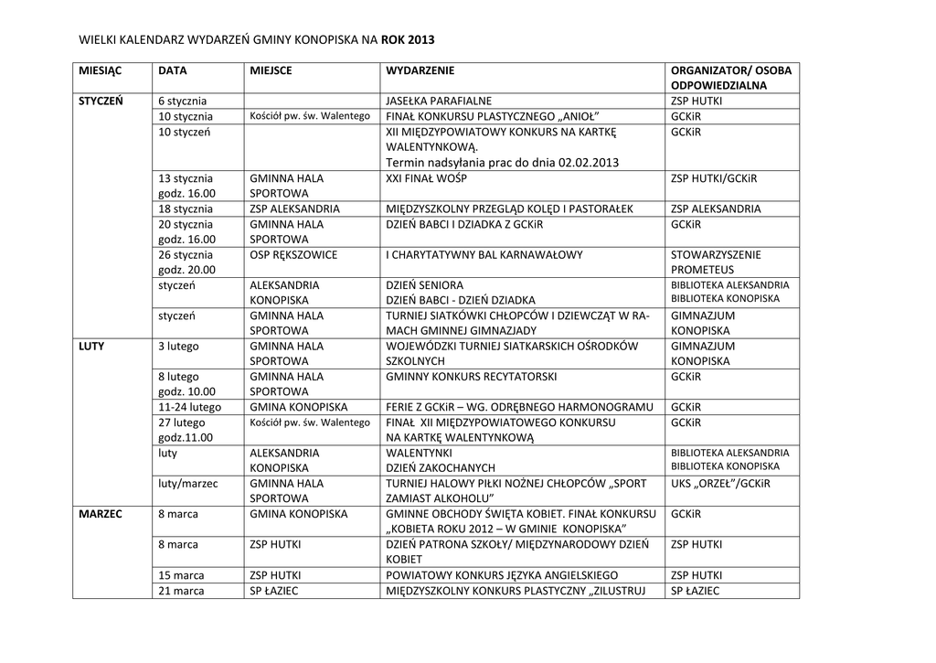 WIELKI KALENDARZ WYDARZEŃ GMINY KONOPISKA NA ROK 2013 MIESIĄC DATA MIEJSCE STYCZEŃ 6 stycznia 10 stycznia 10 styczeń Kościół pw. św. Walentego WYDARZENIE JASEŁKA PARAFIALNE FINAŁ KONKURSU PLASTYCZNEGO „ANIOŁ” XII MIĘDZYPOWIATOWY KONKURS NA KARTKĘ WALENTYNKOWĄ. ORGANIZATOR/ OSOBA ODPOWIEDZIALNA ZSP HUTKI GCKiR GCKiR Termin nadsyłania prac do dnia 02.02.2013 13 stycznia godz. 16.00 18 stycznia 20 stycznia godz. 16.00 26 stycznia godz. 20.00 styczeń styczeń LUTY 3 lutego 8 lutego godz. 10.00 11-24 lutego 27 lutego godz.11.00 luty XXI FINAŁ WOŚP ZSP HUTKI/GCKiR MIĘDZYSZKOLNY PRZEGLĄD KOLĘD I PASTORAŁEK DZIEŃ BABCI I DZIADKA Z GCKiR ZSP ALEKSANDRIA GCKiR I CHARYTATYWNY BAL KARNAWAŁOWY STOWARZYSZENIE PROMETEUS ALEKSANDRIA KONOPISKA GMINNA HALA SPORTOWA GMINNA HALA SPORTOWA GMINNA HALA SPORTOWA GMINA KONOPISKA DZIEŃ SENIORA DZIEŃ BABCI - DZIEŃ DZIADKA TURNIEJ SIATKÓWKI CHŁOPCÓW I DZIEWCZĄT W RAMACH GMINNEJ GIMNAZJADY WOJEWÓDZKI TURNIEJ SIATKARSKICH OŚRODKÓW SZKOLNYCH GMINNY KONKURS RECYTATORSKI BIBLIOTEKA ALEKSANDRIA BIBLIOTEKA KONOPISKA FERIE Z GCKiR – WG. ODRĘBNEGO HARMONOGRAMU FINAŁ XII MIĘDZYPOWIATOWEGO KONKURSU NA KARTKĘ WALENTYNKOWĄ WALENTYNKI DZIEŃ ZAKOCHANYCH TURNIEJ HALOWY PIŁKI NOŻNEJ CHŁOPCÓW „SPORT ZAMIAST ALKOHOLU” GMINNE OBCHODY ŚWIĘTA KOBIET. FINAŁ KONKURSU „KOBIETA ROKU 2012 – W GMINIE KONOPISKA” DZIEŃ PATRONA SZKOŁY/ MIĘDZYNARODOWY DZIEŃ KOBIET POWIATOWY KONKURS JĘZYKA ANGIELSKIEGO MIĘDZYSZKOLNY KONKURS PLASTYCZNY „ZILUSTRUJ GCKiR GCKiR Kościół pw. św. Walentego 8 marca ALEKSANDRIA KONOPISKA GMINNA HALA SPORTOWA GMINA KONOPISKA 8 marca ZSP HUTKI 15 marca 21 marca ZSP HUTKI SP ŁAZIEC luty/marzec MARZEC GMINNA HALA SPORTOWA ZSP ALEKSANDRIA GMINNA HALA SPORTOWA OSP RĘKSZOWICE GIMNAZJUM KONOPISKA GIMNAZJUM KONOPISKA GCKiR BIBLIOTEKA ALEKSANDRIA BIBLIOTEKA KONOPISKA UKS „ORZEŁ”/GCKiR GCKiR ZSP HUTKI ZSP HUTKI SP ŁAZIEC 27 marca marzec ZSP HUTKI marzec ZSP RĘKSZOWICE marzec marzec marzec 5 kwietnia 10 kwietnia 10 kwietnia godz. 11.00 11 kwietnia SP ŁAZIEC SP ŁAZIEC GMINNA HALA SPORTOWA ALEKSANDRIA HUTKI KONOPISKA RĘKSZOWICE ZSP HUTKI ZSP HUTKI KOŚCIÓŁ PARAFIALNY W KONOPISKCH HALA SPORTOWA 13-14 kwietnia STADION LEKKOATLETYCZNY marzec KWIECIEŃ 20 kwietnia 21 kwietnia kwiecień kwiecień kwiecień kwiecień MAJ maj 18-19 maja 23 maja 24 maja 25-26 maja „ORLIK” KONOPISKA GMINA KONOPISKA KOMPLEKS SPORTOWO – REKREACYJNY „PAJĄK” WSZYSTKIE SZKOŁY SP ŁAZIEC KONOPISKA WSZYSTKIE SZKOŁY KONOPISKA ALEJA LIPOWA ZSP HUTKI ZSP ALEKSANDRIA GMINNA HALA SPORTOWA POEZJĘ” PIERWSZY DZIEŃ WIOSNY/ DZIEŃ SAMORZĄDNOŚCI KONKURS PLASTYCZNY NA „JAJKO WIELKANOCNE” - TERMIN NADSYŁANIA PRAC – 18 MARCA 2013 DZIEŃ SAMORZĄDNOŚCI/ DZIEŃ WIOSNY/ DZIEŃ PATRONA GMINNY TURNIEJ RUCHU DROGOWEGO (KL. IV-VI) BEZPIECZNA DROGA DO SZKOŁY (KL. I-III) TURNIEJ KOSZYKÓWKI CHŁOPCÓW I DZIEWCZĄT W RAMACH GMINNEJ GIMNAZJADY DZIEŃ KOBIET KARTKI WIELKANOCNE MALOWANIE PISANEK TRADYCJE WIELKANOCNE DZIEŃ POD PATRONATEM KONSTANTEGO WOLNEGO DZIEŃ KATYŃSKI WRĘCZENIE NAGRÓD I WYRÓŻNIEŃ W KONKURSIE PLASTYCZNYM NA „JAJKO WIELKANOCNE” GMINNA IMPREZA PROFILAKTYCZNO-SPORTOWA „STOP NAŁOGOM” WYSTAWA PSÓW OFICJALNE OTWARCIE ŚCIEŻEK ROWEROWYCH KOLARSKIE MISTRZOSTWA POLSKI W PRZEŁAJU MIĘDZYNARODOWY DZIEŃ ZIEMI GMINNY KONKURS ORTOGRAFICZNY (KL. IV-VI) VI GMINNY KONKURS PRZYRODNICZY SPOTKANIE Z AUTOREM KSIĄŻEK. MALOWANIE POSTACI Z BAJEK ŚWIĘTO KONSTYTUCJI 3 MAJA DZIEŃ SAMORZĄDU (Dni Konopisk), CZWARTA PARADA ORKIESTR DĘTYCH POWIATOWY KONKURS WIEDZY O UNII EUROPEJSKIEJ DZIEŃ RODZINY MIĘDZYNARODOWY INTEGRACYJNY TURNIEJ BOCCIA „PROMETEUS CUP2013” ZSP HUTKI GCKiR ZSP RĘKSZOWICE SP ŁAZIEC SP ŁAZIEC GIMNAZJUM KONOPISKA BIBLIOTEKA ALEKSANDRIA BIBLIOTEKA HUTKI BIBLIOTEKA KONOPISKA BIBLIOTEKA RĘKSZOWICE ZSP HUTKI ZSP HUTKI GCKiR GIMNAZJUM KONOPISKA ZWIĄZEK KYNOLOGICZNY GCKiR GCKiR SP ŁAZIEC ZSP ALEKSANDRIA BIBLIOTEKA KONOPISKA GCKiR, ORKIESTRA DĘTA OSP KONOPISKA ZSP HUTKI ZSP ALEKSANDRIA STOWARZYSZENIE PROMETEUS maj maj maj maj ZSP KOPALNIA ZSP RĘKSZOWICE ZSP RĘKSZOWICE GMINA KONOPISKA EUROPEJSKI DZIEŃ JĘZYKÓW OBCYCH DZIEŃ EUROPEJSKI DZIEŃ RODZICA „POLSKA BIEGA” ZSP KOPALNIA ZSP RĘKSZOWICE ZSP RĘKSZOWICE ZSP KONOPISKA /GCKiR maj BOISKO „ORLIK” GIMNAZJUM KONOPISKA maj maj/czerwiec ALEKSANDRIA HUTKI KONOPISKA RĘKSZOWICE GMINNA HALA SPORTOWA BOISKO „ORLIK” TURNIEJ PIŁKI RĘCZNEJ CHŁOPCÓW W RAMACH GMINNEJ GIMNAZJADY TYDZIEŃ BIBLIOTEK PRZEDSTAWIENIE DLA DZIECI SPOTKANIE Z DZIEĆMI – KSIĄŻKA TWÓJ PRZYJACIEL GŁOŚNE CZYTANIE KSIĄŻEK SOŁECKI TURNIEJ SIATKÓWKI 01 czerwca 02 czerwca 03 czerwca 03 czerwca 08 czerwca 09 czerwca 15 czerwca 16 czerwca 21 czerwca 22 czerwca 26 czerwca ZSP KOPALNIA GMINA KONOPISKA ZSP HUTKI ZSP ALEKSANDRIA SP ŁAZIEC ZSP HUTKI SP JAMKI – KORZONEK ZSP ALEKSANDRIA ZSP HUTKI KONOPISKA GMINA KONOPISKA 27 czerwca czerwiec czerwiec czerwiec czerwiec czerwiec HALA SPORTOWA ZSP KOPALNIA ZSP RĘKSZOWICE ZSP RĘKSZOWICE STADION SPORTOWY KONOPISKA HUTKI STADION W KONOPISKACH maj CZERWIEC czerwiec TURNIEJ PIŁKI NOŻNEJ CHŁOPCÓW „SPORT ZAMIAST ALKOHOLU” FESTYN RODZINNY DZIEŃ DZIECKA Z GCKiR DZIEŃ SPORTU INTEGRACYJNY DZIEŃ DZIECKA ŚWIĘTO SZKOŁY ŚWIĘTO RODZINY/FESTYN FESTYN RODZINNY FESTYN RODZINNY – „ALEKSANDRIA 2013” DZIEŃ PROJEKTU EDUKACYJNEGO SOBÓTKA IMPREZA SPORTOWO – REKREACYJNA NA ZAKOŃCZENIE ROKU SZKOLNEGO DZIEŃ NAJLEPSZYCH DZIEŃ DZIECKA, DZIEŃ SPORTU DZIEŃ DZIECKA DNI PROMOCJI ZDROWIA GRAND PRIX KONOPISK LEKCJE BIBLIOTECZNE ZWIEDZANIE BIBLIOTEK.GŁOŚNE CZYTANIE OLIMPIADA BIBLIOTEKA ALEKSANDRIA BIBLIOTEKA HUTKI BIBLIOTEKA KONOPISKA BIBLIOTEKA RĘKSZOWICE GIMNAZJUM KONOPISKA UKS”ORZEŁ”/GCKiR ZSP KOPALNIA GCKiR ZSP HUTKI ZSP ALEKSANDRIA SP ŁAZIEC ZSP HUTKI SP JAMKI - KORZONEK ZSP ALEKSANDRIA ZSP HUTKI GCKiR GCKiR ZS KONOPISKA ZSP KOPALNIA ZSP RĘKSZOWICE ZSP RĘKSZOWICE ZS KONOPISKA BIBLIOTEKA KONOPISKA BIBLIOTEK