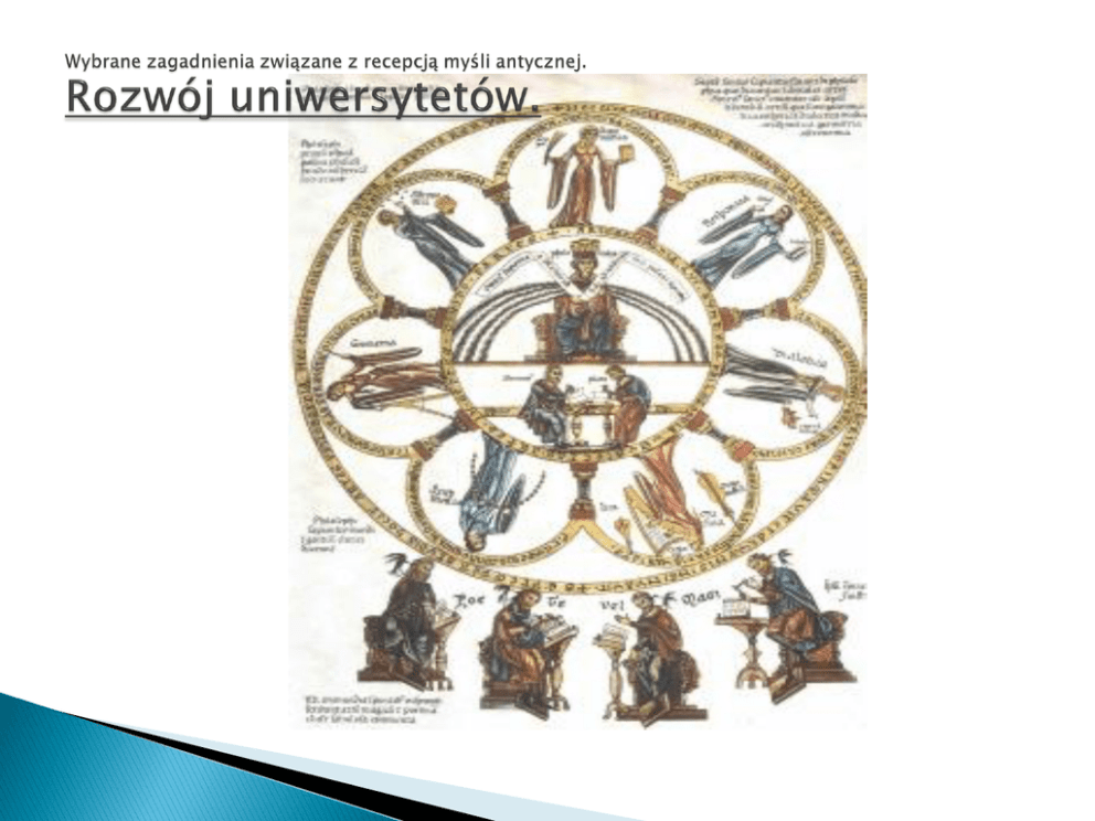 Powstanie u. to efekt chrześcijańskiej kultury europejskiej, zogniskowanej na dociekaniach poznawczych nad człowiekiem i jego działaniem w społeczności. Pierwszym u. był Uniwersytet Boloński jako wydział prawa (bez teologii, która została tam powołana dopiero w 1352 przez papieża Innocentego VI). Najsławniejszy był Uniwersytet Paryski, formujący się od XII w. jako studium filozoficzne i teologiczne oraz (nie dorównujący Paryskiemu sławą i znaczeniem) u. w Oksfordzie. Na Uniwersytecie Paryskim wzorowały się uniwersytety powstające w różnych krajach. Na czele u. – jako reprezentant władz kościelnych – stał kanclerz, który nadawał stopnie naukowe; w późniejszych wiekach funkcję tę przejmował rektor, stojący pierwotnie na czele wydziału filozoficznego. http://www.ptta.pl/pef/pdf/u/uniwersytet.pdf W. Tatarkiewicz: „[...] w szkołach uczono siedmiu tzw. »sztuk wyzwolonych« (artes liberales lub saeculares), których wykaz i program wieki średnie odziedziczyły po chrześcijańskich pisarzach z ostatniej epoki rzymskiej, Boecjuszu i innych. Sztuki wyzwolone dzieliły się na 2 grupy: grupa trzech (trivium) sztuk humanistycznych (artes triviales, sermonicales lub rationales) składała się z gramatyki, retoryki i dialektyki, a grupa czterech (quadrivium) sztuk matematyczno-przyrodniczych, realnych (artes quadriviales lub reales) składała się z arytmetyki, geometrii, astronomii i muzyki. Na tym kończył się zasób nauk świeckich (które tylko w niewielu szkołach miały zakres bardziej rozległy) i – następowała teologia. Studia świeckie były pojmowane jako propedeutyka do teologii. Wśród nauk wyzwolonych przewagę miało trivium, w trivium zaś dialektyka” (Tatarkiewicz HF I 215). Portal Królewski katedry w Chartres - postacie twórców starożytnej nauki: Priscian (gramatyka),Arystoteles (dialektyka), Cyceron (retoryka),Boethius (arytmetyka), Ptolomeusz (astronomia), Euklides (geometria) i Pitagoras (muzyka). Etymologię nazwy wywodzono (np. M. T. Cicero, De oratore libri tres,I 16, 72) z łac. słowa „liber” (wolny) i przeciwstawiano „artes, quae libero sunt dignae” (sztuki, które godne są wolnego człowieka), „artes serviles” (sztukom niewolniczym). Przeciwstawienie „artes liberales” i „artes serviles” lub „vulgares” (sztuki pospolite) wywodzi sie z kultury gr., gdzie podstawa podziału stał sie fakt, iż sztuki wyzwolone są sztukami umysłowymi, niewymagającymi wysiłku fizycznego, a stad wolnymi (w przeciwieństwie do sztuk pospolitych) od pracy mięśni rąk. 1. 2. 3. Logika odkryta została ze względu na mowę. W nauczaniu jest przedmiotowo pierwsza. Najpierw należy poznać język, następnie nauki praktyczne, bo cnota oczyszcza wzrok ducha, który musi być niezwykle przenikliwy przy uprawianiu nauk teoretycznych, by dopiero przejść do mechanicznych. Gramatyka Retoryka Dialektyka 1. 2. 3. 4. arytmetyka (podstawowy element to liczba rozumiana jako oderwana wielkość sama w sobie), muzyka (bada różne stosunki liczb — podstawowy element to harmonia), geometria (zajmuje się nieruchomą przestrzenią—podstawowy element to punkt) astronomia (zajmuje sie ruchem podstawowy element to chwila).