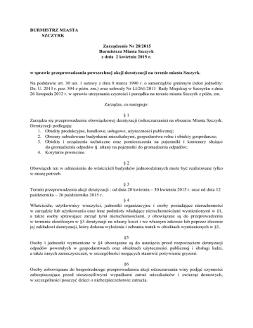 BURMISTRZ MIASTA SZCZYRK Zarządzenie Nr 28/2015 Burmistrza Miasta Szczyrk z dnia 2 kwietnia 2015 r. w sprawie przeprowadzania powszechnej akcji deratyzacji na terenie miasta Szczyrk. Na podstawie art. 30 ust. 1 ustawy z dnia 8 marca 1990 r. o samorządzie gminnym (tekst jednolity: Dz. U. 2013 r. poz. 594 z późn. zm.) oraz uchwały Nr LI/261/2013 Rady Miejskiej w Szczyrku z dnia 26 listopada 2013 r. w sprawie utrzymania czystości i porządku na terenie miasta Szczyrk z późn, zm. Zarządza, co następuje: §1 Zarządza się przeprowadzenie obowiązkowej deratyzacji (odszczurzania) na obszarze Miasta Szczyrk. Deratyzacji podlegają: 1. Obiekty produkcyjne, handlowe, usługowe, użyteczności publicznej; 2. Obszary zabudowane budynkami mieszkalnymi, gospodarstwa rolne i obiekty gospodarcze; 3. Obiekty i urządzenia techniczne oraz pomieszczenia na pojemniki i kontenery służące do gromadzenia odpadów tj. altany na pojemniki do gromadzenia odpadów; 4. Korytarze piwniczne. §2 Obowiązek ten w odniesieniu do właścicieli budynków jednorodzinnych może być realizowane tylko w miarę potrzeb. §3 Termin przeprowadzenia akcji deratyzacji : od dnia 20 kwietnia – 30 kwietnia 2015 r. oraz od dnia 12 października – 26 października 2015 r. §4 Właściciele, użytkownicy wieczyści, jednostki organizacyjne i osoby posiadające nieruchomości w zarządzie lub użytkowaniu oraz inne podmioty władające nieruchomościami wymienionymi w §1, a także osoby sprawujące zarząd tymi nieruchomościami, z obowiązane są do przeprowadzenia w terminie określonym w §3 deratyzacji na własny koszt i we własnym zakresie lub poprzez zlecenie jej zakładowi deratyzacji, który dokona wyłożenia i zebrania trutek w obiektach wymienionych w §1. §5 Osoby i jednostki wymienione w §4 obowiązane są do usunięcia przed rozpoczęciem deratyzacji odpadów powstałych w gospodarstwach oraz obiektach użyteczności publicznej i obsługi ludzi, a także innych zanieczyszczeń, w szczególności mogących stanowić pożywienie gryzoni. §6 Osoby zobowiązane do bezpośredniego przeprowadzenia akcji odszczurzania winy podjąć czynności zabezpieczające przed nieszczęśliwymi wypadkami zatruć mieszkańców i zwierząt domowych, w szczególności pouczyć dzieci o niebezpieczeństwie zatrucia. §7 Czynności deratyzacyjne należy przeprowadzić w następujący sposób: 1. W miejscach zagrożonych obecnością gryzoni, z zachowaniem koniecznej ostrożności należy wyłożyć trutkę uzupełniając ją w miarę spożycia przez gryzonie w czasie trwania akcji; 2. Miejsca wyłożenia trutek należy oznakować informacją: UWAGA TRUCIZNA !; 3. Miejsca wyłożenia trutek powinny być stale nadzorowane ; 4. Po zakończeniu akcji deratyzacji trutkę należy usunąć, natomiast w przypadku stwierdzenia obecności gryzoni trutkę należy wykładać aż do momentu kiedy przestanie być zjadana przez gryzonie; §8 Gryzonie i inne zwierzęta padłe w czasie deratyzacji oraz znalezione po jej zakończeniu powinny zostać w ciągu 12 godzin usunięte przez osoby przeprowadzające deratyzację. §9 Nadzór i kontrolę nad przeprowadzeniem deratyzacji sprawować będą przedstawiciele Urzędu Miejskiego, na których żądanie jako dowód realizacji obowiązku deratyzacji należy okazać dowód zakupu lub zlecenia zakładowi deratyzacji przeprowadzenia deratyzacji wraz z wykazem obiektów i urządzeń objętych deratyzacją. §10 Zgodnie z art. 117 Kodeksu wykroczeń kto, mając obowiązek utrzymania czystości i porządku w obrębie nieruchomości, nie wykonuje swoich obowiązków lub nie stosuje się do wskazań i nakazów wydanych przez właściwe organy w celu zabezpieczenia należytego stanu sanitarnego i zwalczania chorób zakaźnych, podlega karze grzywny do 1 500 zł albo karze nagany. §11 1. Wykonanie niniejszego zarządzenia w zakresie poinformowania o obowiązku i terminach przeprowadzenia akcji deratyzacji powierzam Kierownikowi Referatu Gospodarki Komunalnej Urbanistyki Handlu i Rolnictwa 2. Nadzór nad wykonaniem niniejszego zarządzenia powierzam Zastępcy Burmistrza Miasta Szczyrk. §12 Zarządzenie wchodzi w życie z dniem podpisania i podlega ogłoszeniu w sposób zwyczajowo przyjęty w gminie. BURMISTRZ MIASTA SZCZYRK Antoni Byrdy