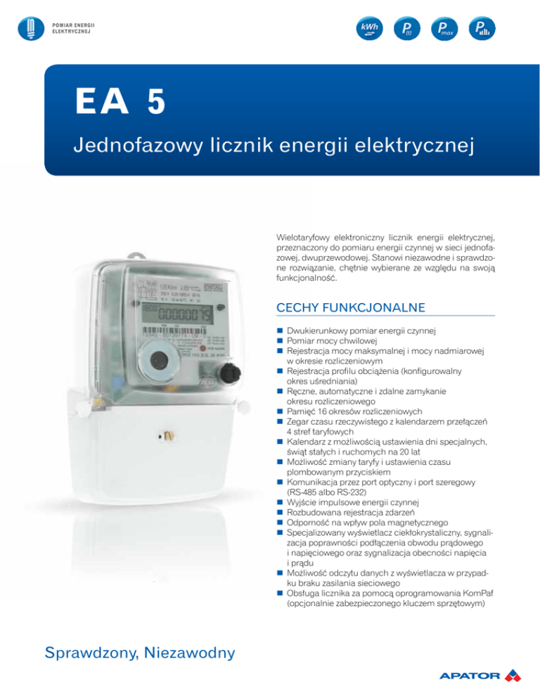 Pomiar energii elektrycznej kWh P (t) P max P EA 5 Jednofazowy licznik energii elektrycznej Wielotaryfowy elektroniczny licznik energii elektrycznej, przeznaczony do pomiaru energii czynnej w sieci jednofazowej, dwuprzewodowej. Stanowi niezawodne i sprawdzone rozwiązanie, chętnie wybierane ze względu na swoją funkcjonalność. Cechy funkcjonalne Dwukierunkowy pomiar energii czynnej Pomiar mocy chwilowej Rejestracja mocy maksymalnej i mocy nadmiarowej w okresie rozliczeniowym Rejestracja profilu obciążenia (konfigurowalny okres uśredniania) Ręczne, automatyczne i zdalne zamykanie okresu rozliczeniowego Pamięć 16 okresów rozliczeniowych Zegar czasu rzeczywistego z kalendarzem przełączeń 4 stref taryfowych Kalendarz z możliwością ustawienia dni specjalnych, świąt stałych i ruchomych na 20 lat Możliwość zmiany taryfy i ustawienia czasu plombowanym przyciskiem Komunikacja przez port optyczny i port szeregowy (RS-485 albo RS-232) Wyjście impulsowe energii czynnej Rozbudowana rejestracja zdarzeń Odporność na wpływ pola magnetycznego Specjalizowany wyświetlacz ciekłokrystaliczny, sygnalizacja poprawności podłączenia obwodu prądowego i napięciowego oraz sygnalizacja obecności napięcia i prądu Możliwość odczytu danych z wyświetlacza w przypadku braku zasilania sieciowego Obsługa licznika za pomocą oprogramowania KomPaf (opcjonalnie zabezpieczonego kluczem sprzętowym) Sprawdzony, Niezawodny Od pomiarów do zarządzania informacją Dane techniczne EA 5grn Model bezpośredni Sposób podłączenia Napięcie znamionowe Un [V] 230 Prąd odniesienia Iref [A] 5 lub 10 lub 15 Prąd maksymalny Imax [A] 40 lub 60 A lub B Klasa dokładności pomiaru en. czynnej Pobór mocy w torze prądowym (na fazę) Pobór mocy w torze napięciowym (na fazę) [VA] 0,3 [W] / [VA] <0,7 / <1,2 [kV] 4 (AC 50 Hz), 6 (udary 1,2/50 μs) [imp/kWh] typowo: 6400 Wytrzymałość elektryczna izolacji Stała impulsowania Wewnętrzny, dokładność nie gorsza niż 0,5 s/24 h w temp. 23˚C, synchronizowany sygnałem zewnętrznym. Zegar Port optyczny, port szeregowy (RS-485 albo RS-232). Prędkość transmisji konfigurowalna od 300 Bd do 9600 Bd. Obsługa protokołu PN-EN 62056-21 (IEC1107) i DLMS (opcja). Komunikacja Wyjście impulsowe dla energii czynnej. Wyjścia Zamknięcie okresu rozliczeniowego, zanik i powrót zasilania, parametryzacja, zerowanie, zdjęcie osłony skrzynki zacisków, otwarcie obudowy, wraz z wartością rejestru energii, datą i czasem zdarzenia. Wpływ pola magnetycznego z czasem i datą zdarzenia, długością czasu ingerencji i pobranej w tym czasie energii. Czas pracy licznika bez zasilania sieciowego. Rejestracja zdarzeń LCD specjalizowany, 8 cyfr, dane opisane kodami OBIS (PN-EN 62056-61). Dwie konfigurowalne listy komunikatów. Wyświetlacz od −25˚C do 55˚C lub od −40˚C do 70˚C Temperatura pracy IP 54, II kl. ochronności Obudowa PN-EN 50470-1 PN-EN 50470-3 7 76 24 7 5 Normy 155 12 EA 5 g r n / 1 rejestracja profilu obciążenia zasilacz transformatorowy rejestrator mocy nadajnik impulsów przeciążalność Imax/Iref 16 23 5,2 220 80 109 62 oznaczenie 7 8 105 130 Niniejsza publikacja ma charakter informacyjny i nie stanowi oferty w rozumieniu prawa cywilnego. Prezentowane wykonania są przykładowe i istnieje możliwość modyfikacji funkcjonalności licznika. PL.00103 | 2011 www.apator.com