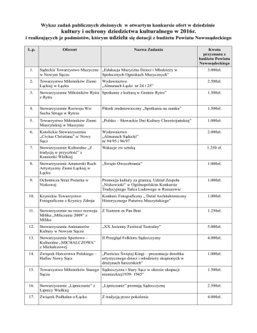 Wykaz zadań publicznych złożonych w otwartym konkursie ofert w dziedzinie kultury i ochrony dziedzictwa kulturalnego w 2016r. i realizujących je podmiotów, którym udziela się dotacji z budżetu Powiatu Nowosądeckiego L.p. Oferent Nazwa Zadania Kwota przyznana z budżetu Powiatu Nowosądeckiego 1. Sądeckie Towarzystwo Muzyczne „Edukacja Muzyczna Dzieci i Młodzieży w w Nowym Sączu Społecznych Ogniskach Muzycznych” 3.000zł. 2. Towarzystwo Miłośników Ziemi Łąckiej w Łącku 2.500zł. 3. Stowarzyszenie Miłośników Rytra Spotkanie z kulturą w Gminie Rytro” z Rytra 1.500zł. 4. Stowarzyszenie Rozwoju Wsi Sucha Struga w Rytrze Piknik średniowieczny „Spotkania na zamku” 1.500zł. 5. Towarzystwo Miłośników Ziemi Muszyńskiej w Muszynie „Polsko – Słowackie Dni Kultury Chrześcijańskiej” 1.000zł. 6. Katolickie Stowarzyszenia „Civitas Christiana” o/ Nowy Sącz Wydawnictwo „Almanach Sądecki” nr 94/95 i 96/97 2.000zł. 7. Stowarzyszenie Kulturalne „Z tradycją w przyszłość” z Kamionki Wielkiej Wakacje zw sztuką 1.250 zł. 8. Stowarzyszenie Amatorski Ruch Artystyczny Ziemi Łąckiej w Łącku „Święto Owocobrania” 1.000zł. 9. Ochotnicza Straż Pożarna w Niskowej Promocja kultury za granicą. Udział Zespołu „Niskowioki” w Ogólnopolskim Konkursie Tradycyjnego Tańca Ludowego w Rzeszowie 1.000zł. 10. Krynickie Towarzystwo Fotograficzne z Krynicy Zdroju Konkurs Fotograficzny „ Detal Architektoniczny Historycznego Państwa Muszyńskiego” 1.000zł. 11. Stowarzyszenie na rzecz rozwoju Milika „Miliczanie 2009” z Milika Z Teatrem za Pan Brat 1.250zł. 12. Stowarzyszenie Animatorów Kultury w Nowym Sączu „XX Jesienny Festiwal Teatralny” 5.000zł. 13. Stowarzyszenie Sportowo – Kulturalne „MICHALCZOWA” z Michalczowej II Przegląd Folkloru Sądecczyzny 4.000zł. 14. Związek Harcerstwa Polskiego – Hufiec Nowy Sącz „Pierściec Świętej Kingi – prezentacje dorobku artystycznego dzieci i młodzieży skupionych w drużynach harcerskich” 1.000zł. 15. Towarzystwo Miłośników Starego Sądecczyzna i Stary Sącz w okresie okupacji Sącza niemieckiej1939- 1945” 1.500zł. 16. Stowarzyszenie „Lipniczanie” z Lipnicy Wielkiej „Lipniczanie” promują Sądecczyznę 2.500zł. 17. Związek Podhalan o/Łącko Z tradycją przez pokolenia 4.000zł. Wydawnictwo „Almanach Łącki nr 24 i 25” 18. Krynickie Towarzystwo Społeczno - Kulturalne „Moderato” z Krynicy Zdroju X Małopolskie Spotkania Taneczne. 3.000zł. 19. Stowarzyszenie Regionalne „Kowalnia” ze Stróż Taniec, Śpiew, Muzyka Pogórzan wykonane przez Zespoły Regionalne „Kowalnia” i „Mała Kowalnia” promocja Sądecczyzny 2.500zł. 20. Towarzystwo Przyjaciół Żegiestowa z Żegiestowa IV Festiwal Piosenki Turystycznej BABIE LATO w Żegiestowie Zdroju 2.000zł. 21. Starosądeckie Stowarzyszenie Jubileusz 10-lecia Zespołu Regionalnego Miłośników i Tradycji „Malowana „Starosądeczanie” - wydruk okolicznościowych Skrzynia” ze Starego Sącza folderów i realizacja nagrania filmowego CD 2.000zł. 22. Parafia Prawosławna pw. Św. „V Festiwal Chórów Cerkiewnych” Włodzimierza w Krynicy - Zdroju 3.000zł. 23. Stowarzyszenie Kół Gospodyń Wiejskich w Łososinie Dolnej Tradycja od wieków do dziś 3.000zł. 24. Stowarzyszenie Koło Gospodyń Wiejskich wsi Stadła „My są baby jakich mało” 2.000zł. 25. Stowarzyszenie Turystyczne Wsi Retro z Ptaszkowej Świerze spojrzenie na folklor w regionie – organizacja festynu i przeglądu KGW promującego dorobek kulturalny Sądecczyzny. 2.000zł. 26. Stowarzyszenie Razem dla Kultury z Klęczan Promocja Kultura Sądeckiej poprzez udział Zespołu Dziecięco – Młodzieżowego „Mała Helenka” w Międzynarodowym Festiwalu „Paralia 2016”w Grecji 3.000zł. 27. Stowarzyszenia „Mogilskie Cisy” „Świat jest teatrem, aktorami ludzie” z Mogilna 2.500zł. 28. Stowarzyszenie „Beskidzkie Więzi” z Nowego Sącza 2.000zł. XII Turniej Gmin Beskidy Sądeckiego Wykaz zadań publicznych złożonych w otwartym konkursie ofert w dziedzinie kultury i ochrony dziedzictwa kulturalnego w 2016r. i realizujących je podmiotów, którym nie udziela się dotacji z budżetu Powiatu Nowosądeckiego L.p. Oferent Nazwa Zadania Uzasadnienie nieudzielania dotacji Nie spełnia wymogów formalnych 1. UKS „Arcus – Krynica z Krynicy Zdroju Warsztat Łucznictwa Tradycyjnego 2. Fundacja Beskidzka Zima w Klęczanach Na psa urok Oferta nie uzyskała wymaganej ilości punktów 3. „Promyczek” - Wydawnictwo Dzieci i Młodzieży z Nowego Sącz „Z muzyką przez pokolenia - od tradycji do nowoczesności” Oferta nie uzyskała wymaganej ilości punktów 4. Związek Harcerstwa Polskiego – Hufiec Nowy Sącz Warsztaty z Harcerską Piosenką – Pod naszym niebem na naszej ziemi Oferta nie uzyskała wymaganej ilości punktów 5. Związek Miłośników Muzyki z Nowego Sącza Koncert w wykonaniu Orkiestry Dętej Parafii Św. Wawrzyńca w Nowym Sącz Oferta nie uzyskała wymaganej ilości punktów 6. Zespól Regionalny „Żegiestowska Wiem więcej, lepiej rozumiem – poznaj tradycyjną Bukowina” kulturę spiskiego pogranicza” 7. Polskie Towarzystwo Gimnastyczne '” Sokół – Świat Pracy” z Tarnowa Rekonstrukcja działań partyzanckich na Sądecczyźnie ze szczególnym uwzględnieniem terenów Ziemi Grybowskiej. 8. Fundacja Widowisk Masowych i Show -Programów z Paszyna Międzynarodowy Festiwal Teatru Ukraińskiego „Wschód - Zachód” Oferta nie uzyskała wymaganej ilości punktów 9. Fundacja Żyj Aktywniej z Nowego Sącza Smaki Galicji Oferta nie uzyskała wymaganej ilości punktów 10. Polskie Towarzystwo Historyczne Wydanie książki O/ Nowy Sącz 11. Stowarzyszenie Korzenie i Skrzydła z Rdziostowa Sądeckie AhotoArt Oferta nie uzyskała wymaganej ilości punktów 12. Krynickie Stowarzyszenie Przyjaciół z Bad Sooden – Allendorf z Krynicy Zdroju Katalog „Wyroby regionalne – Tradycj