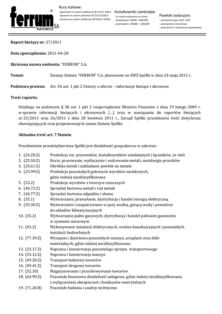 Rury stalowe: -zgrzewane ze szwem wzdłużnym Ø 114,3÷ 406,4 -spawane ze szwem spiralnym Ø 273,0÷1016,0 -spawane ze szwem wzdłużnym Ø 559,0÷ 2020,0 Kształtowniki zamknięte: - ze szwem wykonane na zimno - kwadratowe: 90x90 - 300x300 - prostokątne: 100x80 – 320x200 Powłoki izolacyjne: - zewnętrzne typu 3LPE, 3LPP - wewnętrzne cementowe - wewnętrzne i zewnętrzne epoksydowe Raport bieżący nr: 27/2011 Data sporządzenia: 2011-04-28 Skrócona nazwa emitenta: ʺFERRUMʺ S.A. Temat: Zmiany Statutu ʺFERRUMʺ S.A. planowane na ZWZ Spółki w dniu 24 maja 2011 r. Podstawa prawna: Art. 56 ust. 1 pkt 2 Ustawy o ofercie – informacje bieżące i okresowe Treść raportu: Działając na podstawie § 38 ust. 1 pkt 2 rozporządzenia Ministra Finansów z dnia 19 lutego 2009 r. w sprawie informacji bieżących i okresowych […] oraz w nawiązaniu do raportów bieżących nr 25/2011 oraz 26/2011 z dnia 28 kwietnia 2011 r., Zarząd Spółki przedstawia treść dotychczas obowiązujących oraz proponowanych zmian Statutu Spółki: Aktualna treść art. 7 Statutu Przedmiotem przedsiębiorstwa Spółki jest działalność gospodarcza w zakresie: 1. 2. 3. 4. (24.20.Z) (25.50.Z) (25.61.Z) (25.99.Z) 5. 6. 7. 8. 9. (22.2) (46.72.Z) (46.77.Z) (35.1) (35.30.Z) 10. (35.2) 11. (43.2) 12. (77.39.Z) 13. 14. 15. 16. 17. 18. (33.17.Z) (33.12.Z) (49.20.Z) (49.41.Z) (52.10) (64.99.Z) 19. (71.20.B) Produkcja rur, przewodów, kształtowników zamkniętych i łączników, ze stali Kucie, prasowanie, wytłaczanie i walcowanie metali; metalurgia proszków Obróbka metali i nakładanie powłok na metale Produkcja pozostałych gotowych wyrobów metalowych, gdzie indziej niesklasyfikowana Produkcja wyrobów z tworzyw sztucznych Sprzedaż hurtowa metali i rud metali Sprzedaż hurtowa odpadów i złomu Wytwarzanie, przesyłanie, dystrybucja i handel energią elektryczną Wytwarzanie i zaopatrywanie w parę wodną, gorącą wodę i powietrze do układów klimatyzacyjnych Wytwarzanie paliw gazowych; dystrybucja i handel paliwami gazowymi w systemie sieciowym Wykonywanie instalacji elektrycznych, wodno-kanalizacyjnych i pozostałych instalacji budowlanych Wynajem i dzierżawa pozostałych maszyn, urządzeń oraz dóbr materialnych, gdzie indziej niesklasyfikowane Naprawa i konserwacja pozostałego sprzętu transportowego Naprawa i konserwacja maszyn Transport kolejowy towarów Transport drogowy towarów Magazynowanie i przechowywanie towarów Pozostała finansowa działalność usługowa, gdzie indziej niesklasyfikowana, z wyłączeniem ubezpieczeń i funduszów emerytalnych Pozostałe badania i analizy techniczne 20. (62.01.Z) 21. (62.09.Z) 22. (68.20.Z) 23. (42.99.Z) 24. (42.2) 25. (25.11.Z) 26. (24.10.Z) Działalność związana z oprogramowaniem Pozostała działalność usługowa w zakresie technologii informatycznych i komputerowych Wynajem i zarządzanie nieruchomościami własnymi lub dzierżawionymi Roboty związane z budową pozostałych obiektów inżynierii lądowej i wodnej gdzie indziej niesklasyfikowane Roboty związane z budową rurociągów, linii telekomunikacyjnych i elektroenergetycznych Produkcja konstrukcji metalowych i ich części Produkcja surówki, żelazostopów, żeliwa i stali oraz wyrobów hutniczych. Proponowana treść art. 7 Statutu Przedmiotem przedsiębiorstwa Spółki jest działalność gospodarcza w zakresie: 1. 2. 3. 4. (24.20.Z) (25.50.Z) (25.61.Z) (25.99.Z) 5. 6. 7. 8. 9. (22.2) (46.72.Z) (46.77.Z) (35.1) (35.30.Z) 10. (35.2) 11. (43.2) 12. (77.39.Z) 13. 14. 15. 16. 17. 18. (33.17.Z) (33.12.Z) (49.20.Z) (49.41.Z) (52.10) (64.99.Z) 19. (71.20.B) 20. (62.01.Z) 21. (62.09.Z) 22. (68.20.Z) 23. (42.99.Z) 24. (42.2) 25. (25.11.Z) 26. (24.10.Z) 27. (64.20.Z) Produkcja rur, przewodów, kształtowników zamkniętych i łączników, ze stali Kucie, prasowanie, wytłaczanie i walcowanie metali; metalurgia proszków Obróbka metali i nakładanie powłok na metale Produkcja pozostałych gotowych wyrobów metalowych, gdzie indziej niesklasyfikowana Produkcja wyrobów z tworzyw sztucznych Sprzedaż hurtowa metali i rud metali Sprzedaż hurtowa odpadów i złomu Wytwarzanie, przesyłanie, dystrybucja i handel energią elektryczną Wytwarzanie i zaopatrywanie w parę wodną, gorącą wodę i powietrze do układów klimatyzacyjnych Wytwarzanie paliw gazowych; dystrybucja i handel paliwami gazowymi w systemie sieciowym Wykonywanie instalacji elektrycznych, wodno-kanalizacyjnych i pozostałych instalacji budowlanych Wynajem i dzierżawa pozostałych maszyn, urządzeń oraz dóbr materialnych, gdzie indziej niesklasyfikowane Naprawa i konserwacja pozostałego sprzętu transportowego Naprawa i konserwacja maszyn Transport kolejowy towarów Transport drogowy towarów Magazynowanie i przechowywanie towarów Pozostała finansowa działalność usługowa, gdzie indziej niesklasyfikowana, z wyłączeniem ubezpieczeń i funduszów emerytalnych Pozostałe badania i analizy techniczne Działalność związana z oprogramowaniem Pozostała działalność usługowa w zakresie technologii informatycznych i komputerowych Wynajem i zarządzanie nieruchomościami własnymi lub dzierżawionymi Roboty związane z budową pozostałych obiektów inżynierii lądowej i wodnej gdzie indziej niesklasyfikowane Roboty związane z budową rurociągów, linii telekomunikacyjnych i elektroenergetycznych Produkcja konstrukcji metalowych i ich części Produkcja surówki, żelazostopów, żeliwa i stali oraz wyrobów hutniczych Działalność holdingów finansowych 28. (66.1) 29. (68.10.Z) 30. (68.20.Z) 31. (68.3) 32. (69.20.Z) 33. (70.2) 34. (70.10.Z) 35. (73.20.Z) 36. (82.1) Działalność wspomagająca usługi finansowe, z wyłączeniem ubezpieczeń i funduszów emerytalnych Kupno i sprzedaż nieruchomości na własny rachunek Wynajem i zarządzanie nieruchomościami własnymi lub dzierżawionymi Działalność związana z obsługą rynku nieruchomości wykonywana na zlecenie Działalność rachunkowo-księgowa; doradztwo