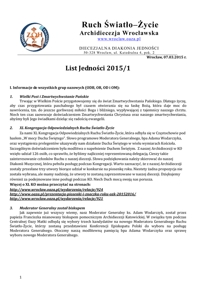 Ruch Światło–Życie Archidiecezja Wrocławska www.wroclaw.oaza.pl DIECEZJALNA DI AKONI A JEDNOŚCI 50-328 Wr ocł a w, ul . Ka t edra ln a 4, pok. 2 Wrocław, 07.03.2015 r. List Jedności 2015/1 I. Informacje do wszystkich grup oazowych (ODB, OR, OD i OM): 1. Wielki Post i Zmartwychwstanie Pańskie Trwając w Wielkim Poście przygotowujemy się do świat Zmartwychwstania Pańskiego. Dlatego życzę, aby czas przygotowania paschalnego był czasem otwierania się na łaskę Bożą, która daje moc do nawrócenia, tzn. do jeszcze gorliwszej miłości Boga i bliźniego, wypływającej z tajemnicy naszego chrztu. Niech ten czas zaowocuje doświadczeniem Zmartwychwstania Chrystusa oraz naszego zmartwychwstania, abyśmy byli Jego świadkami dzieląc się radością ewangelii. 2. XL Kongregacja Odpowiedzialnych Ruchu Światło-Życie Za nami XL Kongregacja Odpowiedzialnych Ruchu Światło-Życie, która odbyła się w Częstochowie pod hasłem „W mocy Ducha Świętego”. Słowo programowe Moderatora Generalnego, bpa Adama Wodarczyka, oraz wystąpienia prelegentów ukazywały nam działanie Ducha Świętego w wielu wymiarach Kościoła. Szczególnym doświadczeniem była modlitwa o napełnienie Duchem Świętym. Z naszej Archidiecezji w KO wzięło udział 126 osób, co sprawiło, że byliśmy najliczniej reprezentowaną delegacją. Cieszy takie zainteresowanie członków Ruchu z naszej diecezji. Słowa podziękowania należy skierować do naszej Diakonii Muzycznej, która pełniła posługę podczas Kongregacji. Warto zaznaczyć, że z naszej Archidiecezji zostały przesłane trzy utwory biorące udział w konkursie na piosenkę roku. Niestety żadna propozycja nie została wybrana, ale mamy nadzieję, że utwory te zostaną zaprezentowane w naszej diecezji. Dziękujemy również za podejmowane inne posługi podczas KO. Niech Duch mocą swoją nas porusza. Więcej o XL KO można przeczytać na stronach: http://www.wroclaw.oaza.pl/wydarzenia/relacje/924 http://www.oaza.pl/prezentacja-piosenki-i-znaczka-roku-ozk-20152016/ http://www.wroclaw.oaza.pl/wydarzenia/relacje/921 3. Moderator Generalny został biskupem Jak zapewnie już wszyscy wiemy, nasz Moderator Generalny ks. Adam Wodarczyk, został przez papieża Franciszka mianowany biskupem pomocniczym Archidiecezji Katowickiej. W związku tym podczas Centralnej Oazy Matki odbędą się wybory trzech kandydatów na nowego Moderatora Generalnego Ruchu Światło-Życie, którzy zostaną przedstawieni Konferencji Episkopatu Polski do wyboru na posługę Moderatora Generalnego. Otoczmy naszą modlitewną pamięcią bpa Adama Wodarczyka oraz sprawę wyboru nowego Moderatora Generalnego. 1 4. Rejonowe Dni Wspólnoty a) Kilka słów o Rejonowych Dniach Wspólnoty W związku z tym, że pojawiają się nowe propozycje dotyczące RDW, pragnę zwrócić uwagę na kilka ważnych spraw związanych z organizacją dni wspólnoty. Tematem ostatniego RDW było „Budować jedność” i przypominaliśmy sobie idee Dni Wspólnoty wg myśli Założyciela, próbujmy teraz każdy kolejny RDW przeżyć zgodnie z Jego wizją. Pamiętajmy, że nasze posłuszeństwo w tym względzie, nawet jeśli nam coś nie pasuje, a może tym bardziej wtedy – pokazuje na ile chcemy zachować charyzmat Światło–Życie, gdyż jak Ojciec mówił: „tylko pełnia elementów gwarantuje owocność tej drogi.” Szczególnie ważne podczas RDW jest zachowanie jedności grup wiekowych i stanowych (musi być wzajemne ubogacanie), konieczna jest jedność merytoryczna i formalna (wierność materiałom przygotowanym przez Centrum Ruchu oraz punktom programu – każdy ma swoje znaczenie), niezbędna jest także jedność czasowa (przeżywanie RDW w tych samych terminach w całym Ruchu!). Terminy RDW są zaplanowane i znane od września, warto je więc sobie zapisać i nie planować niczego innego na ten czas. Czasem wypadnie coś naprawdę wyjątkowego, niezależnego od nas, ale wyjątki nie mogą być normą. Nie zapominajmy o podstawowej zasadzie Ruchu – zasadzie krążenia: każda grupa, wspólnota, także rejon, jest wezwana do przeżywania RDW w ramach przewidzianego dla tej grupy Zespołu (we Wrocławiu funkcjonują obecnie trzy zespoły do RDW). Niektóre osoby, szczególnie z DK, zwracają uwagę na to, że są to Rejonowe Dni Wspólnoty i że dotyczą one rejonu. To prawda, ale pojęcie "rejon" w odniesieniu do RDW dotyczy Rejonu Ruchu Światło-Życie, w skład którego powinny wchodzić wspólnoty różnych stanów, a nie Rejonu Domowego Kościoła jako takiego. W najbliższym czasie będziemy chcieli podzielić wrocławskie zespoły do RDW na mniejsze. Na pewno nie pomagają w udziale w RDW, dodatkowe DW w rejonach, parafiach itp. Trudno też się zgodzić z jednostronnymi decyzjami wspólnot, kręgów i rejonów o nieuczestniczeniu w RDW. Ufamy, że pragnienie zachowania charyzmatu jako dziedzictwa, które zostawił nam Sł. B. ks. Franciszek Blachnicki, jest w nas większe niż własne pomysły na „nasze lepsze rozwiązania”. b) Najbliższy Rejonowy Dzień Wspólnoty planowany jest na 15 marca br. TEMAT: "Kochać ubogich - dzielić się sobą i posiadanymi dobrami". ZESPÓŁ I: Data: 14 marca (sobota) 2015 r. Miejsce: parafia pw. św. Antoniego przy al. Kasprowicza 26 we Wrocławiu (początek w sali katechetycznej z lewej strony kościoła) PROGRAM: 10.00 – Zawiązanie wspólnoty, przedstawienie grup 10.30 – Prezentacje diakonii: miłosierdzia, wyzwolenia i życia 11.00 – Konferencja 11.30 – Spotkania w grupach 12.30 – Namiot Spotkania 13.15 – Eucharystia 14.15 – Agapa ZESPÓŁ II: Data: 15 marca (niedziela) 2015 TEMAT: "Kochać ubogich - dzielić się sobą i posiadanymi dobrami" Miejsce: Centrum Duszpasterskie Archidiecezji Wrocławskiej – ul. Katedralna 4 („czwórka”), s.13 i 15 PROGRAM: 14.30 Zawiązanie wspólnoty 15.00 Eucharystia (kościół śś. Apostołów Piotra i Pawła) 16.00 Uwielbienie Pana Jezusa i Namiot Spotkania 16.30 Konferen