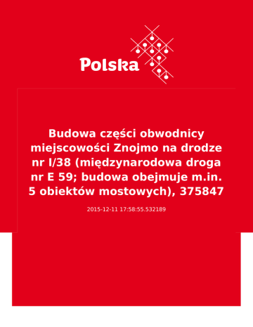 Budowa części obwodnicy miejscowości Znojmo na drodze nr I/38 (międzynarodowa droga nr E 59; budowa obejmuje m.in. 5 obiektów mostowych), 375847 2015-12-11 17:58:55.532189 2 3 Ta oferta nie stanowi informacji handlowej Dane kontaktowe Ředitelství silnic a dálnic ČR (Zarząd dróg i autostrad RCz) 145 05 Praha Na Pankráci 56 Czechy Osoba kontaktowa Bc. Veronika Humlová - ŘSD ČR, Závod Brno, Šumavská 33, 602 00 Brno [email protected] Tel: +420 549133546, faks +420 549133484 Opis przedmiotu zamówienia Przetarg nr 375847 Miejsce realizacji/dostaw: Gmina Kuchařovice, powiat Znojmo droga nr I/38 (kraj południowomorawski) Forma przetargu: otwarty nieograniczony Miejsce, forma i cena wykupienia materiałów przetargowych: W sprawie wykupu materiałów przetargowych należy się skontaktować z osobą kontaktową jn. Inne istotne informacje (np.Źródło finansowania): Przewidywana cena zamówienia wynosi 355 280 000 CZK (tj. ok. 55,74 mln PLN). Szczegółowe informacje znajdują się w dokumentacji przetargowej oraz na stronie: https://vestnikverejnychzakazek.cz/pl/Form/Display/635361. Kaucja w wysokości 5 mln CZK (tj. ok. 784 tys. PLN) Nabywcy z zagranicy ● Czechy 4 CPV ● Roboty budowlane w zakresie obwodnic Forma przetargu Międzynarodowy Kraj Czechy Zakres przetargu Osoba kontaktowa z WPHI (nadawca informacji o przetargu): Krzysztof Dębiec (tel.: +420 271 732 342; e-mail: [email protected]). Adres WWW vestnikverejnychzakazek.cz/pl/Form/Display/635361 Termin składania ofert 22.12.2015 Ważna od 01.12.2015 Branże Transport i logistyka, Budownictwo, 5