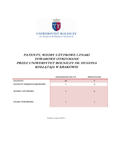 PATENTY, WZORY UŻYTKOWE I ZNAKI TOWAROWE OTRZYMANE PRZEZ UNIWERSYTET ROLNICZY IM. HUGONA KOŁŁĄTAJA W KRAKOWIE ZGŁOSZONE DO UP PRZYZNANE PATENTY 26 5 PATENTY MIĘDZYNARODOWE 1 0 WZORY UŻYTKOWE 1 6 ZNAKI TOWAROWE 1 1 Kraków, wrzesień 2014 r. PATENTY Nr patentu Nazwa i opis patentu Twórcy Sposób otrzymywania skrobi o wysokiej zawartości frakcji nanocząsteczkowej, zwłaszcza skrobi ziemniaczanej. 212248 Sposób otrzymywania skrobi o wysokiej zawartości frakcji nanocząsteczkowej, zwłaszcza skrobi ziemniaczanej, która w postaci zawiesiny lub proszku może być przeznaczona do różnorodnego wykorzystania przemysłowego. Produkt ten jest pożądany zarówno w przetwórstwie spożywczym jako modyfikator gęstości, do mikrokapsułkowania dodatków do żywności, itp., jak też w zastosowaniach niespożywczych jako składnik tworzyw sztucznych, klejów, farb, kosmetyków, farmaceutyków, itp. Joanna Szymońska Piotr Tomasik Jan Sidor Sposób wytwarzania preparatu kosmetycznego zawierającego koncentrat białek serwatkowych. 217398 Przedmiotem wynalazku jest sposób wytwarzania preparatu kosmetycznego zawierającego koncentrat białek serwatkowych, pozwalający uzyskać produkty o właściwościach emulsji. Rozwiązanie według wynalazku pozwala na uzyskanie preparatu kosmetycznego w wyniku połączenia fazy wodnej zawierającej koncentrat białek serwatkowych z fazą olejową zawierającą oliwę, olej z pestek winogron, wosk pszczeli, lanolinę, masło kakaowe. Proces wytwarzania składa się z następujących po sobie etapów łączenia poszczególnych składników, ich podgrzewania, mieszania, a następnie chłodzenia i homogenizacji. W efekcie otrzymuję się stabilną emulsje typu woda w oleju. Małgorzata Tabaszewska Tadeusz Grega Elżbieta Sikora Zastosowanie biopolimerów w procesie fermentacji etanolowej brzeczek i nastawów wysokocukrowych w produkcji napojów alkoholowych, zwłaszcza miodów Paweł Sroka pitnych. 215214 Przedmiotem wynalazku jest zastosowanie biopolimerów w procesie fermentacji etanolowej brzeczek i nastawów wysokocukrowych w produkcji napojów alkoholowych, wykorzystującej w procesie fermentacji specjalnie dobrane szczepy drożdży lub innych mikroorganizmów. Zasadniczą cecha wynalazku jest nowe zastosowanie biopolimeru jako środka intensyfikującego proces fermentacji, a także przyspieszającego proces fermentacji. Rozwiązanie to jest szczególnie przydatne zwłaszcza przy produkcji miodów pitnych dla zwiększenia stopnia odfermentowania brzeczki i uzyskania wyższego stężenia etanolu w produkcie. Tadeusz Tuszyński Paweł Satora Tomasz Tarko Aleksandra DudaChodak Płyn do higieny intymnej na bazie serwatki. 215278 Przedmiotem wynalazku jest receptura płynu serwatkowego do higieny intymnej kobiet stanowiącego probiotyczny produkt pomocny w profilaktyce zakażeń układu moczowopłciowego. W warunkach przemysłowych serwatka jest produktem ubocznym, powstającym w dużych ilościach podczas produkcji sera. Zaletą serwatkowego płynu do higieny intymnej jest fakt, że zawiera on naturalną serwatkę, która jest źródłem białek serwatkowych, laktozy, soli mineralnych oraz kwasu mlekowego. Preparat kosmetyczny do pielęgnacji skóry. Przedmiotem wynalazku jest skład preparatu do pielęgnacji skóry. Zaletą tego preparatu jest fakt, ze zawiera wyłącznie surowce pochodzenia naturalnego, w tym koncentrat białek serwatkowych, który posiada właściwości bakteriobójcze, bakteriostatyczne, przeciwgrzybiczne, przeciwwirusowe, przeciwnowotworowe i nawilżające skórę. Dorota Kalicka Tadeusz Grega Małgorzata Tabaszewska Tadeusz Grega Elżbieta Sikora WZORY UŻYTKOWE Nr prawa ochronnego Nazwa i opis wzoru użytkowego Twórcy Termometr ściółkowo- powietrzny, zwłaszcza drobiarski. 64881 Przedmiotem wzoru użytkowego jest elektroniczny termometr ściółkowo-powietrzny do pomiaru temperatury powierzchni ściółki i temperatury otaczającego powietrza w warstwie przyściółkowej. Termometr, zwłaszcza drobiarski , znajduje szczególne zastosowanie w budynkach dla drobiu do oceny warunków termicznych w strefie odchowu ptaków utrzymywanych na ściółce. Wacław Bieda Jarowit Szumski Urządzenie ciągnikowe do wywierania kontrolowanego nacisku na grunt. 66822 Przedmiotem wzoru użytkowego jest przewoźne urządzenie ciągnikowe do wywierania kontrolowanego nacisku na grunt lub do wyznaczania współczynnika zagęszczalności gruntu. Rozwiązanie charakteryzuje się tym, że urządzenie posiada korpus nośny w formie spawanej konstrukcji co pozwala wykonywać duża ilość pomiarów bez potrzeby wykonania wysiłku związanego z przenoszeniem urządzenia. Rozwiązanie może być wykorzystane przede wszystkim przez przedsiębiorstwa zajmujące się budową i modernizacja Mariusz Kormanek infrastruktury drogowej oraz w budownictwie, rolnictwie czy leśnictwie. Pojemnik do pobierania próbek gleby o nienaruszonej strukturze. 67028 Przedmiotem wzoru użytkowego jest przyrząd w postaci pojemnika do pobierania próbek gleby o nienaruszonej strukturze, przeznaczony do badania współczynnika filtracji w warunkach laboratoryjnych. Pojemnik składa się z trzech cylindrów które połączone są rozłącznie i szczelnie ze sobą za pomocą taśmy nieprzepuszczalnej i samoprzylepnej. Pobrana za pomocą takiego przyrządu próbka ma nienaruszoną strukturę. Jarosław Kucza Anna Ilek Urządzenie do monitorowania profilu lub powierzchni terenu, zwłaszcza drogi gruntowej. 67271 Przedmiotem wzoru użytkowego jest przestawne urządzenie do monitorowania profilu lub powierzchni terenu, umożliwiające wykonywanie stacjonarnych pomiarów terenowych. Celem rozwiania jest opracowanie prostego, przestawnego urządzenia pomiarowego opartego o punktowe skanowanie powierzchni z użyciem standardowego dalmierza laserowego, pozwalającego na określenie profilu lub powierzchni drogi. Badaniu mogą być poddawane: drogi asfaltowe, drogi gruntowe nieutwardzane 