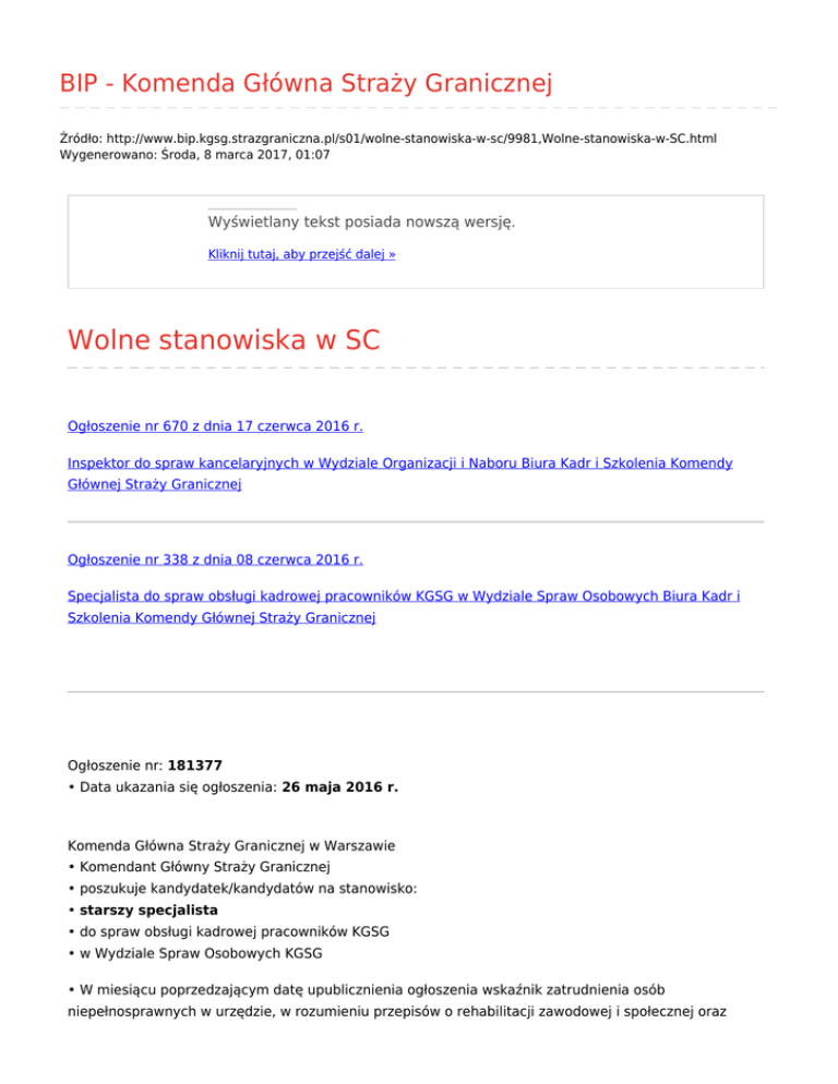 BIP - Komenda Główna Straży Granicznej Źródło: http://www.bip.kgsg.strazgraniczna.pl/s01/wolne-stanowiska-w-sc/9981,Wolne-stanowiska-w-SC.html Wygenerowano: Środa, 8 marca 2017, 01:07 Wyświetlany tekst posiada nowszą wersję. Kliknij tutaj, aby przejść dalej » Wolne stanowiska w SC Ogłoszenie nr 670 z dnia 17 czerwca 2016 r. Inspektor do spraw kancelaryjnych w Wydziale Organizacji i Naboru Biura Kadr i Szkolenia Komendy Głównej Straży Granicznej Ogłoszenie nr 338 z dnia 08 czerwca 2016 r. Specjalista do spraw obsługi kadrowej pracowników KGSG w Wydziale Spraw Osobowych Biura Kadr i Szkolenia Komendy Głównej Straży Granicznej Ogłoszenie nr: 181377 • Data ukazania się ogłoszenia: 26 maja 2016 r. Komenda Główna Straży Granicznej w Warszawie • Komendant Główny Straży Granicznej • poszukuje kandydatek/kandydatów na stanowisko: • starszy specjalista • do spraw obsługi kadrowej pracowników KGSG • w Wydziale Spraw Osobowych KGSG • W miesiącu poprzedzającym datę upublicznienia ogłoszenia wskaźnik zatrudnienia osób niepełnosprawnych w urzędzie, w rozumieniu przepisów o rehabilitacji zawodowej i społecznej oraz zatrudnianiu osób niepełnosprawnych, jest niższy niż 6%. Wymiar etatu: 1 • Liczba stanowisk pracy: 1 Adres urzędu Komenda Główna Straży Granicznej al. Niepodległości 100 02-514 Warszawa Miejsce wykonywania pracy: • Warszawa Zakres zadań wykonywanych na stanowisku pracy: • przygotowywanie dokumentacji związanej z nawiązaniem, trwaniem i rozwiązaniem stosunku pracy, w celu przekazania tych dokumentów pracownikom oraz komórce wypłacającej świadczenia finansowe, • opiniowanie i przygotowywanie propozycji rozwiązań problemów z zakresu prawa pracy i ubezpieczeń społecznych, w celu dostarczenia konkretnych rozwiązań, • ustalanie uprawnień do nagród jubileuszowych i innych świadczeń oraz przygotowywanie decyzji w tych sprawach, w celu przekazania komórkom wypłacającym świadczenia finansowe informacji na temat wysokości należnych świadczeń, • prowadzenie i aktualizowanie książki obsady etatowej, przestrzeganie limitu zatrudnienia w przydzielonych komórkach organizacyjnych, w celu nadzoru nad obsadzaniem stanowisk oraz przekazywanie miesięcznych rozliczeń etatowo - ewidencyjnych komórce finansowej, w celu dostarczenia aktualnych informacji, • koordynowanie procesu sporządzania ocen pracowniczych (pierwsza ocena w służbie cywilnej, ocena okresowa w służbie cywilnej), indywidualnych programów rozwoju zawodowego oraz organizowanie służby przygotowawczej pracowników przydzielonych komórek organizacyjnych, w celu zapewnienia zgodności z obowiązującymi regulacjami prawnymi, • dokonywanie okresowych kontroli kart ewidencji czasu pracy pracowników, w celu zapewnienia nadzoru nad prawidłowością prowadzenia przedmiotowej dokumentacji w przydzielonych komórkach organizacyjnych, a także prowadzenie kart urlopowych i absencji pracowników przydzielonych komórek organizacyjnych, w celu dostarczenia aktualnych informacji, • zakładanie i prowadzenie teczek akt osobowych pracowników przydzielonych komórek organizacyjnych, w celu przechowywania dokumentacji pracowniczej, • przygotowywanie i kompletowanie dokumentacji w sprawach emerytalno - rentowych, w celu przekazania jej do Zakładu Ubezpieczeń Społecznych. Warunki pracy Warunki dotyczące charakteru pracy na stanowisku i sposobu wykonywania zadań - praca samodzielna administracyjno - biurowa, - praca w siedzibie urzędu. Miejsce i otoczenie organizacyjno-techniczne stanowiska pracy - dojścia i dojazdy do budynku są utwardzone, - stanowisko pracy zlokalizowane jest na parterze budynku, - niepełne przystosowanie budynku dla osób niepełnosprawnych: brak podjazdów przy wejściu głównym, korytarze dzielone drzwiami z samozamykaczami, - infrastruktura budynku: sanitariaty, korytarze, winda, klatki schodowe, schody, - praca przy oświetleniu naturalnym i sztucznym, - praca przy monitorze ekranowym powyżej 4 godz., - narzędzia i materiały do pracy: komputer, drukarka, kserokopiarka, faks, niszczarka, skaner, - brak specjalistycznych urządzeń umożliwiających pracę osobom niewidomym, niedosłyszącym oraz głuchoniemym. Wymagania związane ze stanowiskiem pracy niezbędne • wykształcenie: wyższe • doświadczenie zawodowe/staż pracy: 3 lata doświadczenia zawodowego w obsłudze kadrowej pracowników • pozostałe wymagania niezbędne: • pozytywne przejście procedury sprawdzającej, w celu uzyskania poświadczenia bezpieczeństwa osobowego uprawniającego do dostępu do informacji niejawnych, • znajomość przepisów prawa pracy oraz systemu ubezpieczeń społecznych, • znajomość ustawy o służbie cywilnej, umiejętność stosowania przepisów prawa w praktyce, • obsługa komputera, • komunikatywność, terminowość, skrupulatność. wymagania dodatkowe • wykształcenie: prawnicze, administracyjne lub pokrewne. Wymagane dokumenty i oświadczenia: • życiorys i list motywacyjny • oświadczenie o wyrażeniu zgody na przetwarzanie danych osobowych do celów rekrutacji • oświadczenie o korzystaniu z pełni praw publicznych • oświadczenie o nieskazaniu prawomocnym wyrokiem za umyślne przestępstwo lub umyślne przestępstwo skarbowe • kopie dokumentów potwierdzających wykształcenie • kopia dokumentu potwierdzającego posiadanie polskiego obywatelstwa lub oświadczenie o posiadaniu obywatelstwa polskiego • kopie dokumentów potwierdzających wymagane doświadczenie zawodowe. Inne dokumenty i oświadczenia • kopia dokumentu potwierdzającego niepełnosprawność - w przypadku kandydatek/kandydatów, zamierzających skorzystać z pierwszeństwa w zatrudnieniu w przypadku, gdy znajdą się w gronie najlepszych kandydatek/kandydatów • kopie innych dokumentów potwierdzających posiadane kwalifikacje. Termin składania dokumentów: 15-06-2016 Miejsce składania dokumentów: Biu