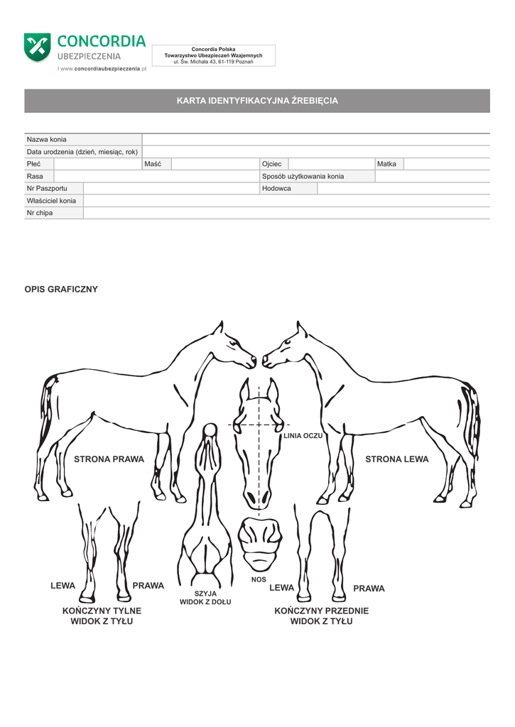 Concordia Polska Towarzystwo Ubezpieczeń Wzajemnych ul. Św. Michała 43, 61-119 Poznań karta identyfikacyjna źrebięcia Nazwa konia Data urodzenia (dzień, miesiąc, rok) Płeć Maść Ojciec Matka Rasa Sposób użytkowania konia Nr Paszportu Hodowca Właściciel konia Nr chipa OPIS GRAFICZNY linia oczu strona prawa lewa prawa kończyny tylne widok z tyłu strona lewa nos szyja widok z dołu lewa prawa kończyny przednie widok z tyłu Concordia Polska Towarzystwo Ubezpieczeń Wzajemnych ul. Św. Michała 43, 61-119 Poznań karta identyfikacyjna źrebięcia 1. Stopień odżywienia źrebięcia 2. Czy źrebię było leczone weterynaryjnie □ nie □ tak Jeżeli tak, proszę podać powód, nazwę choroby. Kiedy źrebię było leczone i z jakim skutkiem? 3. Badanie w stanie spoczynku – oddech częstotliwość charakter – puls częstotliwość charakter – temperatura – stan płuc – stan serca 4. Czy są oznaki – zaburzeń oddechu □ nie □ tak, jakie? – zaburzeń neurologicznych □ nie □ tak, jakie? – zaburzeń ruchu (np. Ataxia) □ nie □ tak, jakie? – wad oczu (zrost soczewki, wtręty) □ nie □ tak, jakie? – wad/braków uzębienia □ nie □ tak, jakie? – inne (np. zmiany w okolicach pępka) □ nie □ tak, jakie? 5. Czy można zauważyć zmiany w kończynach wskazujące na przebyte lub obecne choroby? □ nie □ tak, jakie? 6. Czy źrebię kuleje? □ nie □ tak, jakie? 7. Czy są widoczne wady postawy lub chodu? □ nie □ tak, jakie? 8. Czy źrebię wykazuje oznaki wskazujące na wcześniejsze skalecznenia, leczenie lub przebyte operacje? □ nie □ tak, jakie? 9. Czy można zauważyć zmiany zewnętrznych organów płciowych? (np. wnętrostwo) □ nie □ tak, jakie? 10. Czy po przeprowadzonym badaniu można stwierdzić że źrebię jest zdrowe, wolne od wad i narowów? □ nie □ tak, jakie? uwagi dOdAtkOwe Badanie nie wykazało żadnych odchyleń w stanie zdrowotnym zwierzęcia, ani objawów chorobowych. Badanie przeprowadzono Podpis Ubezpieczającego Podpis i pieczęć lekarza weterynarii w dnia godz. Lekarz przeprowadzający badanie nie odpowiada za ukryte wady konia, które nie mogły być ujawnione powyższym badaniem.