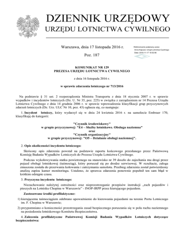 DZIENNIK URZĘDOWY URZĘDU LOTNICTWA CYWILNEGO Warszawa, dnia 17 listopada 2016 r. Elektronicznie podpisany przez: Anna Kajczuk; Urząd Lotnictwa Cywilnego Poz. 187 Data: 2016-11-17 10:52:56 KOMUNIKAT NR 129 PREZESA URZĘDU LOTNICTWA CYWILNEGO z dnia 16 listopada 2016 r. w sprawie zdarzenia lotniczego nr 713/2016 Na podstawie § 31 ust. 2 rozporządzenia Ministra Transportu z dnia 18 stycznia 2007 r. w sprawie wypadków i incydentów lotniczych (Dz. U. Nr 35, poz. 225) w związku z zarządzeniem nr 14 Prezesa Urzędu Lotnictwa Cywilnego z dnia 14 grudnia 2006 r. w sprawie wprowadzenia klasyfikacji grup przyczynowych zdarzeń lotniczych (Dz. Urz. ULC Nr 10, poz. 43) ogłasza się, co następuje: 1. Incydent lotniczy, który wydarzył się w dniu 24 kwietnia 2016 r. na samolocie Embraer 170, klasyfikuję do kategorii: "Czynnik środowiskowy" w grupie przyczynowej: "E4 – Służby lotniskowe. Obsługa naziemna" oraz "Czynnik organizacyjny" w grupie przyczynowej: "O5 – Działanie obsługi naziemnej". 2. Opis okoliczności incydentu lotniczego: Skrócony opis zdarzenia powstał na podstawie raportu końcowego przesłanego przez Państwową Komisję Badania Wypadków Lotniczych do Prezesa Urzędu Lotnictwa Cywilnego. Podczas wykołowywania statku powietrznego na stanowisko nr 39 doszło do zajechania mu drogi przez pojazd obsługi lotniskowej (taśmociąg), który poruszał się po drodze serwisowej. W rezultacie, załoga zmuszona została do przerwania kołowania i zatrzymania samolotu. Przebieg zdarzenia został potwierdzony analizą zapisu kamer monitoringu. Ustalono, że sprawca zdarzenia ponownie popełnił ten sam błąd w krótkim odstępie czasu. 3. Przyczyna incydentu lotniczego: Niezachowanie należytej ostrożności oraz nieprzestrzeganie przepisów instrukcji „ruch pojazdów i pieszych na Lotnisku Chopina w Warszawie” - INOP-IRPP przez kierującego pojazdem. Zastosowane środki profilaktyczne: 1) kierującemu taśmociągiem odebrano upoważnienie do kierowania pojazdami na terenie Portu Lotniczego im. F. Chopina w Warszawie; 2) przypomniano o konieczności przestrzegania zasad bezpiecznego poruszania się w polu ruchu naziemnego na posiedzeniu lotniskowego Komitetu Bezpieczeństwa. 4. Zalecenia profilaktyczne Państwowej Komisji Badania Wypadków Lotniczych dotyczące bezpieczeństwa: Dziennik Urzędowy Urzędu Lotnictwa Cywilnego –2– Poz. 187 Państwowa Komisja Badania Wypadków Lotniczych po zapoznaniu się ze zgromadzonymi w trakcie badania zdarzenia materiałami nie wydała zaleceń dotyczących bezpieczeństwa. p.o. Prezesa Urzędu Lotnictwa Cywilnego Piotr Samson